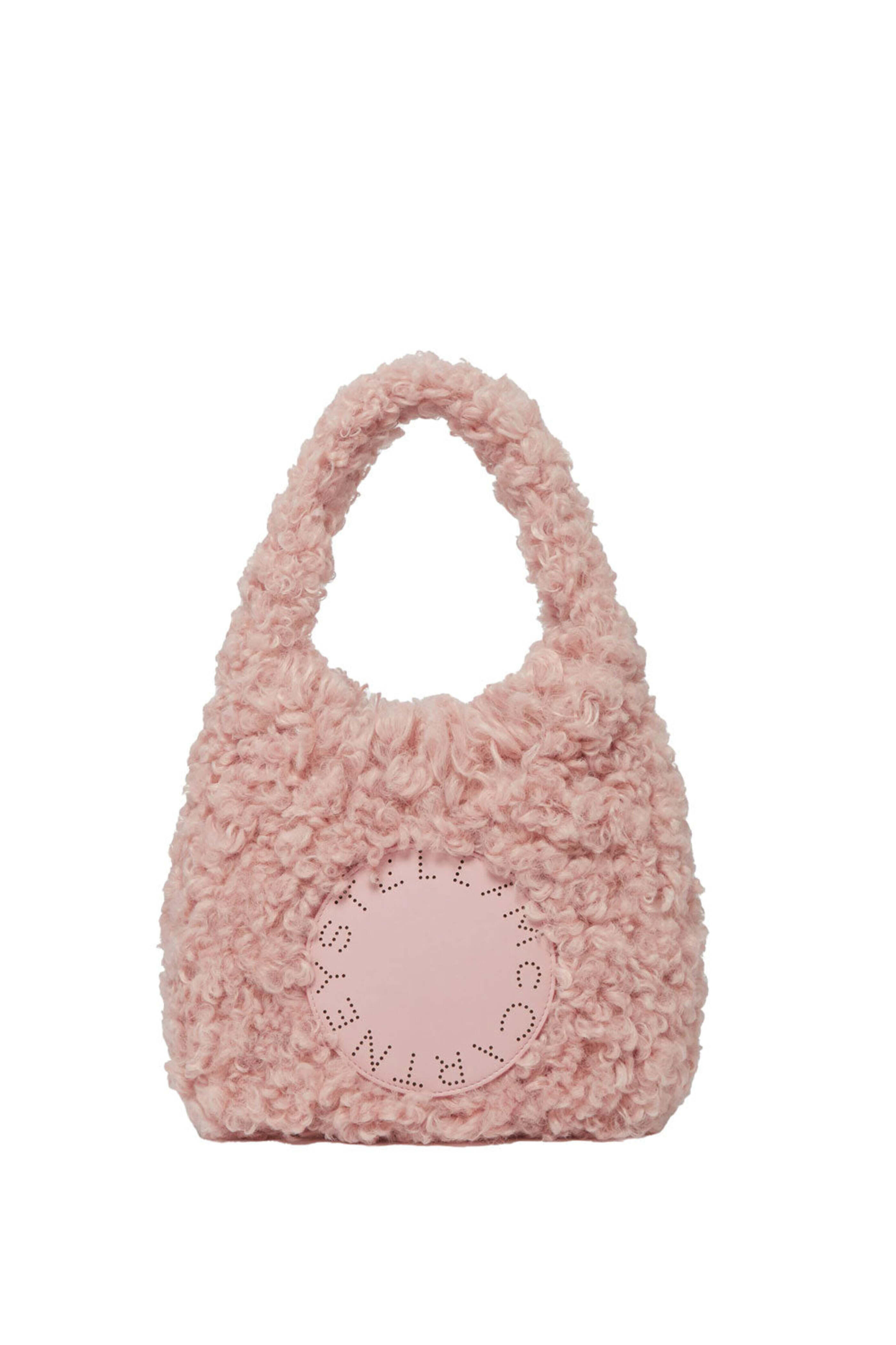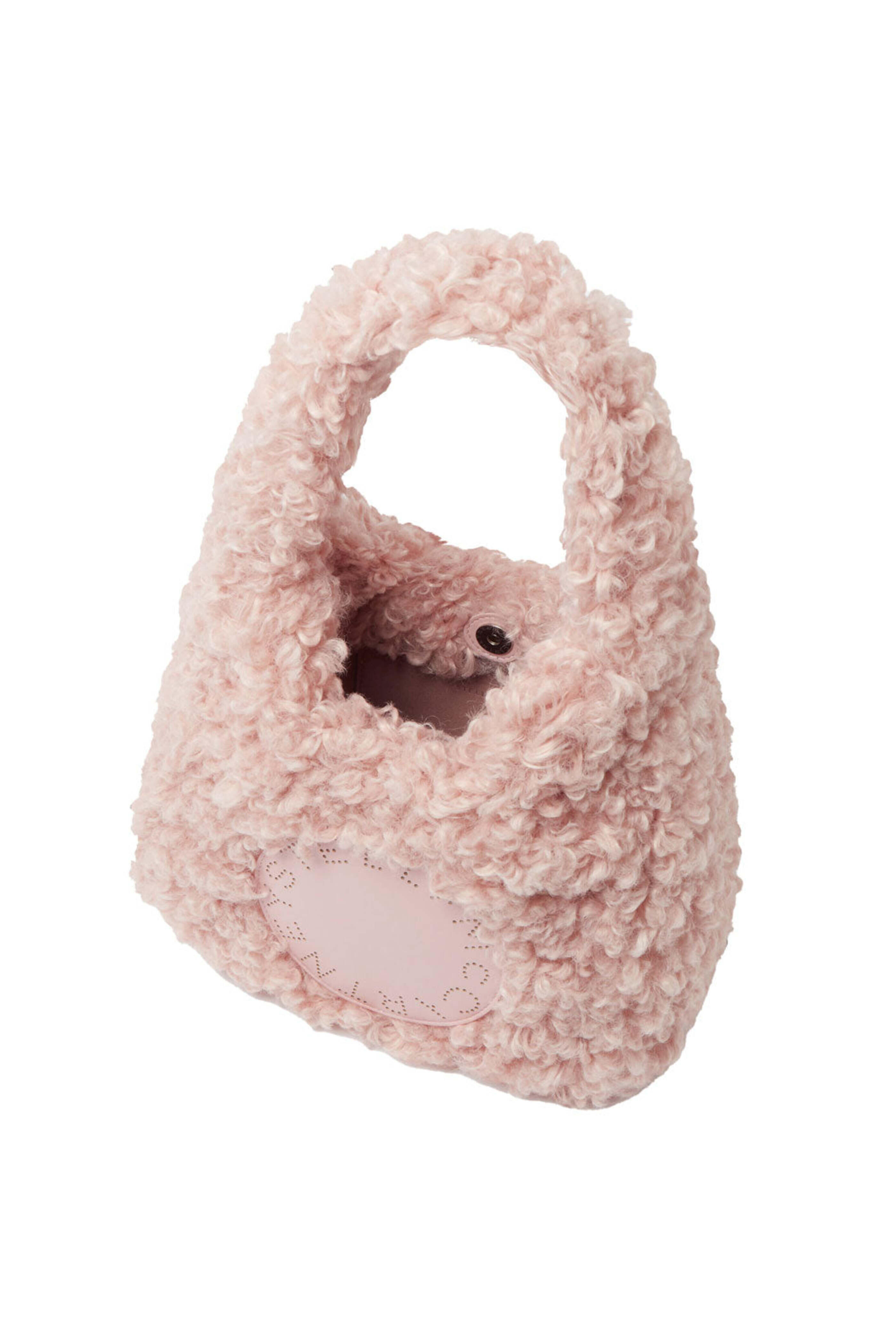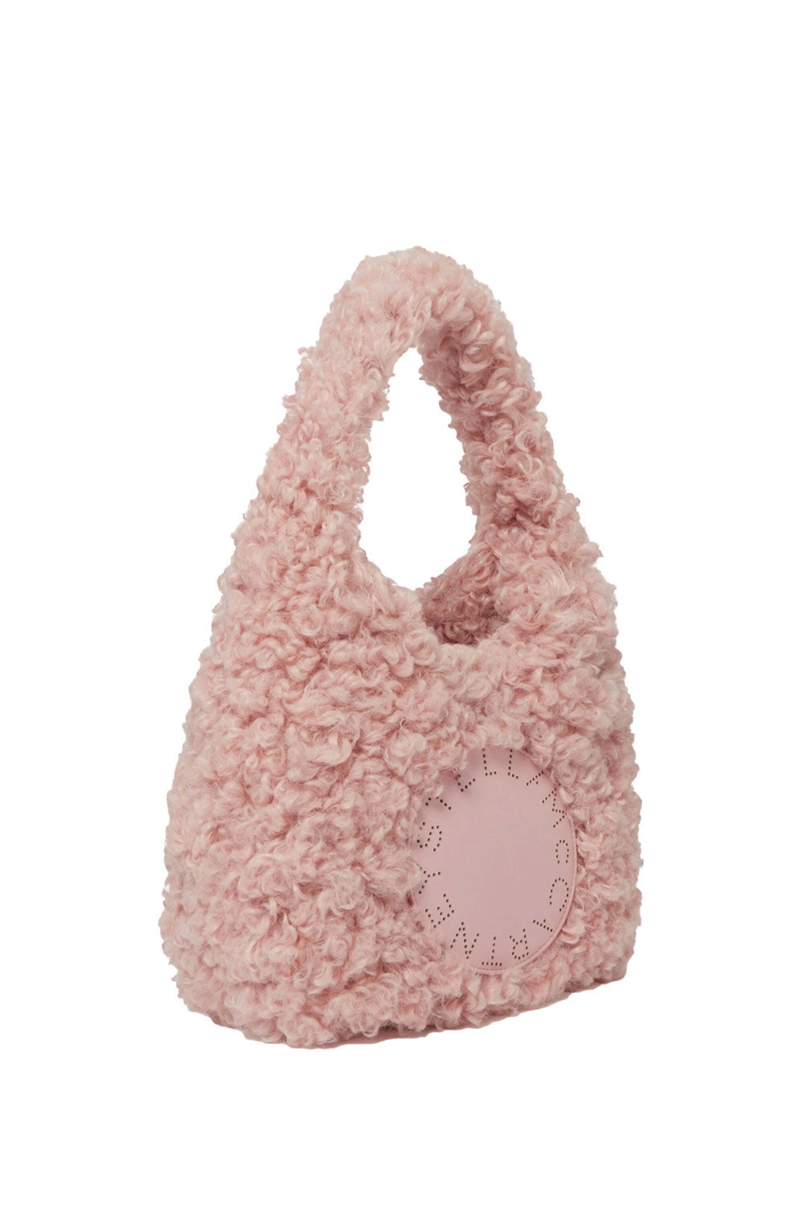 Stella McCartney Small Hobo Plush Teddy Tote in Dusty Rose. Open top. Magnetic clasps. Vegan plush teddy. Perforated logo on front. One top handle. Detachable pouch. One main compartment. 9.64 x 7.48 x 1.18. 8.26 handle drop. Made in Italy.