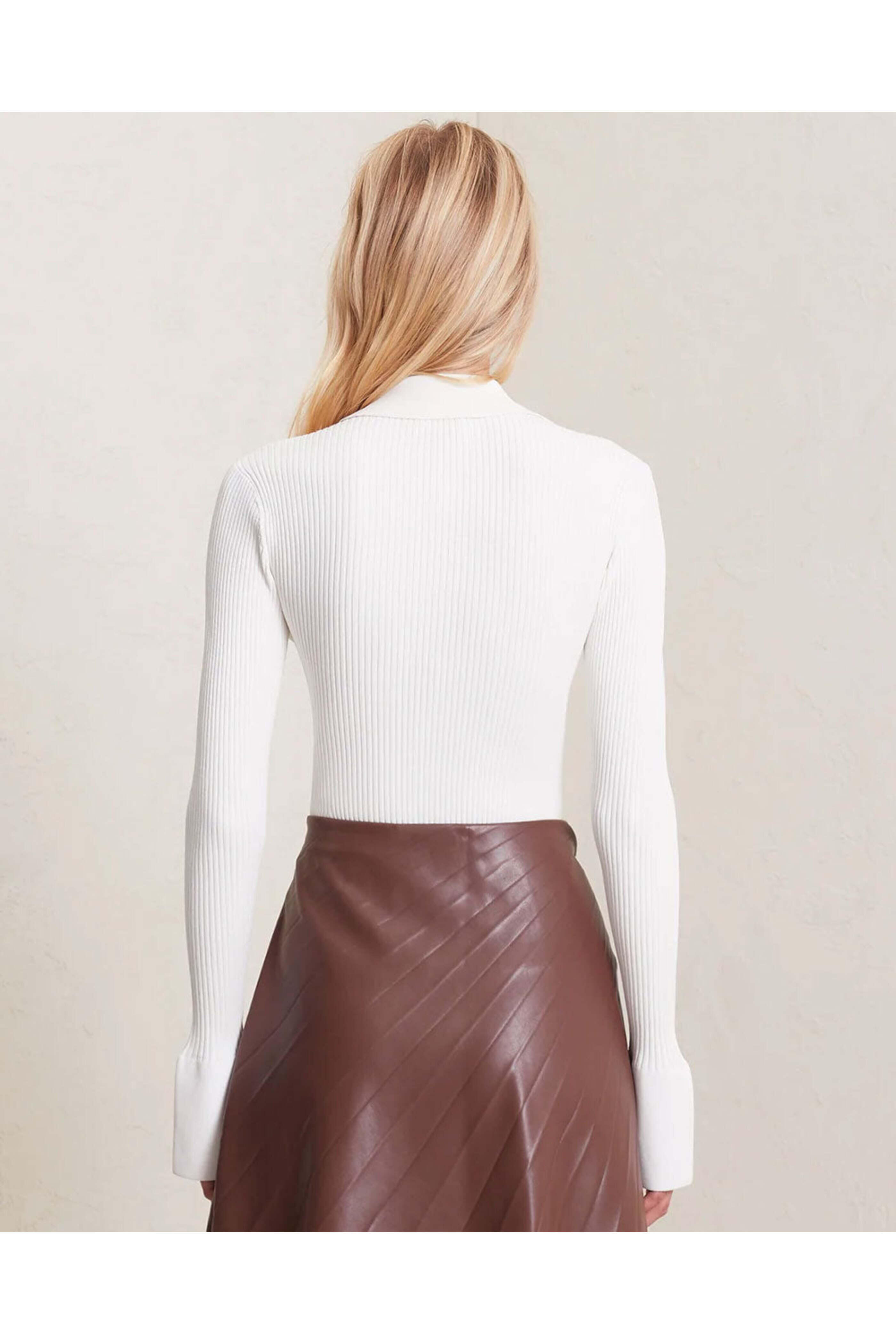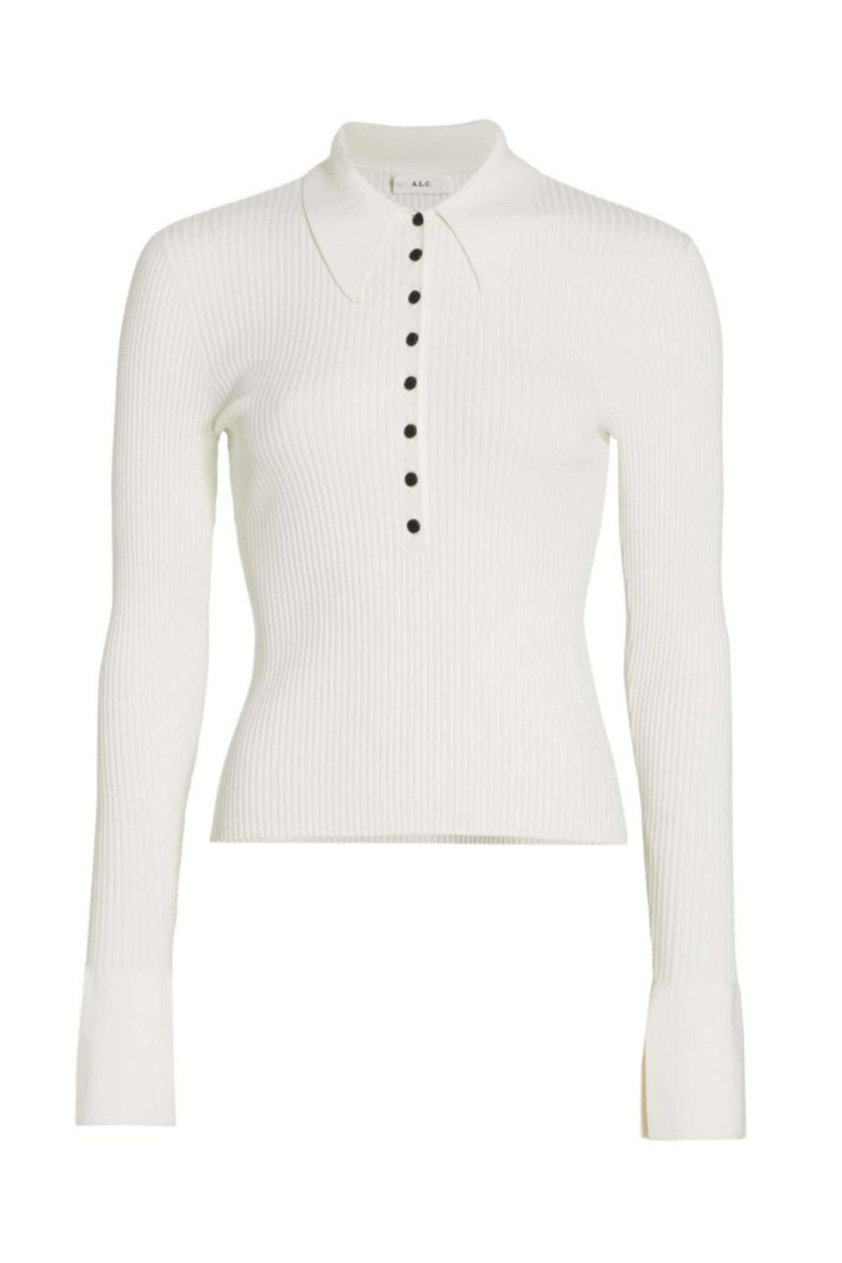 A.L.C. Winter White Eleanor Top. Pointed polo collar. Long bell sleeves; split cuffs. Partial placket button up closure at front. Slim fit. Ribbed knit fabrication. 83% Viscose, 17% Polyester.