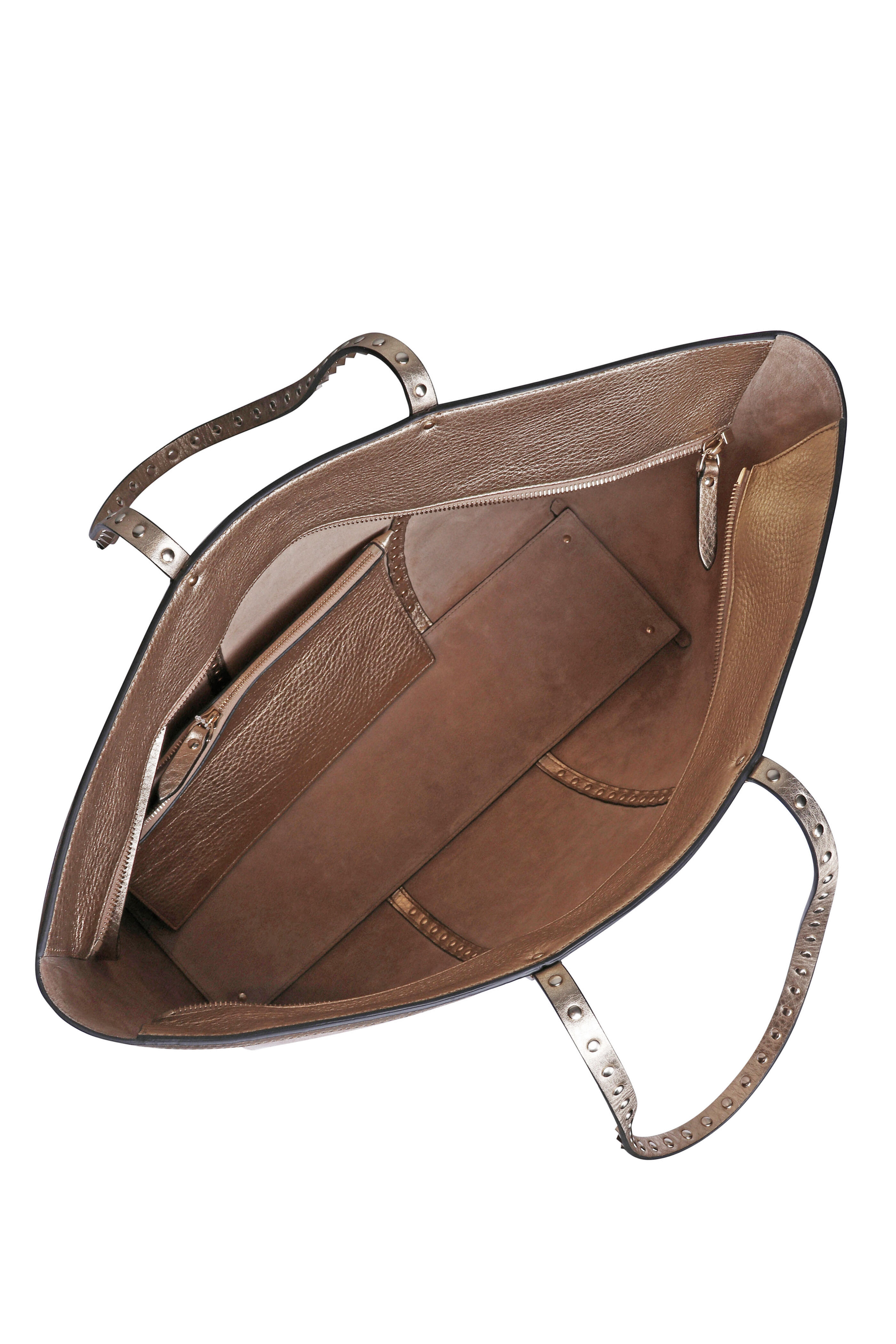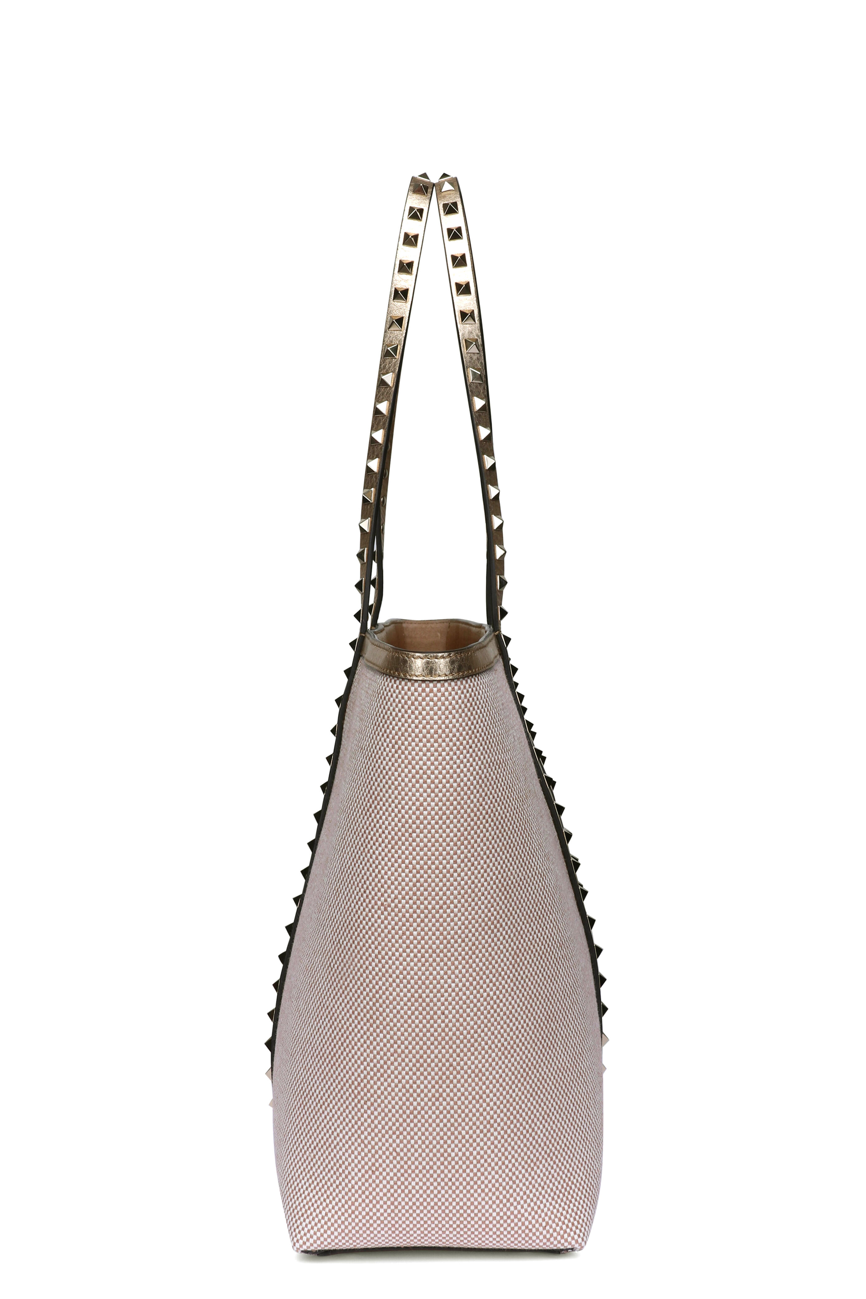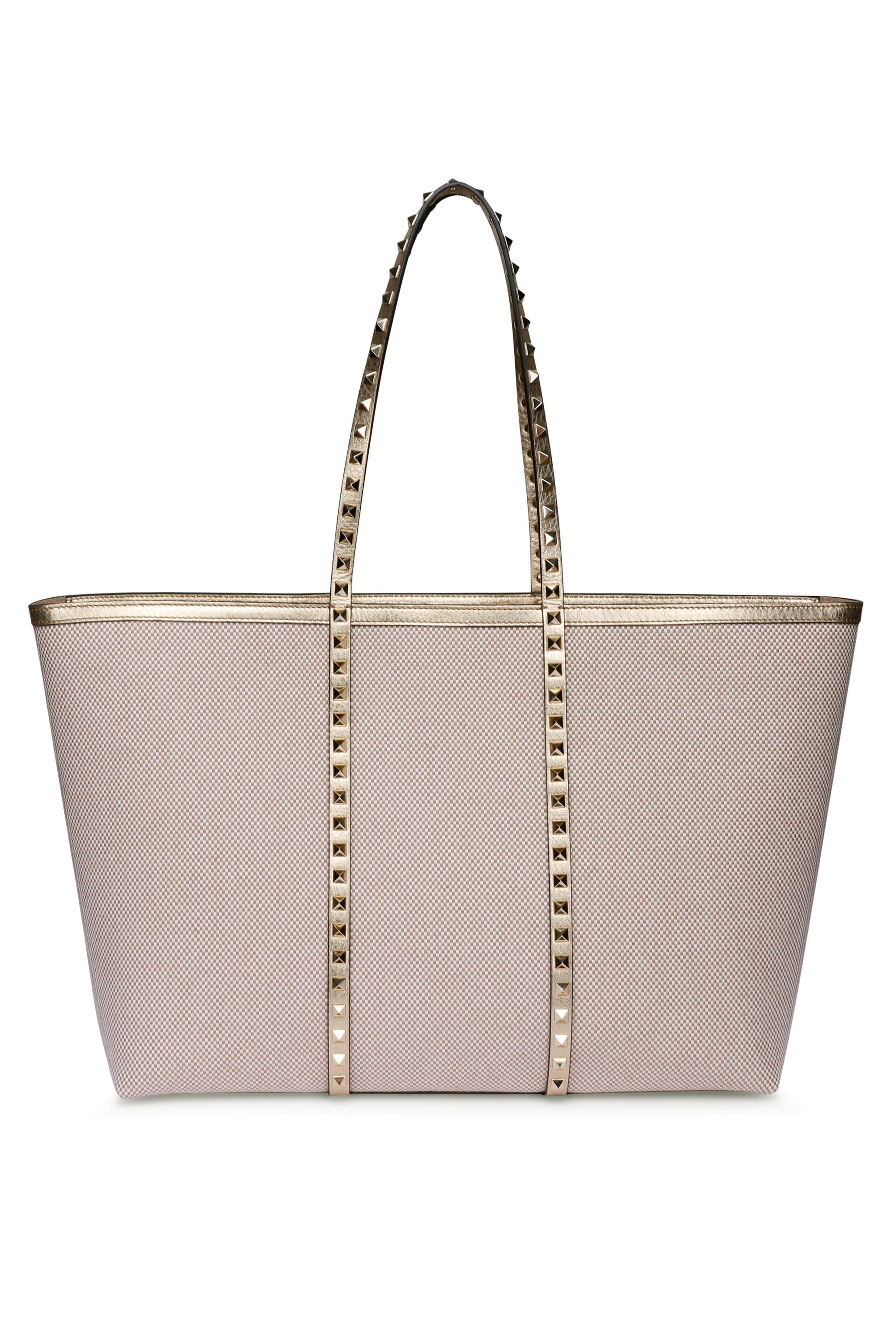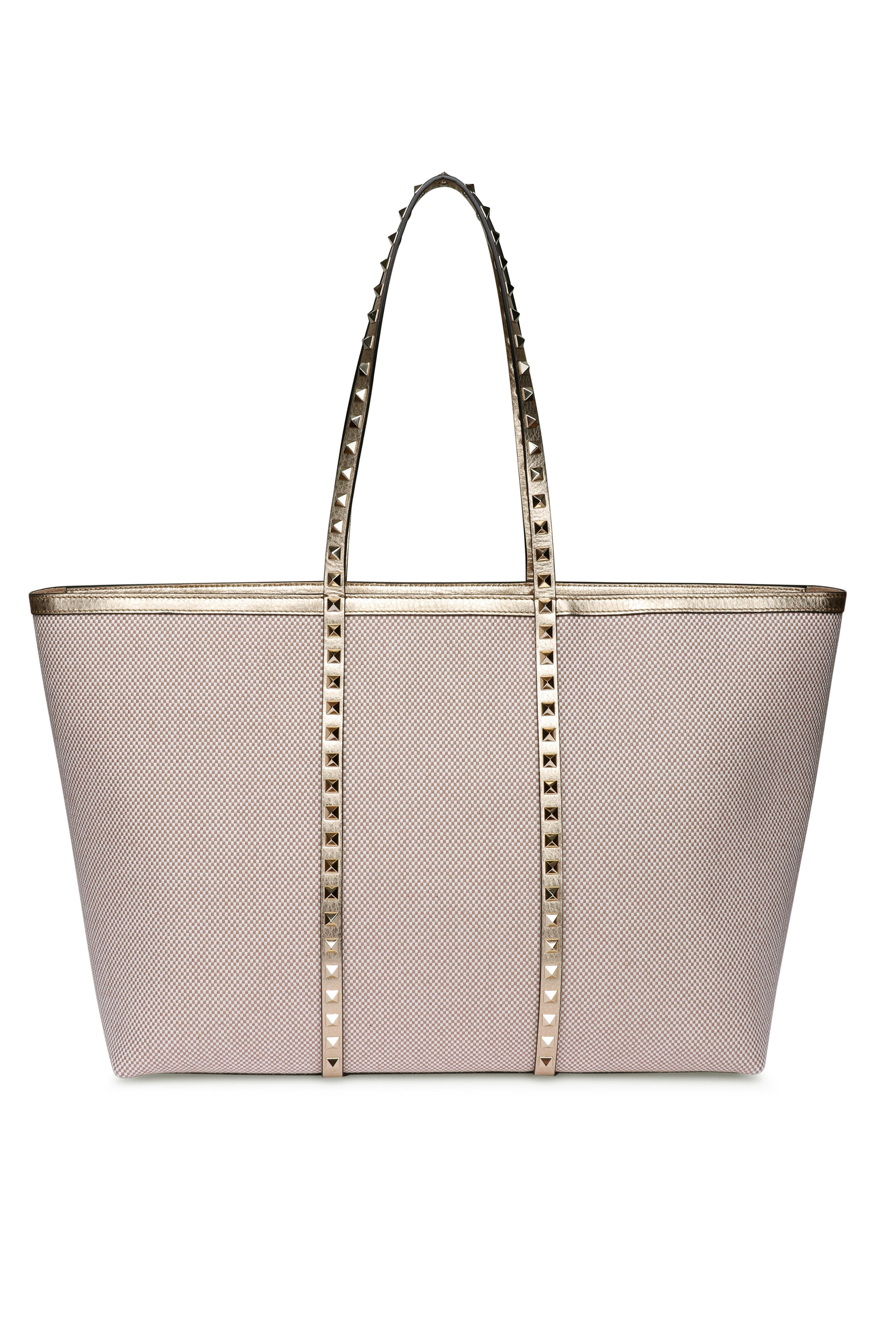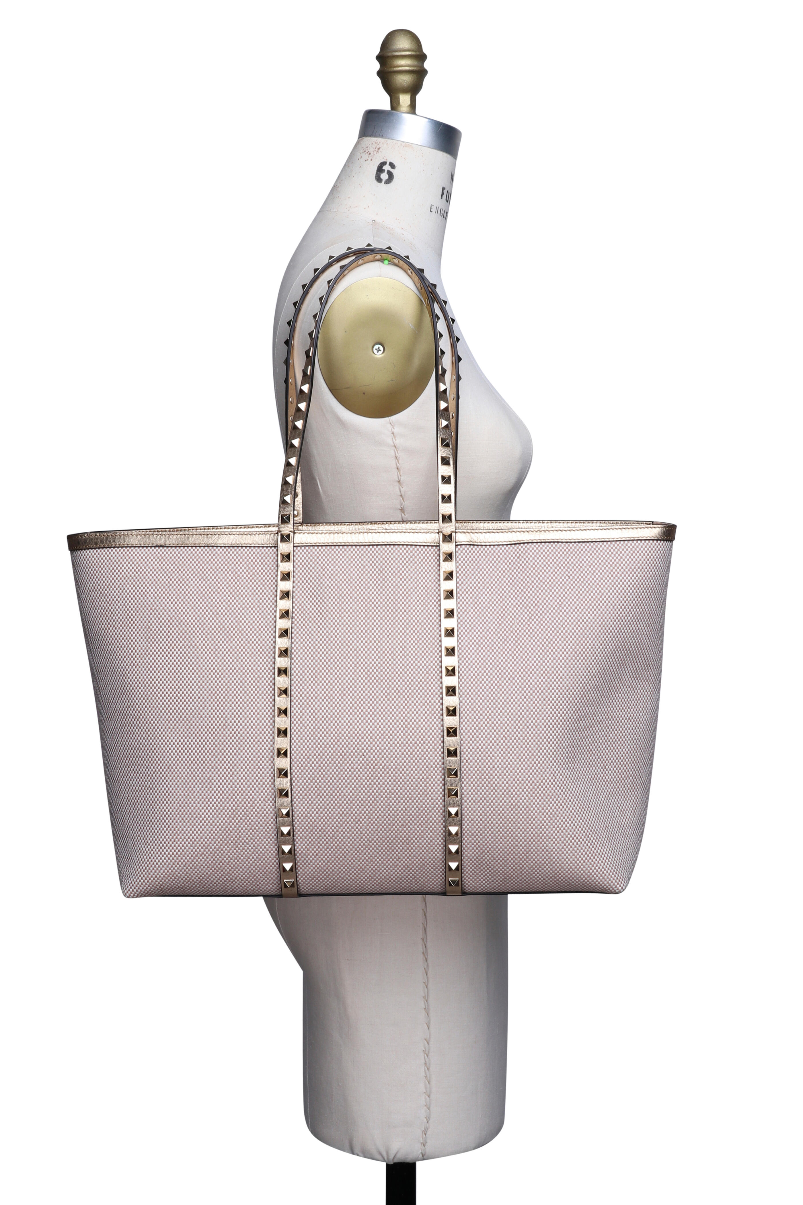 Canvas and leather outer. Suede lining. Zip closure. Dual top handles. Signature rockstud accents. Interior leashed zip pouch. Made in Italy. Width: 14.6”. Height: 10.6”. Depth: 4.7”.