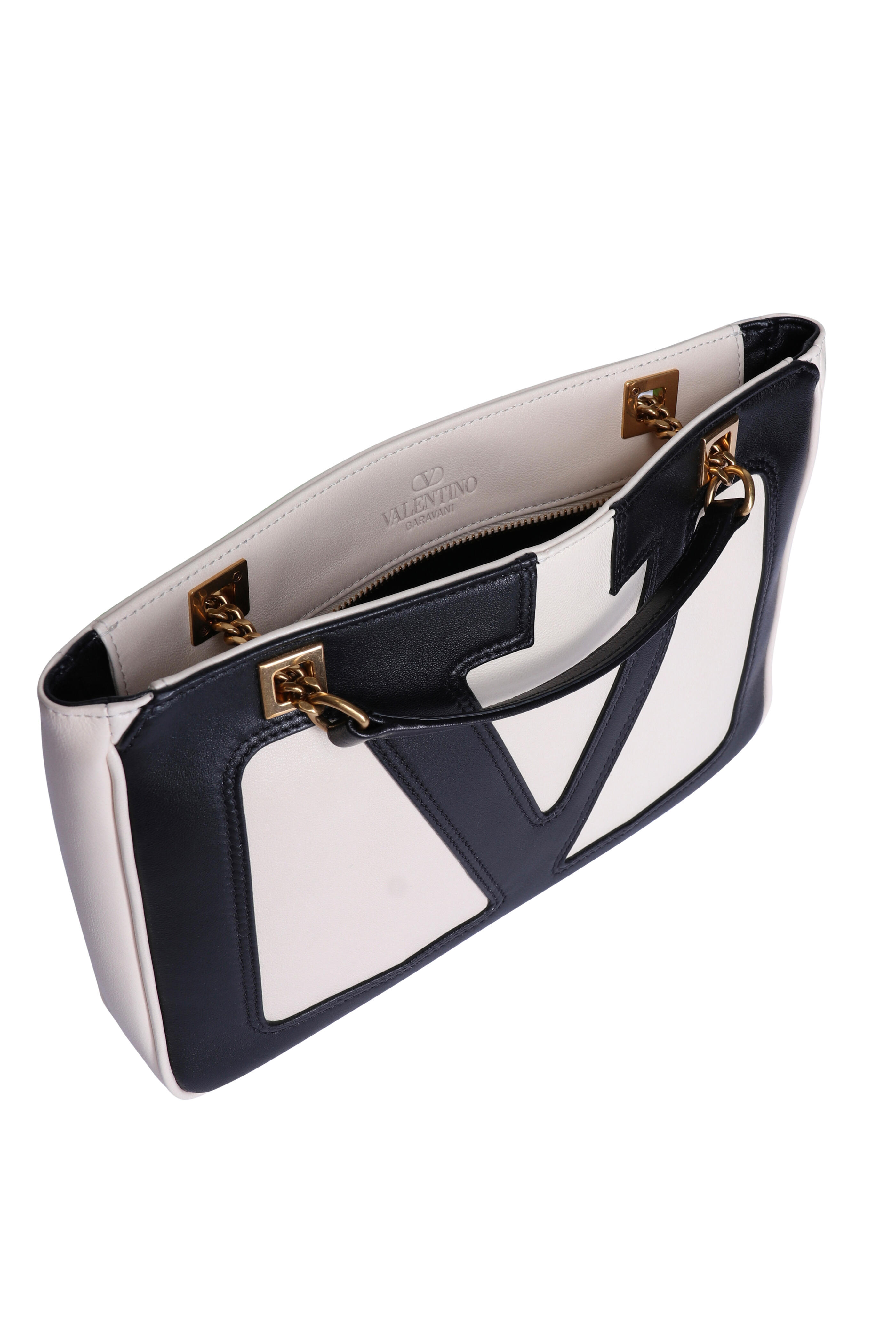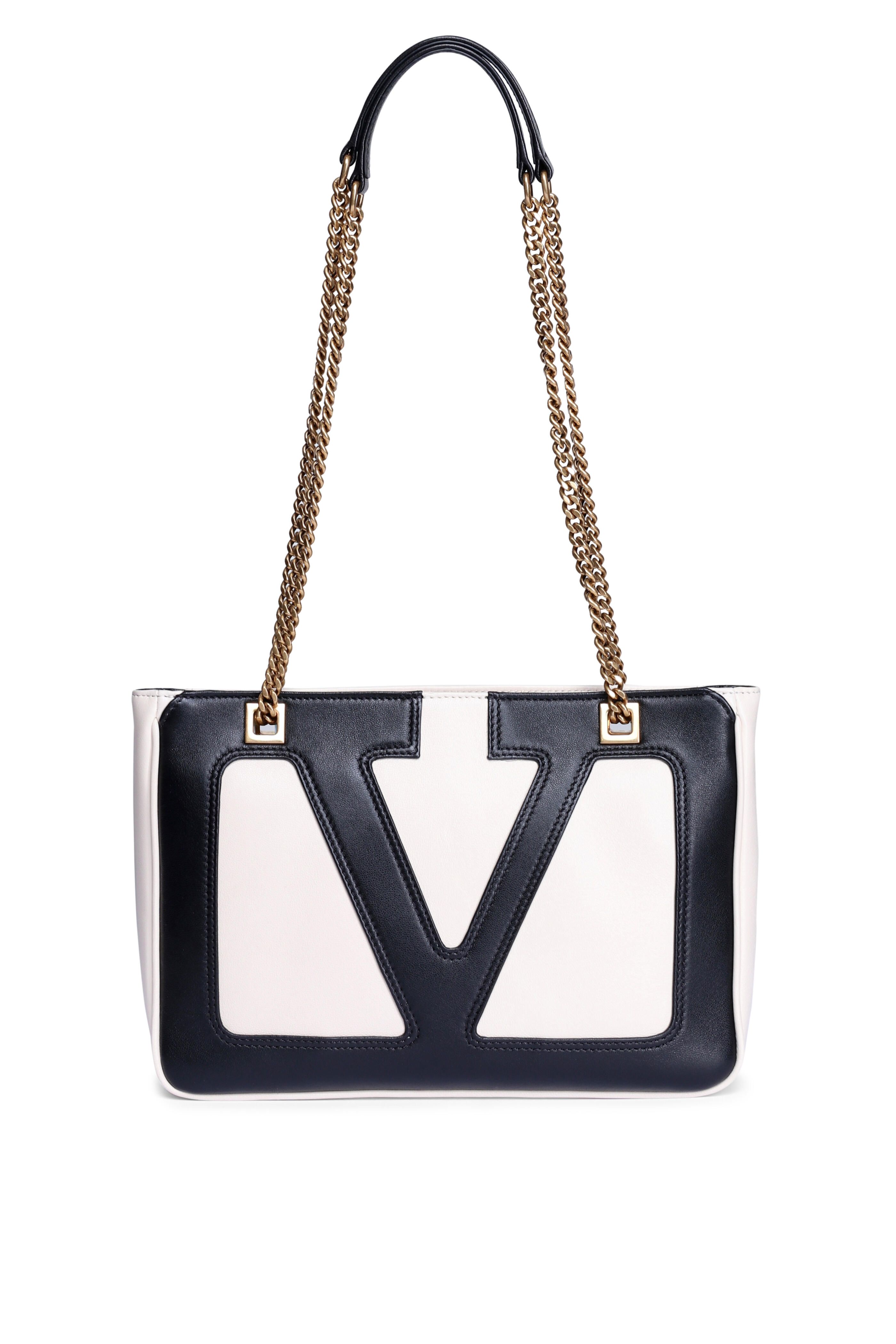 Nappa leather outer and lining. Zipper closure. Sliding chain. Contrasting maxi VLogo signature. Antique gold finish hardware. Exterior slip pocket. Made in Italy. Width: 10.6”. Height: 7.1”. Depth: 1.2”. Chain drop: 9.6-18.1”.