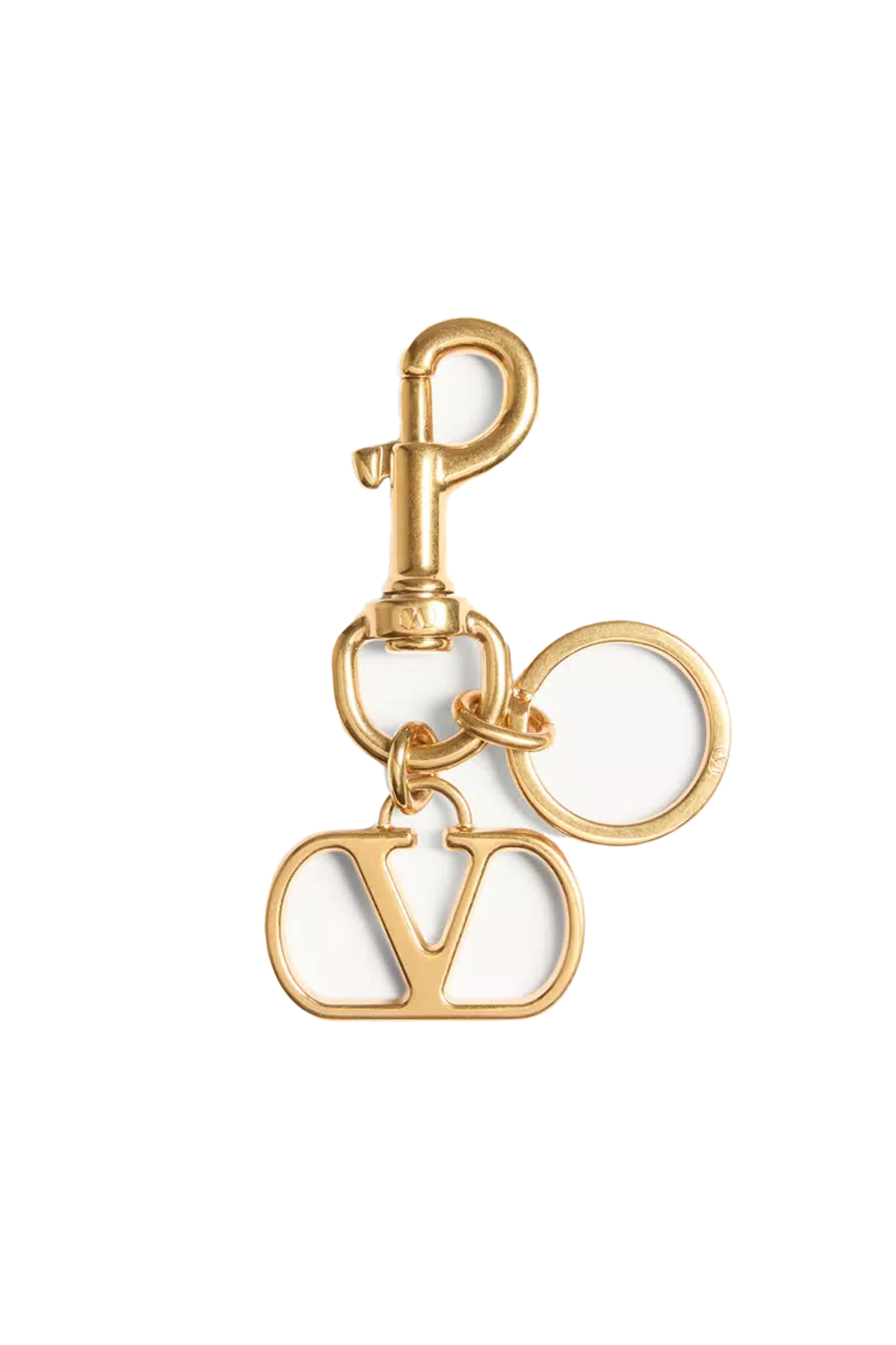 Metal. Antique brass finish. VLogo signature detail. Snap hook. Key ring. Made in Italy. Width: 1.8”. Height: 1”.