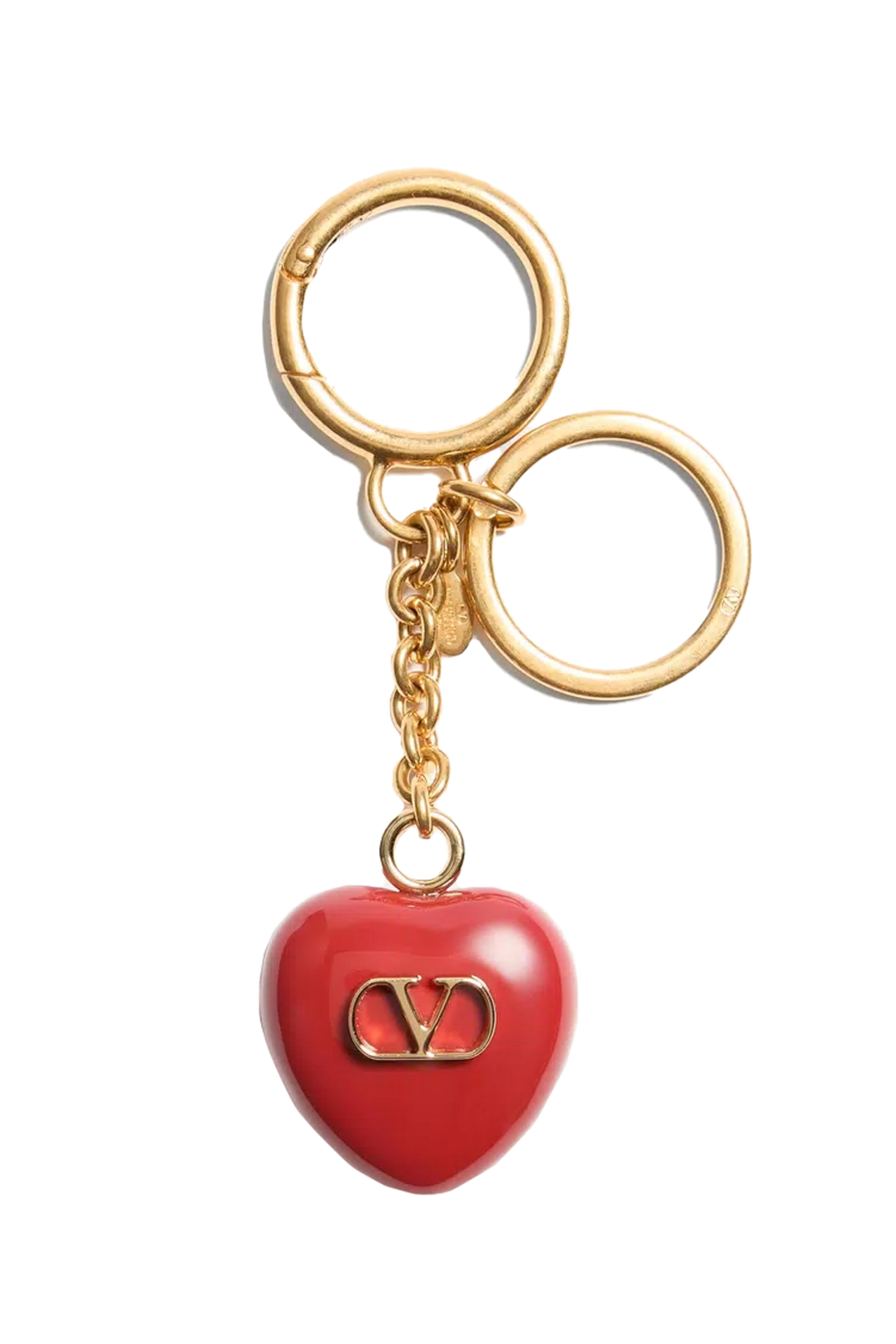 Antique brass finish. Enameled heart. VLogo signature metal detail. Snap hook. Key ring. Made in Italy. Width: 1.4”. Height: 5.1”.