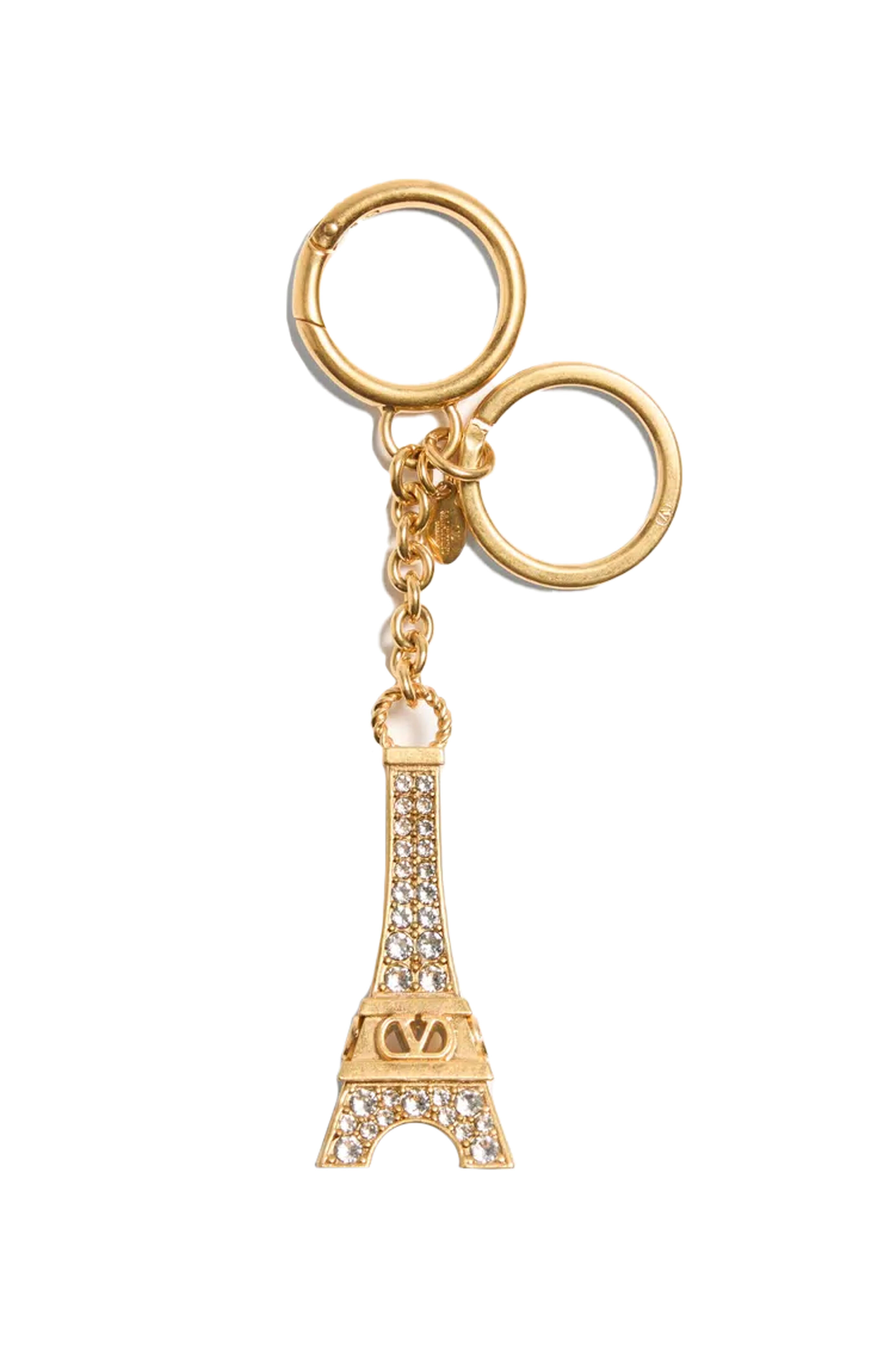 Antique brass finish. Metal Eiffel Tower with Swarovski crystals. VLogo signature metal detail. Snap hook. Key ring. Made in Italy. Width: 1.1”. Height: 6.1”.