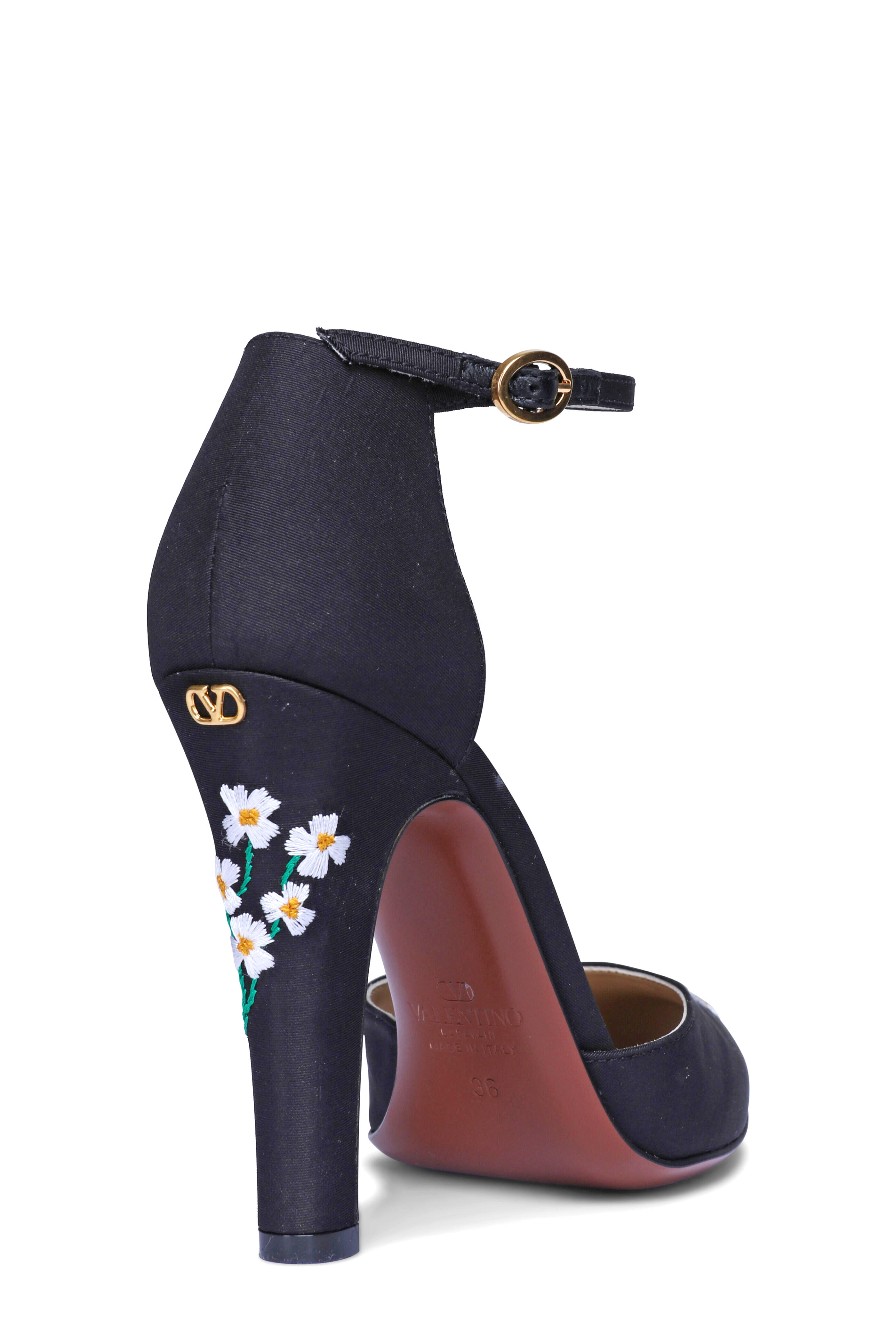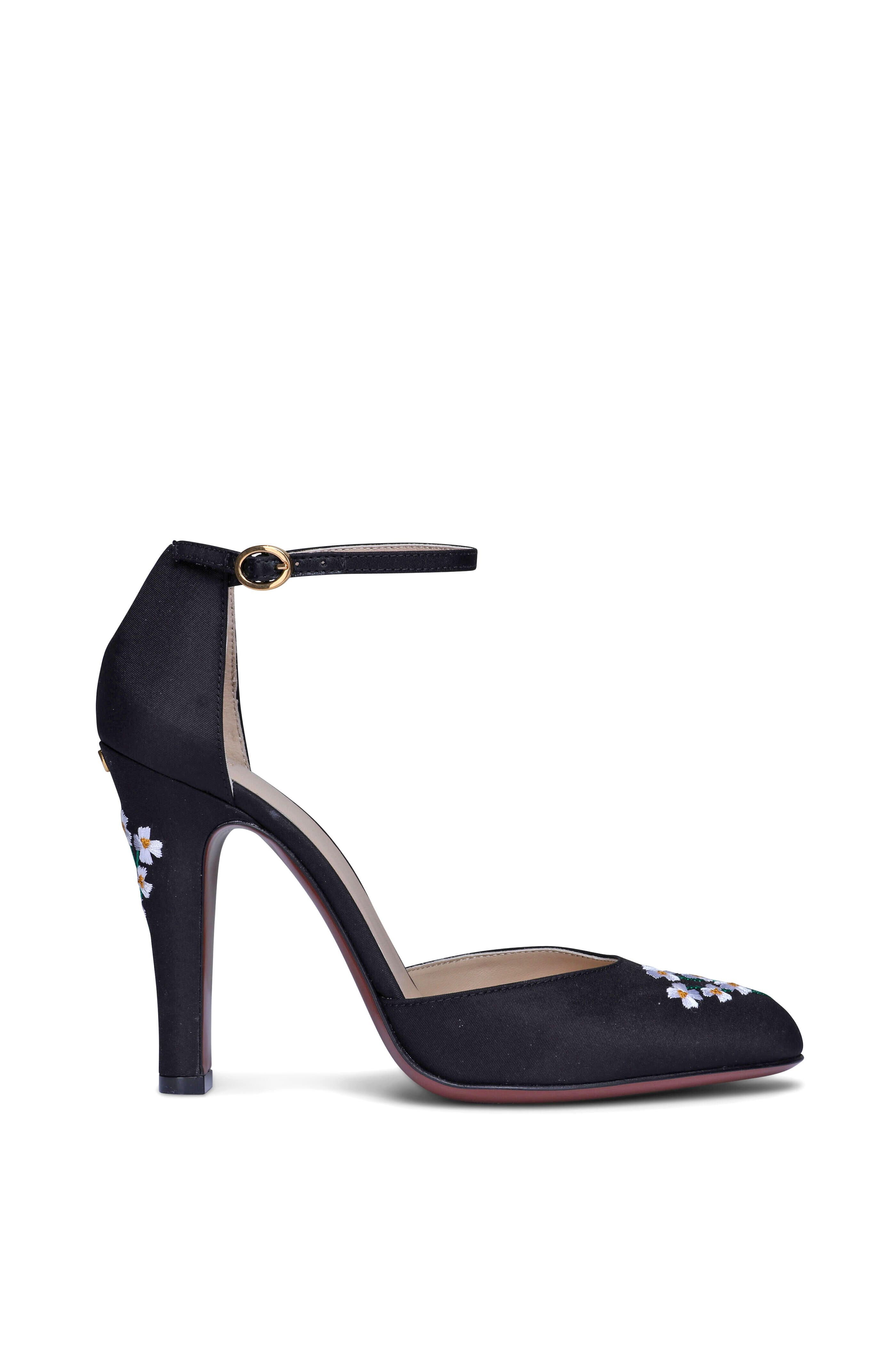Satin silk upper. Leather lining and sole. Round toe. Adjustable ankle strap. Embroidered daisy flowers on toe vamp and back heel. Made in Italy. Heel measurement: 105mm.