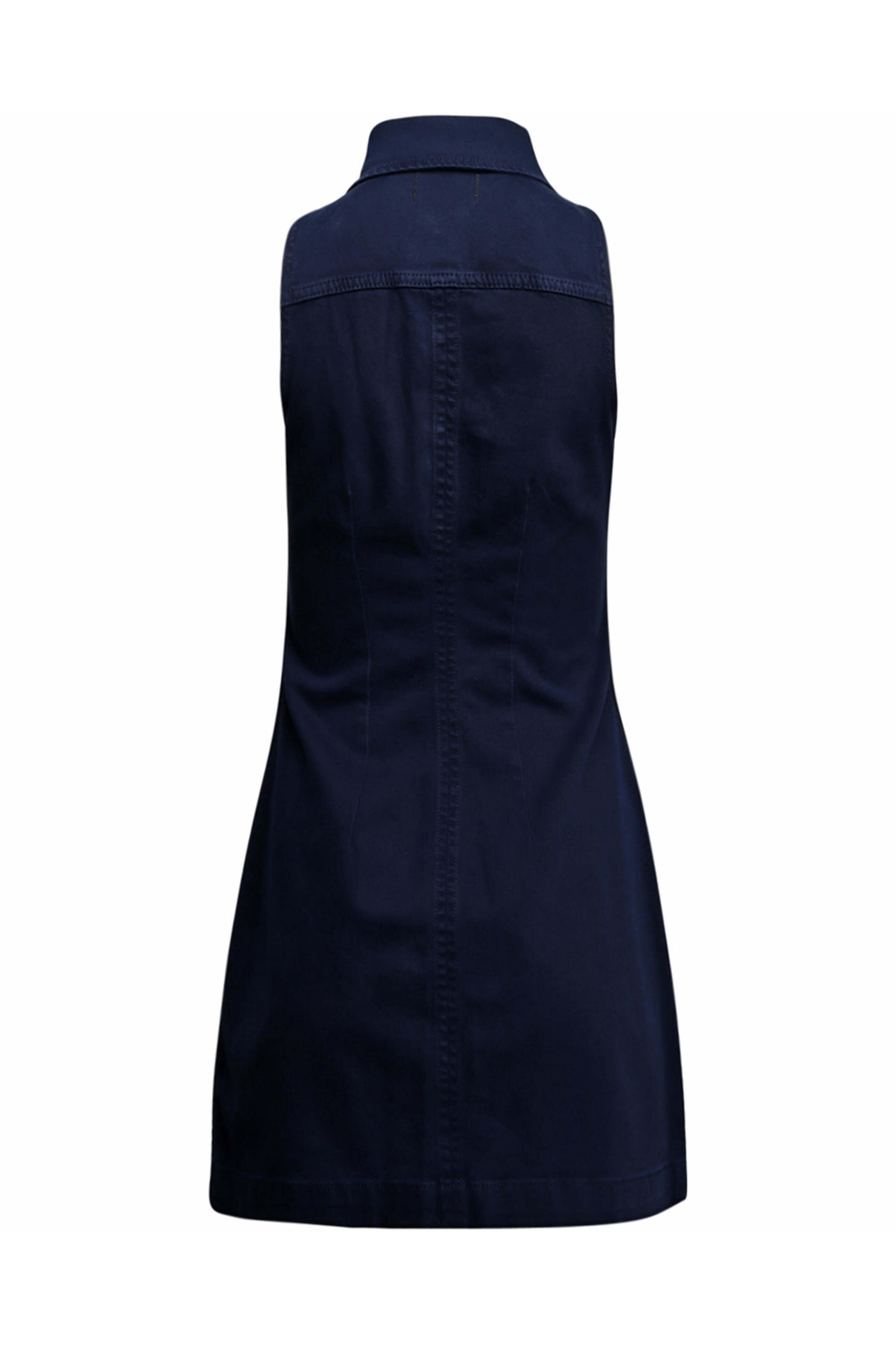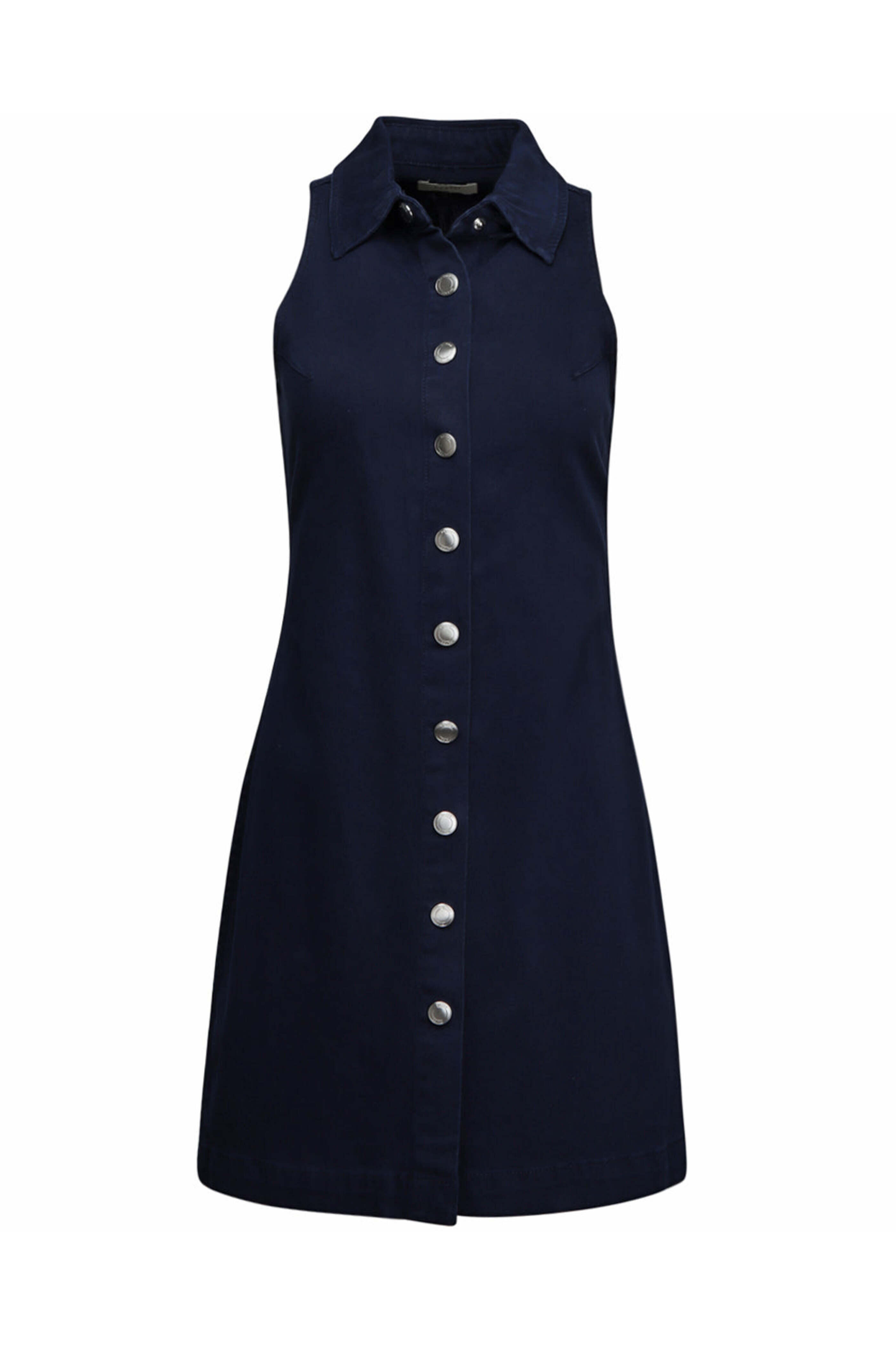 DL1961 Classic Navy Payton Mini Dress. Collar. Sleeveless. Button down front closure. Aline skirt. Mini length. 63% lyocell, 37% elasterell-p.