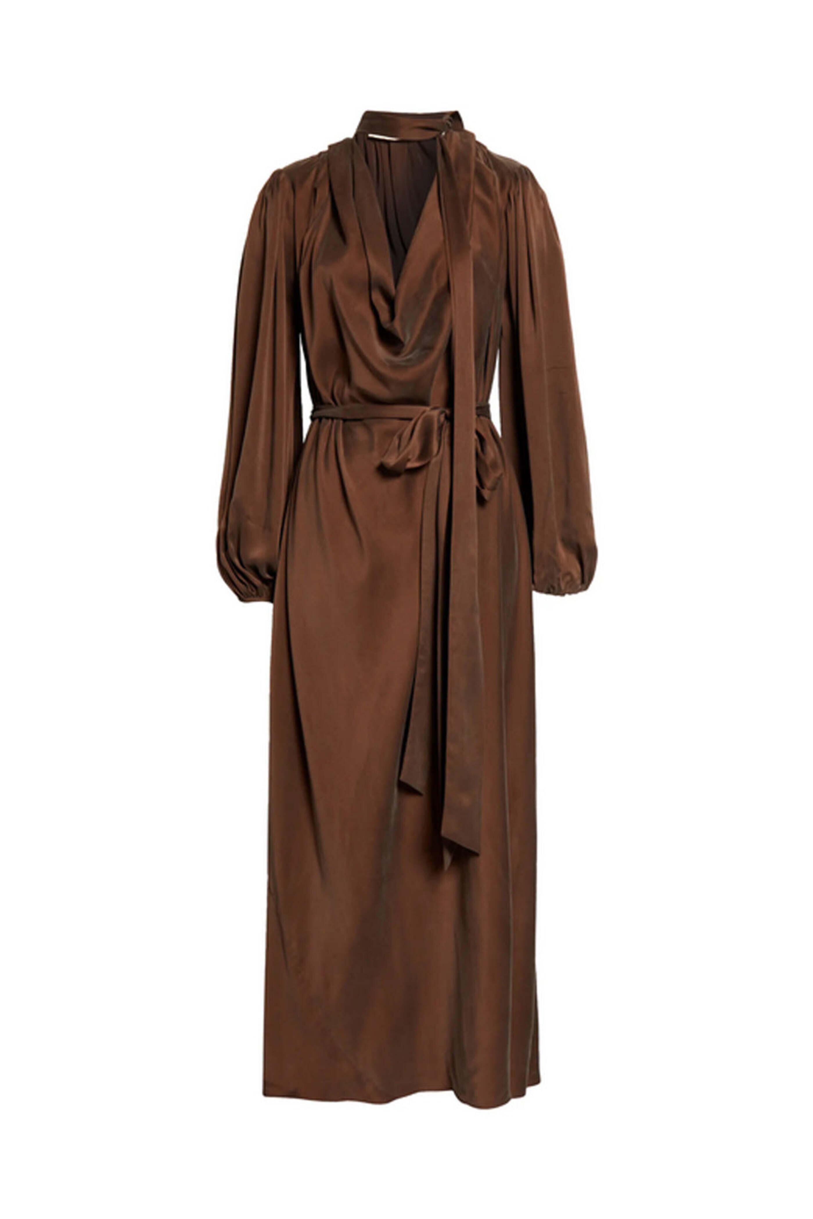 Zimmermann Chocolate Silk Billow Dress. V neck; self-tie detail at neck. Long sleeves; elastic cuffs. Removable self-tie belt at waist; self-fabrication. Relaxed fit. Midi length. 100% silk.