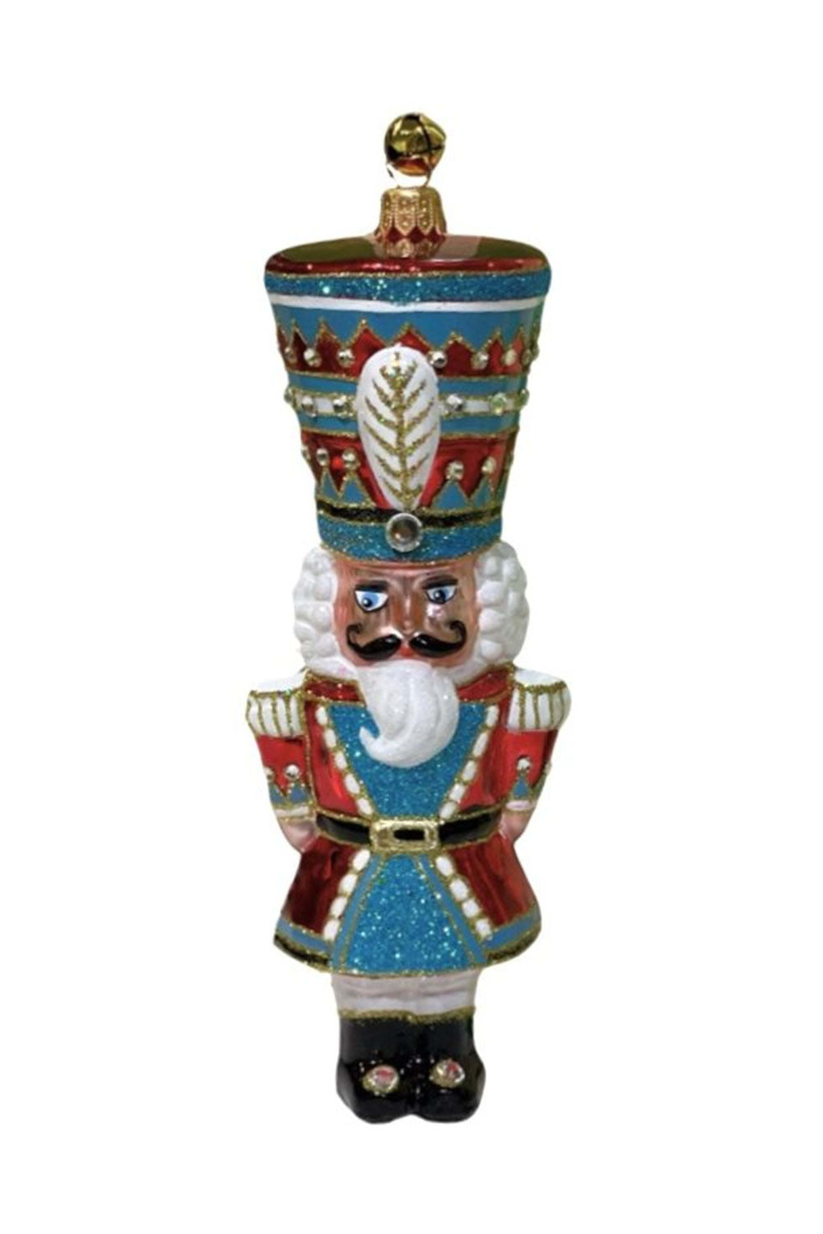 Jingle Nog Major Filbert Ornament. Mouth Blown, Hand Painted and Glittered in Poland. Sterling Silver Lined Hand Blown Glass Nutcracker Ornament. Exquisitely Hand Painted Shiny Red Lacquer and Blue Glitter Decorated Regal Nutcracker Christmas Tree Ornament Decoration. Whimsical Tall Hat Nutcracker Christmas Ornament Trimmed with Czech Crystals and Gold Tassel. Limited Edition Collectible Keepsake Christmas Nutcracker Ornament. 6³.