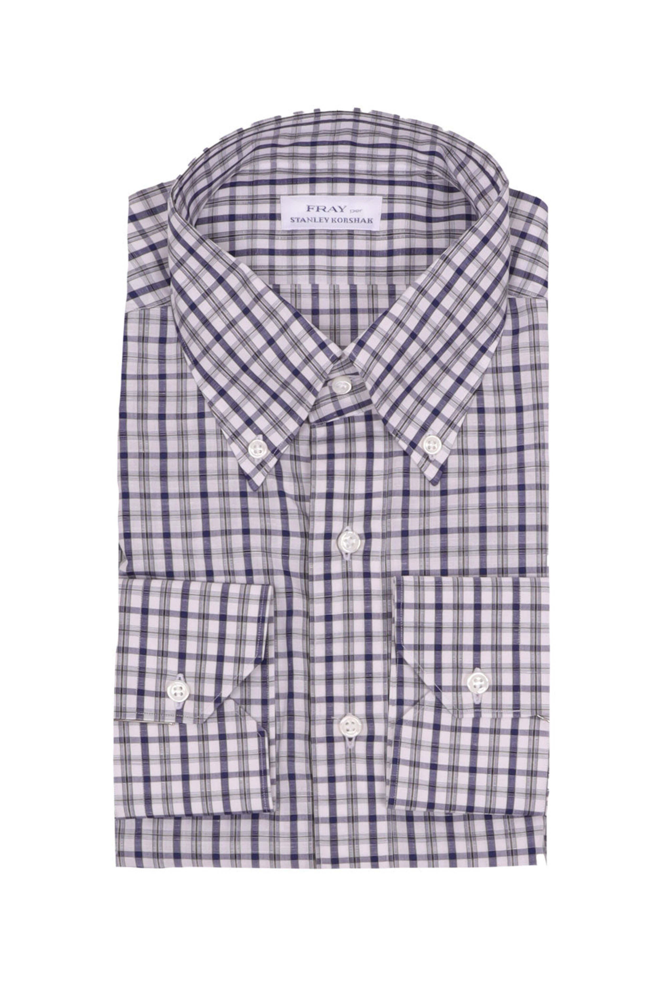 Fray Blue Plaid Boston Sportshirt. Semi spread collar. Button down front. Long sleeves. Single button barrel cuffs. Stanley Korshak Exclusive. Made in Italy. 100% cotton.