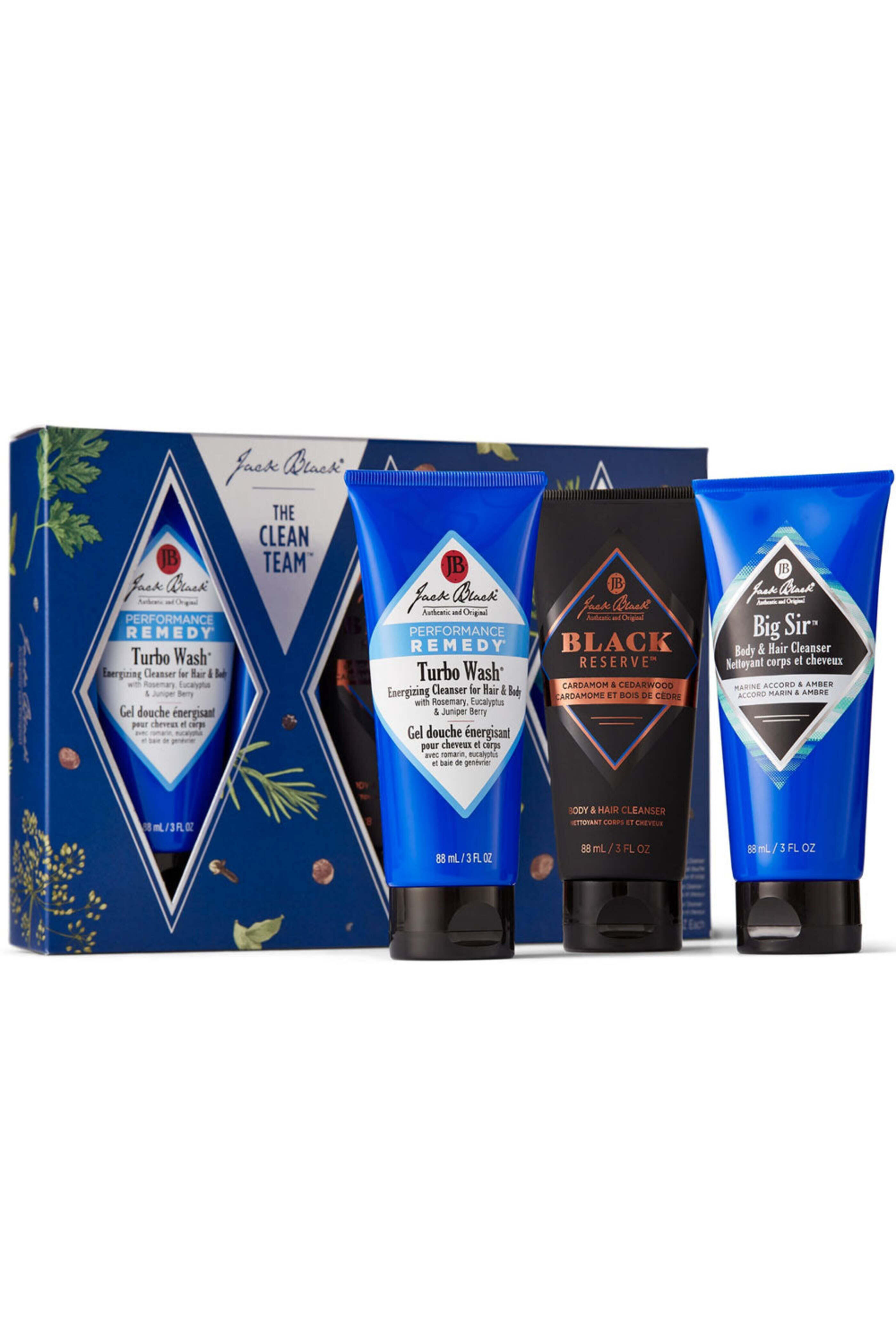 Jack Black The Clean Team Trio. Big Sir Body & Hair Cleanser. Black Reserve Body & Hair Cleanser. For all skin types. 3oz. Makes perfect scents and leaves skin feeling clean and smelling great without overdrying. Turbo Wash Energizing Cleanser for Hair and Body.