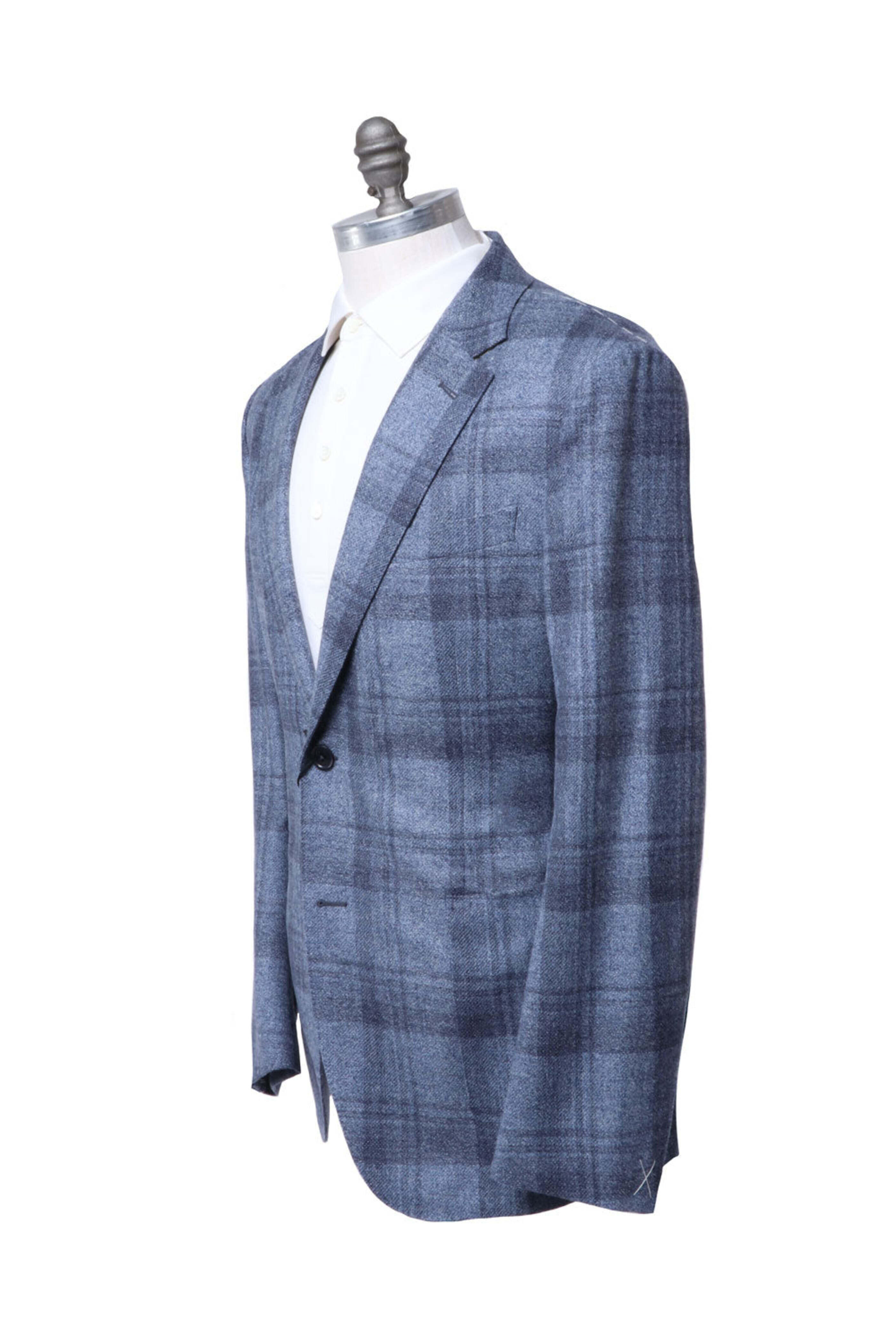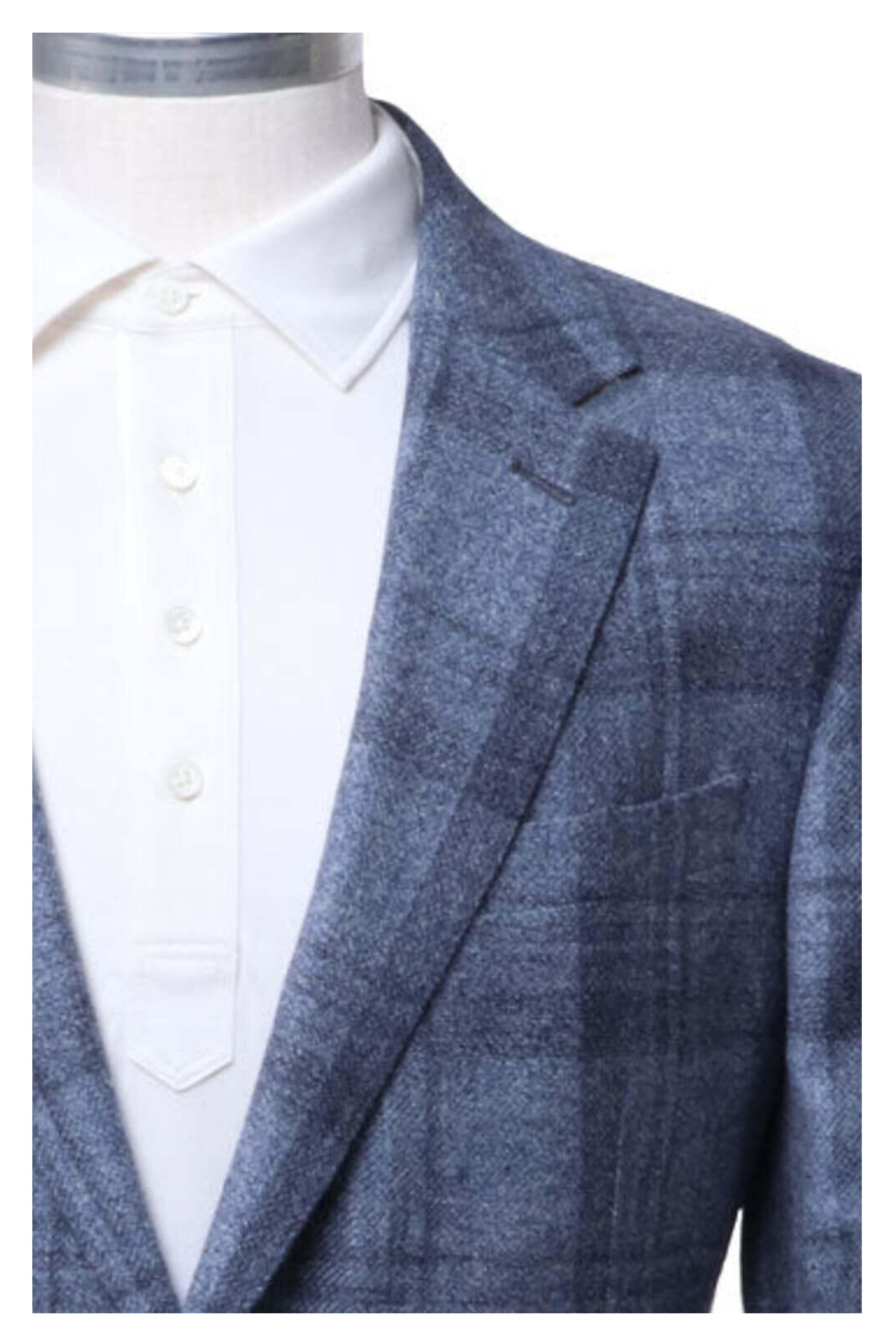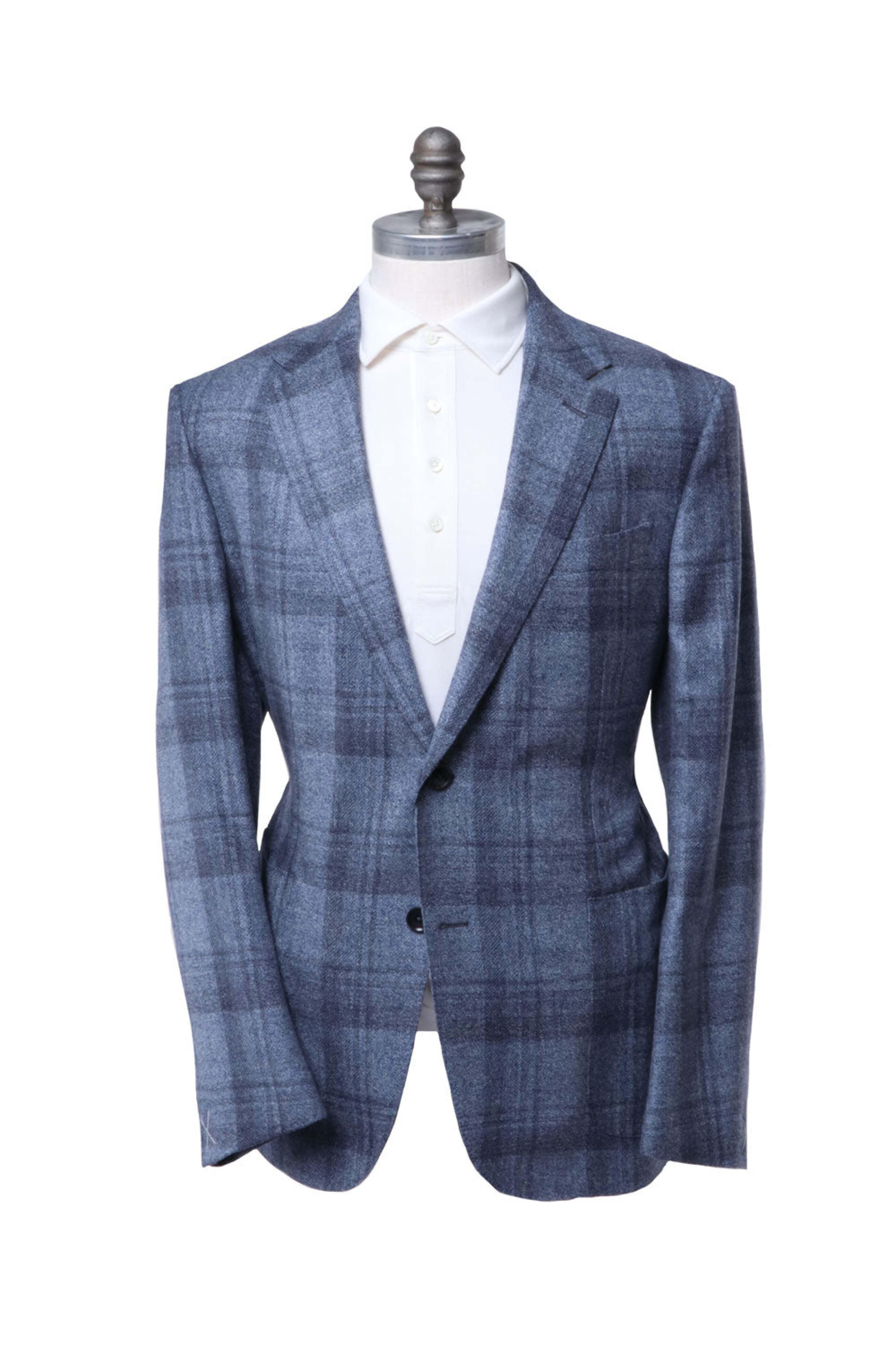 Notch lapels. Two button jacket. Front left chest welt pocket. Waist patch pockets. Unfinished buttonholes. Double back vents. Made in Italy. 76% wool, 14% silk, 10% linen; quarter-lined. 100% Cupro lining.