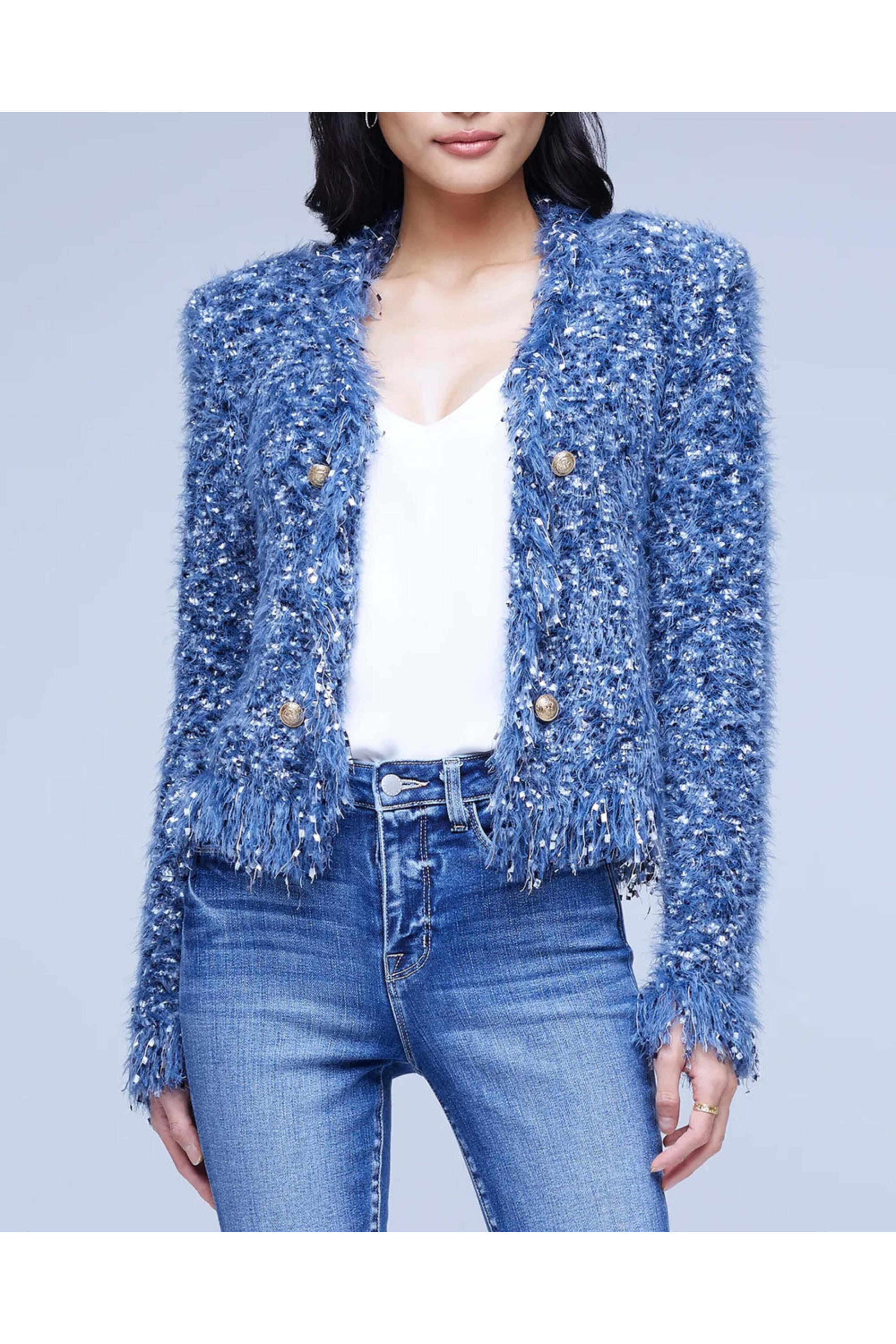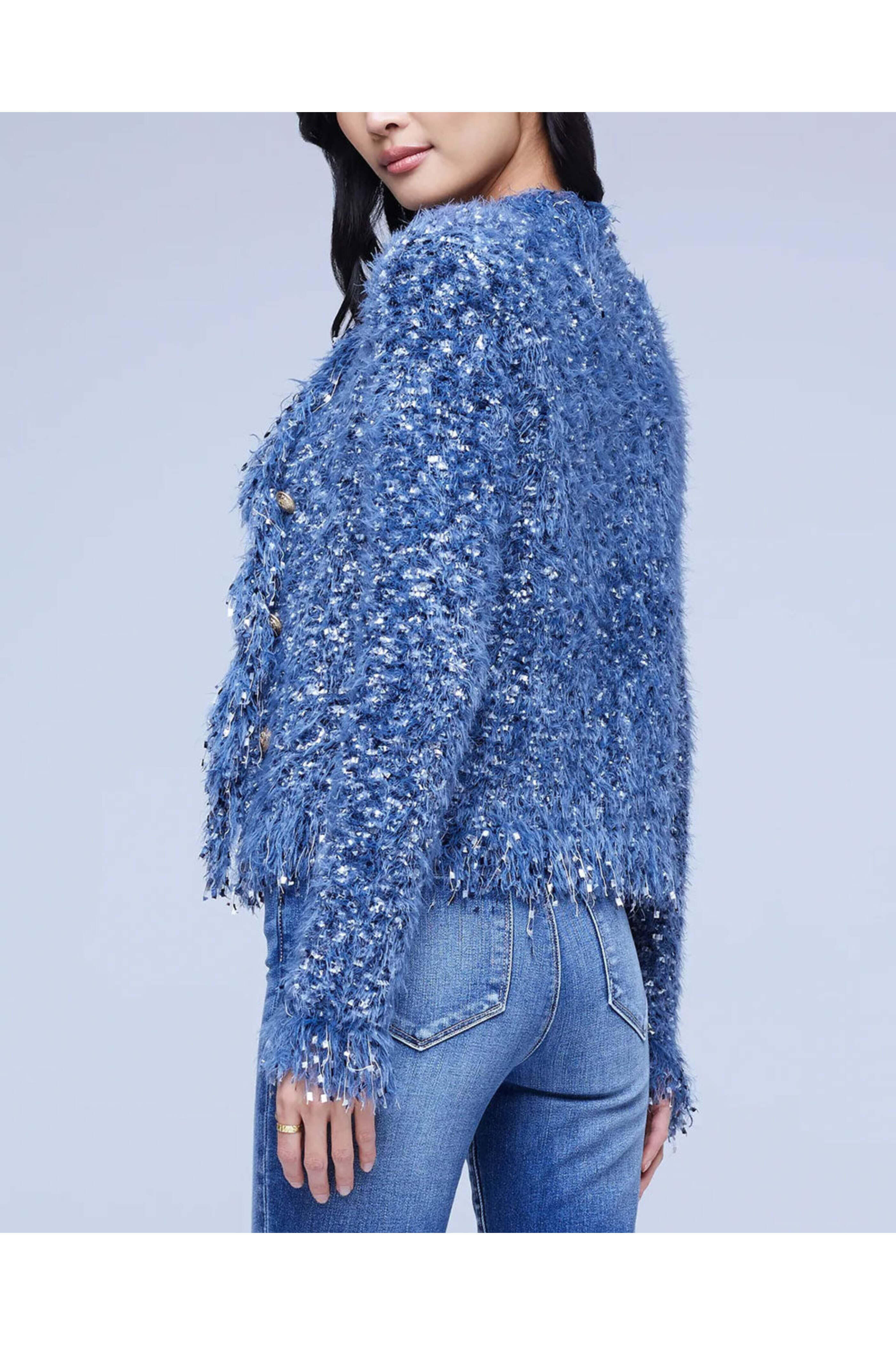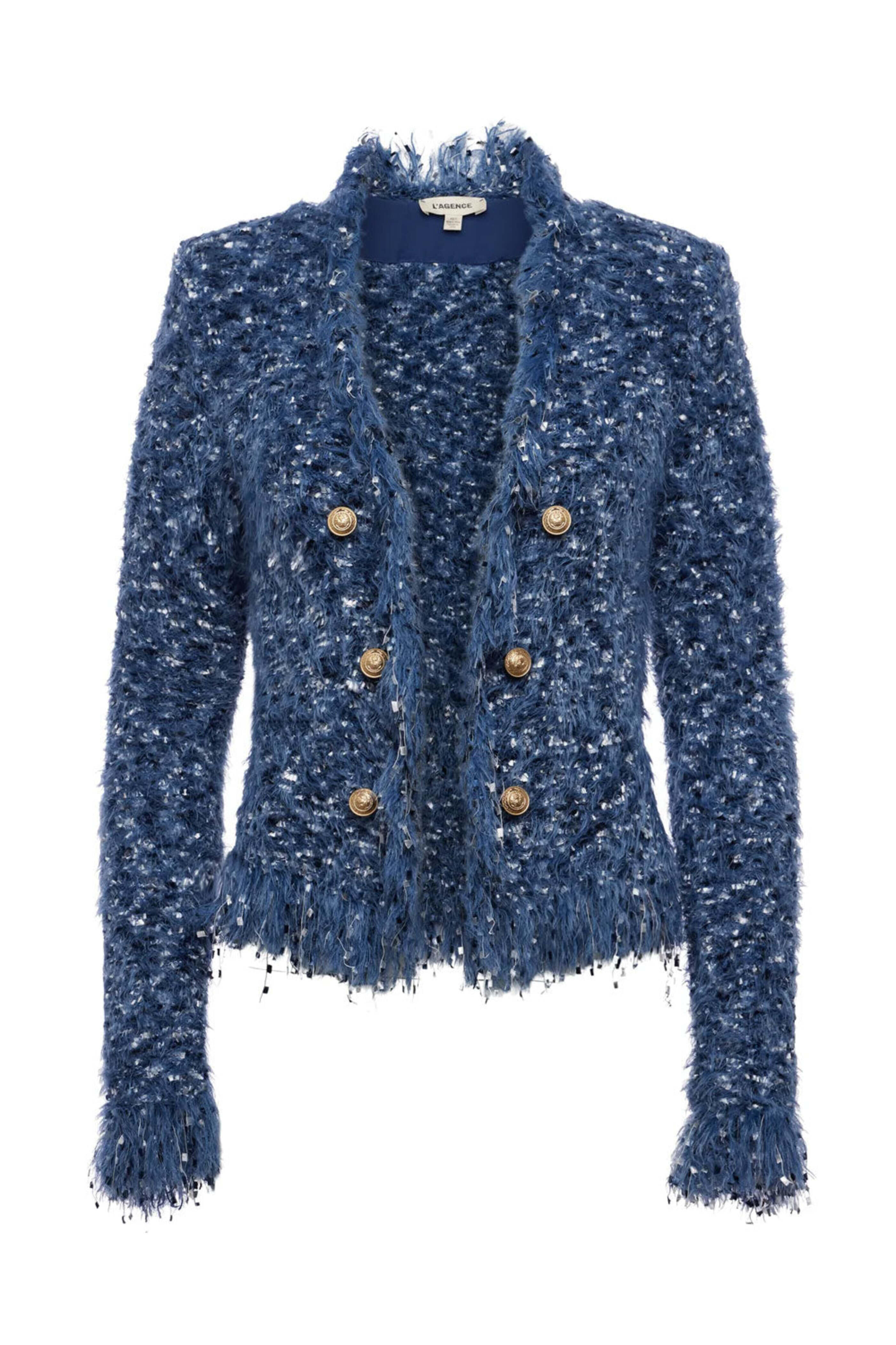 LAgence Blue Azure Cardigan. Open front. Structured shoulders. Long sleeves. Gold tone statement buttons at front; no closure. Knit fabrication. Relaxed fit. 60% polyester, 40% nylon.