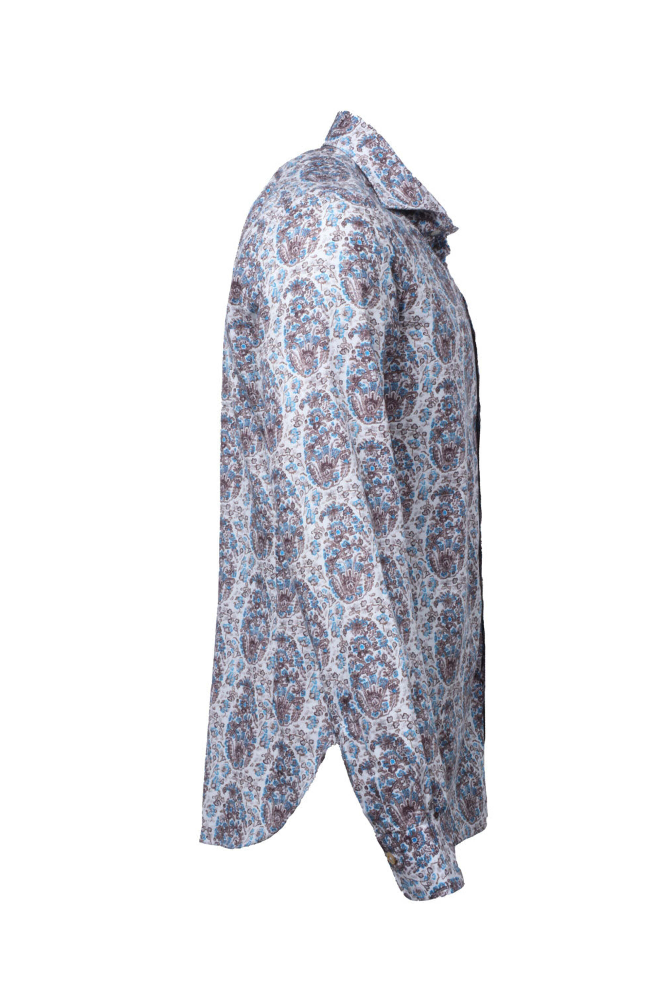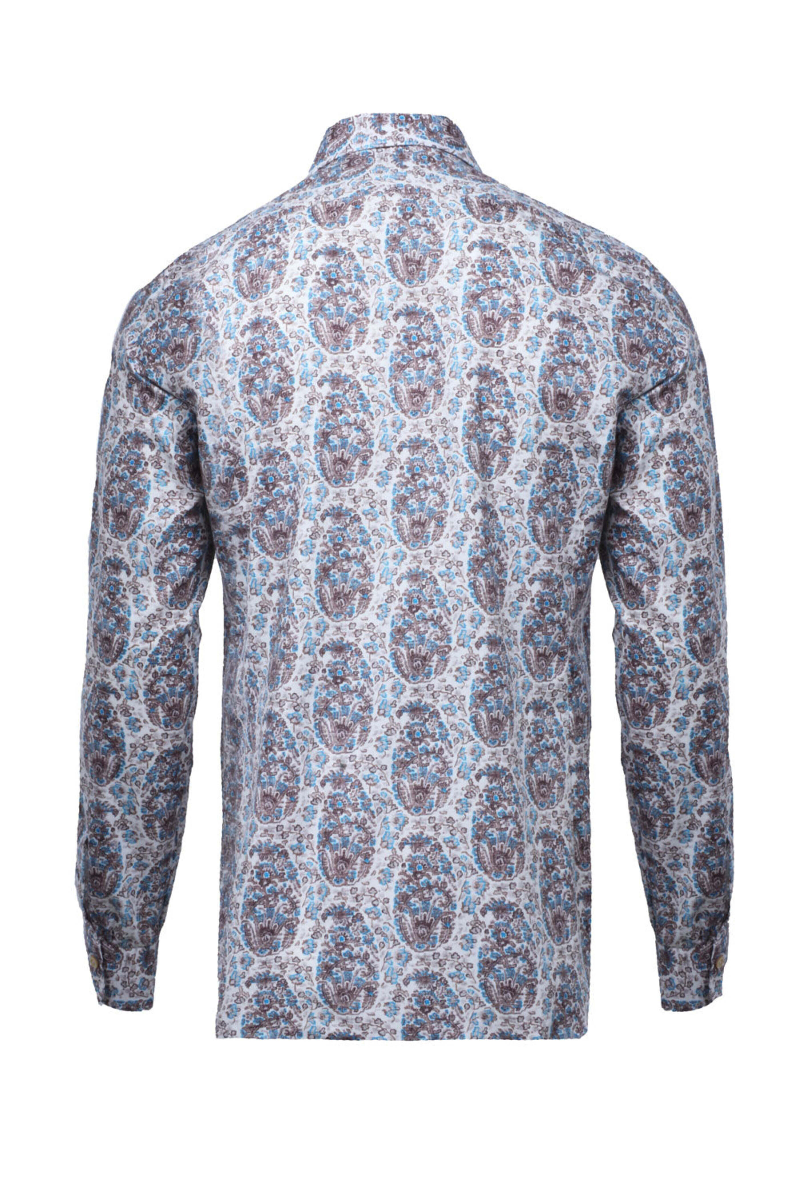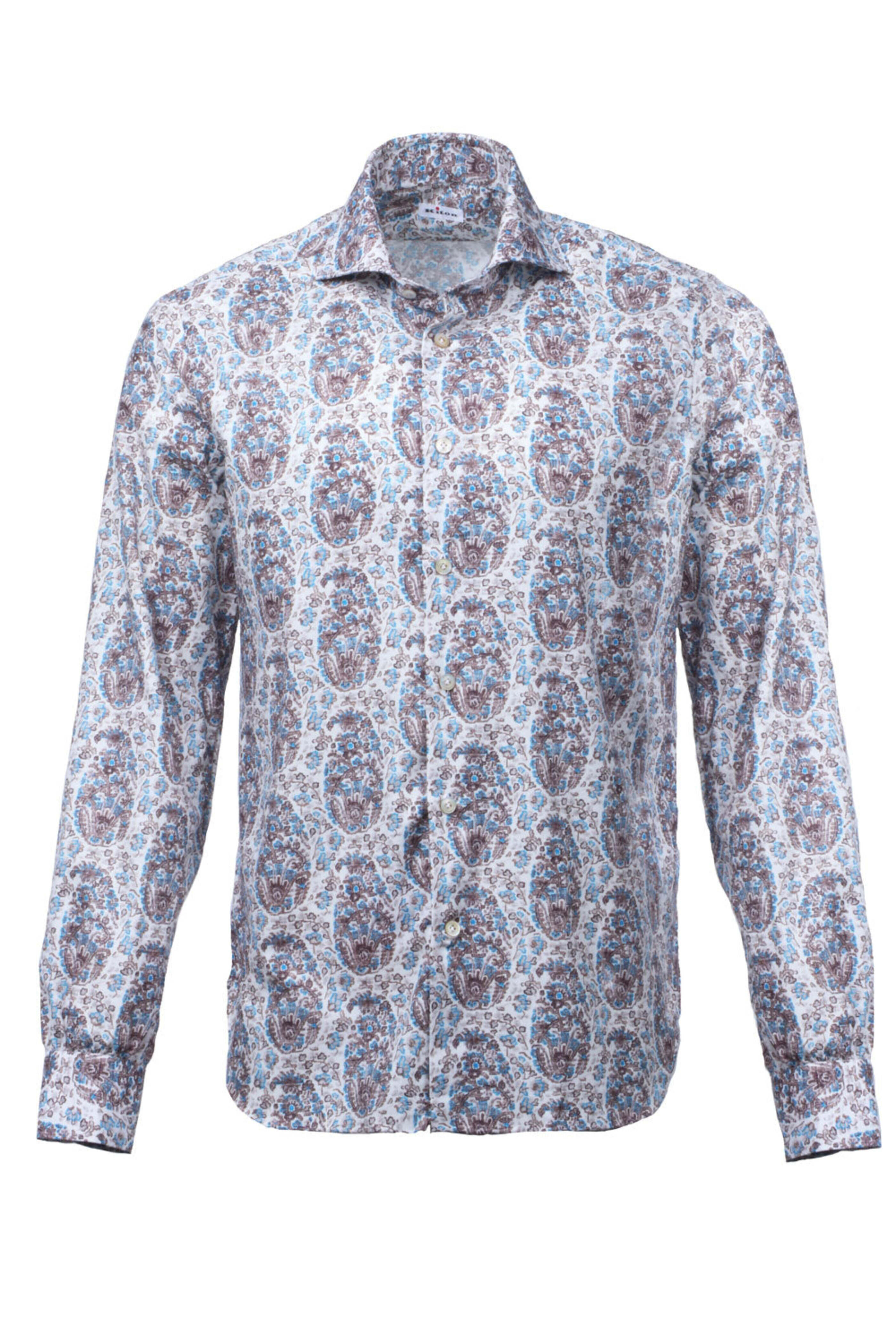 Kiton Turquoise Tapestry Print Sportshirt. Spread collar. Button down closure. Mitered barrel cuffs. Made in Italy . 100% cotton.