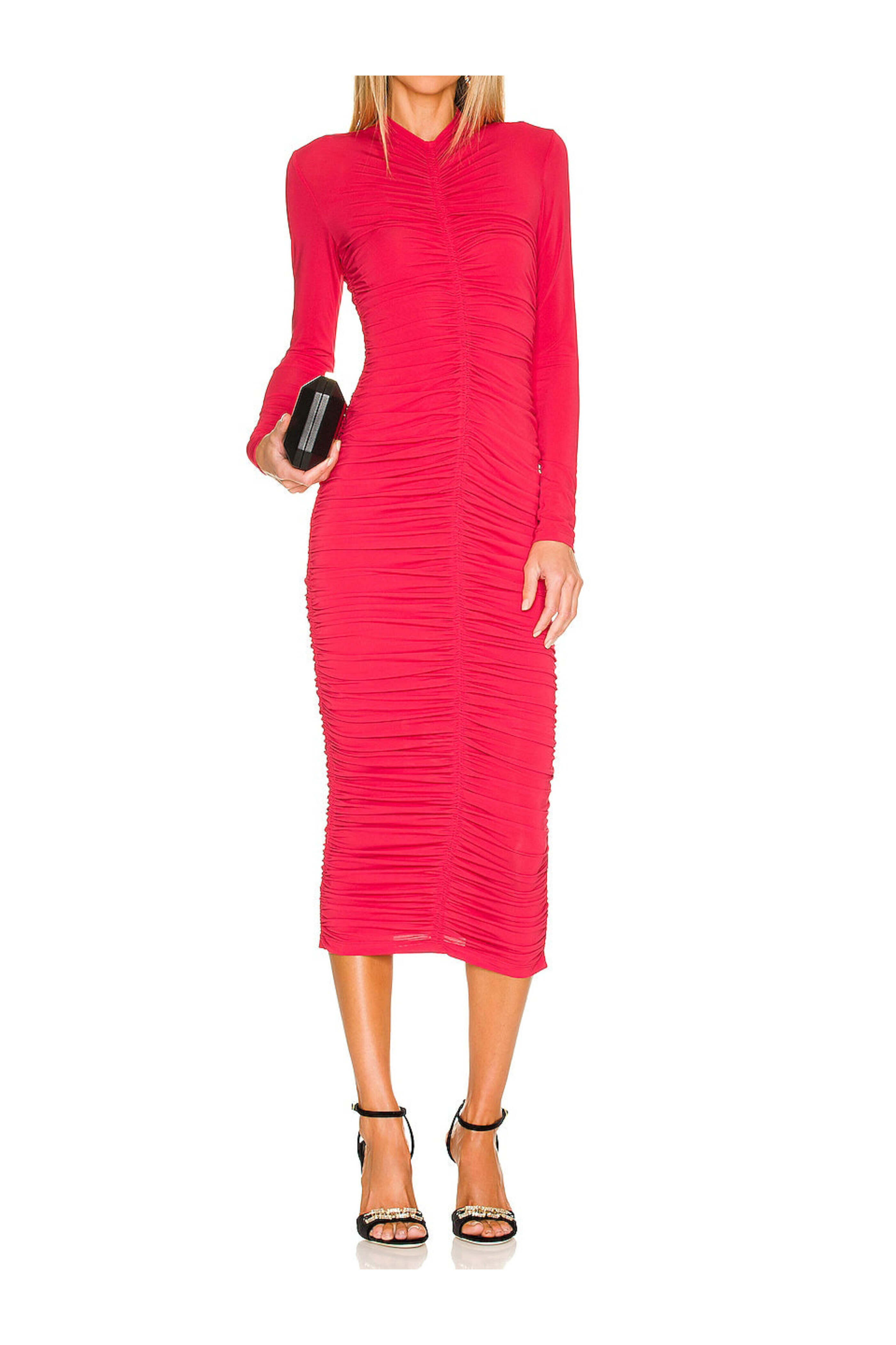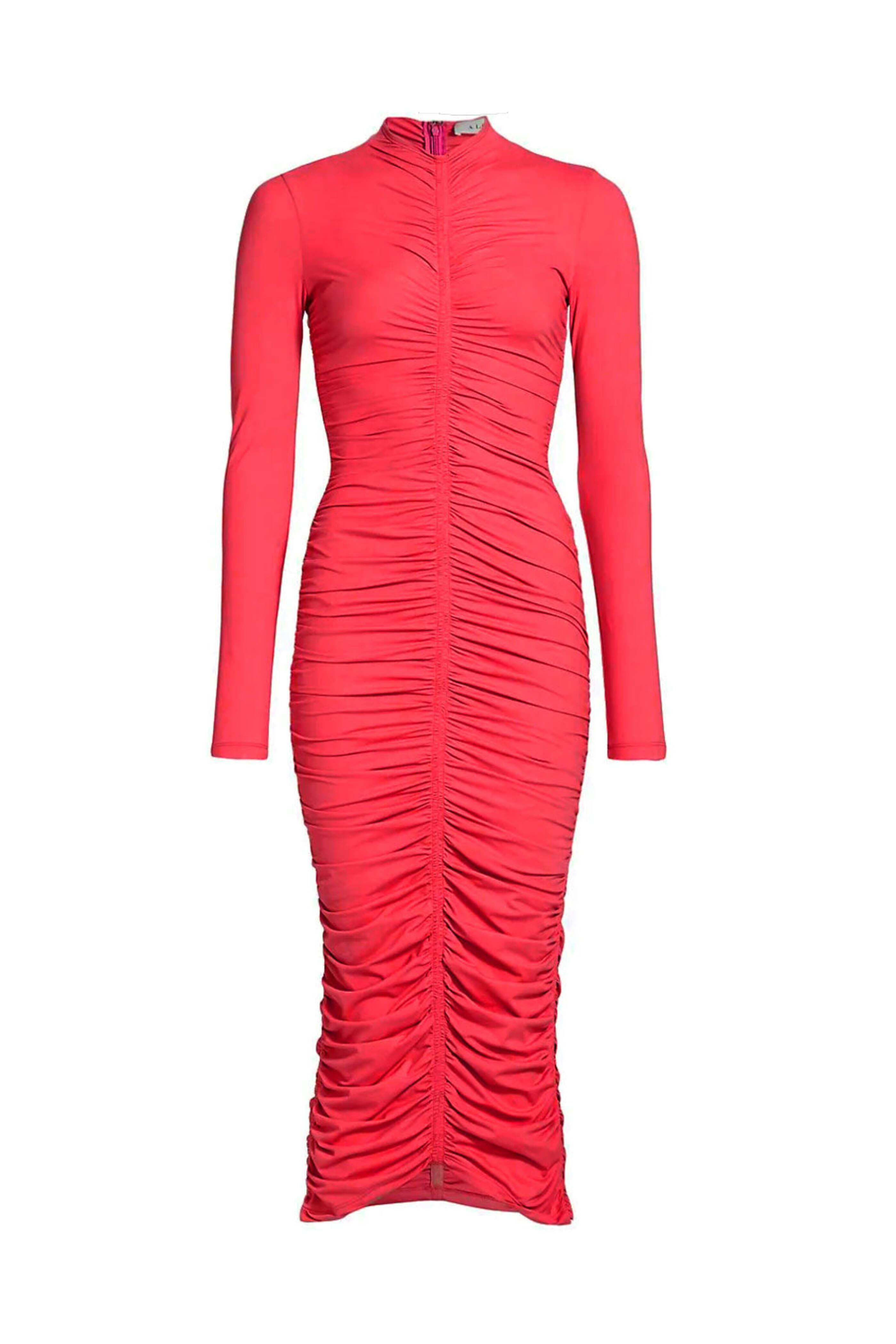 A.L.C. Hibiscus Ruched Ansel Midi Dress. Mock v neck. Long sleeves. Concealed back zip closure. Ruched center front, back and sides. Slim fit. Midi length. Unlined. 83% polyamide, 17% elastane.
