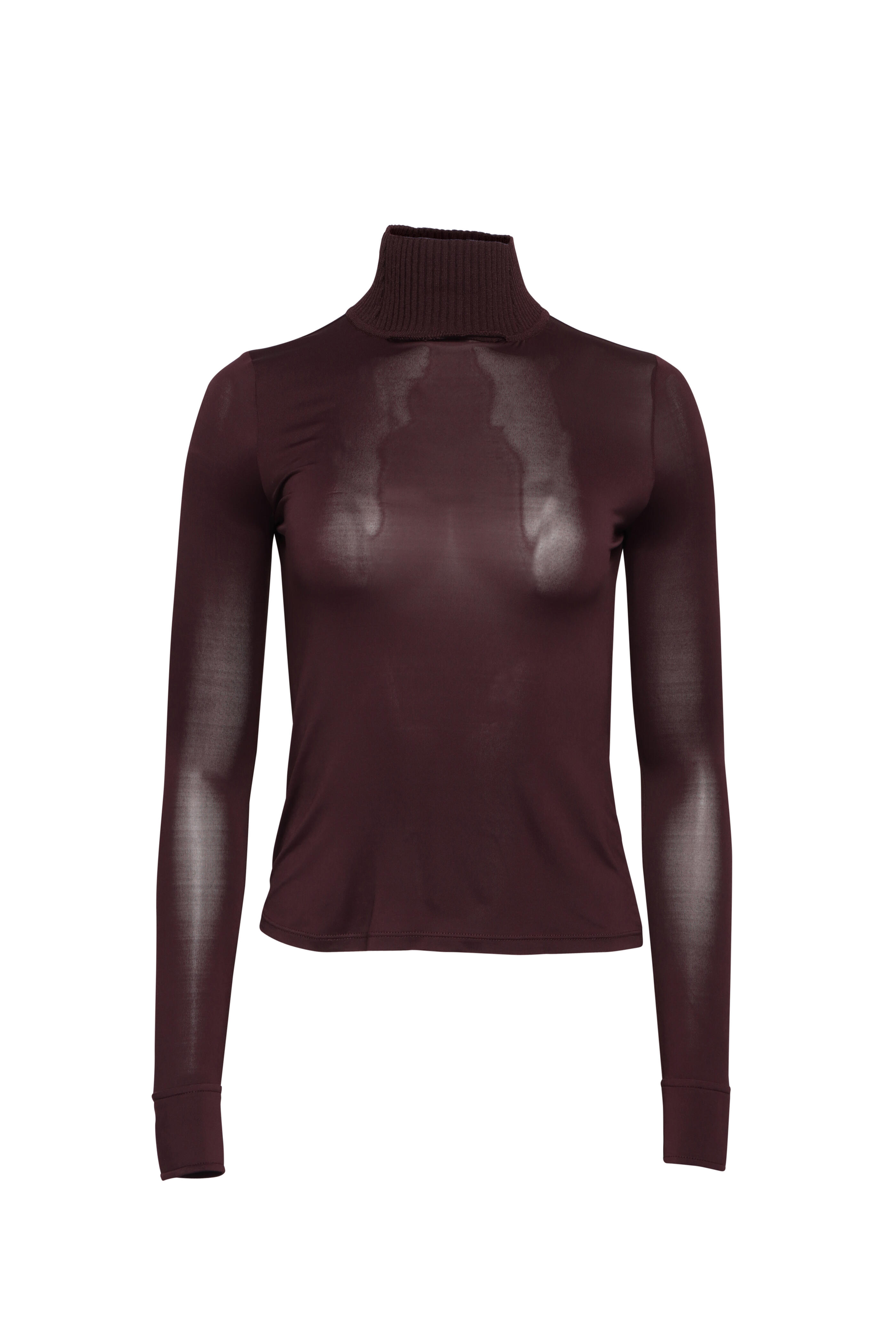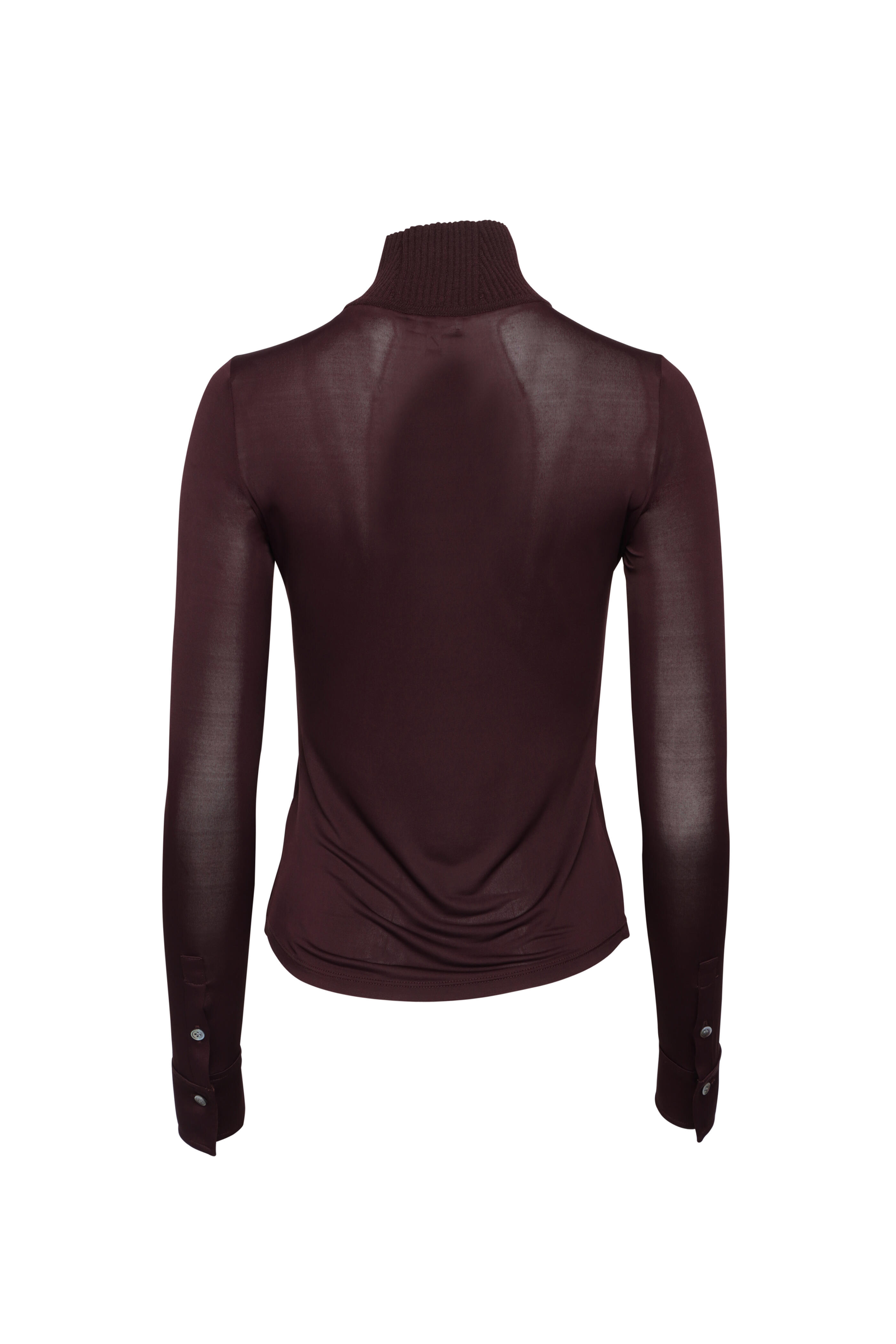 Turtleneck. Long sleeves ; button cuffs. Slim silhouette. Straight hem. Imported. Bust 33.5” (Size S). Waist 31” (Size S). Length 22.375” (Size S). 94% acetate, 6% elastane outer 1, 83% viscose, 17% polyester outer 2. Dry clean.