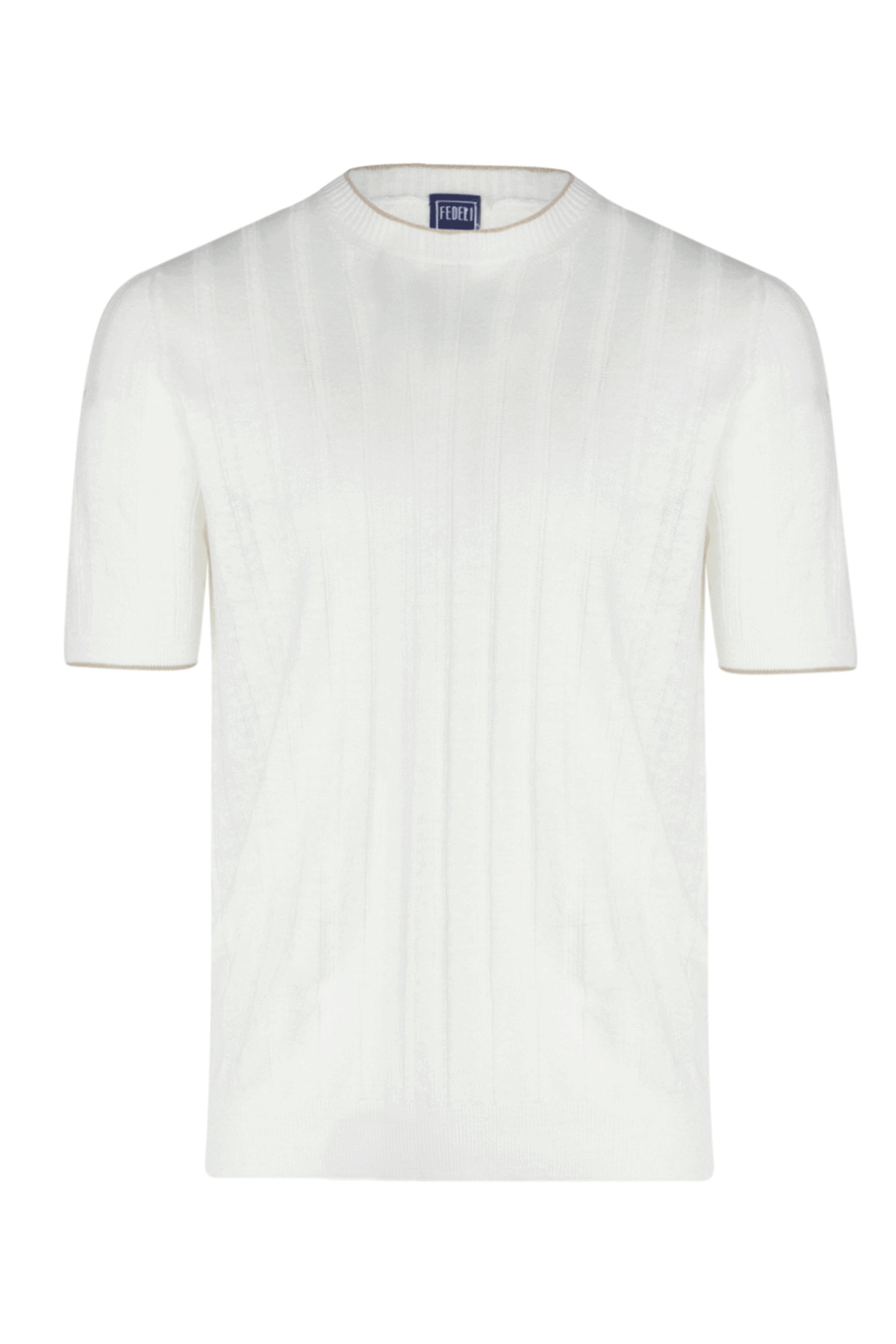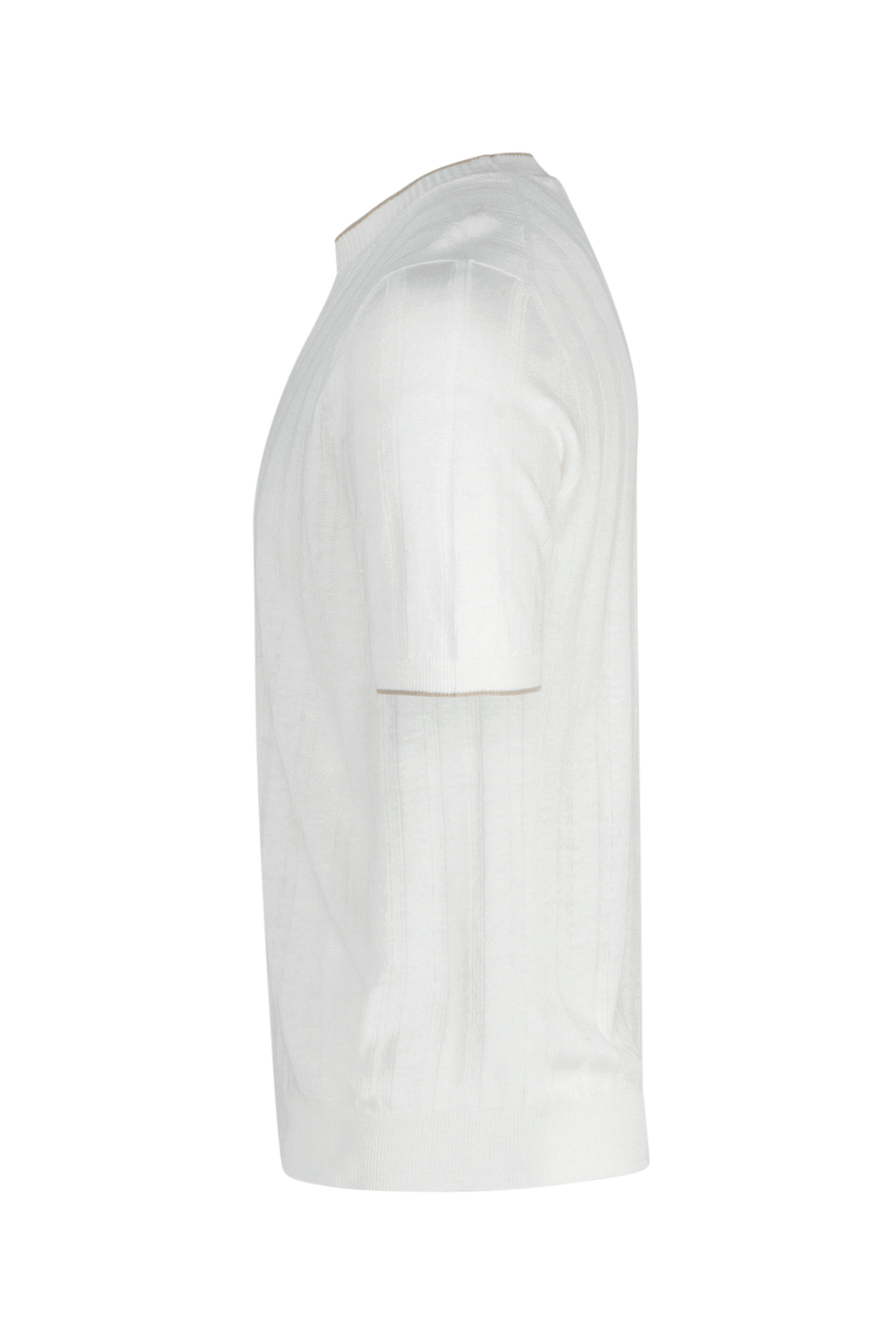 Fedeli Light Brown Crewneck Knit. Crewneck collar. Short sleeves. Ribbed trims. Contrast piping. 12 gauge knit. Pullover style. Made in Italy . 70% linen, 30% cotton.