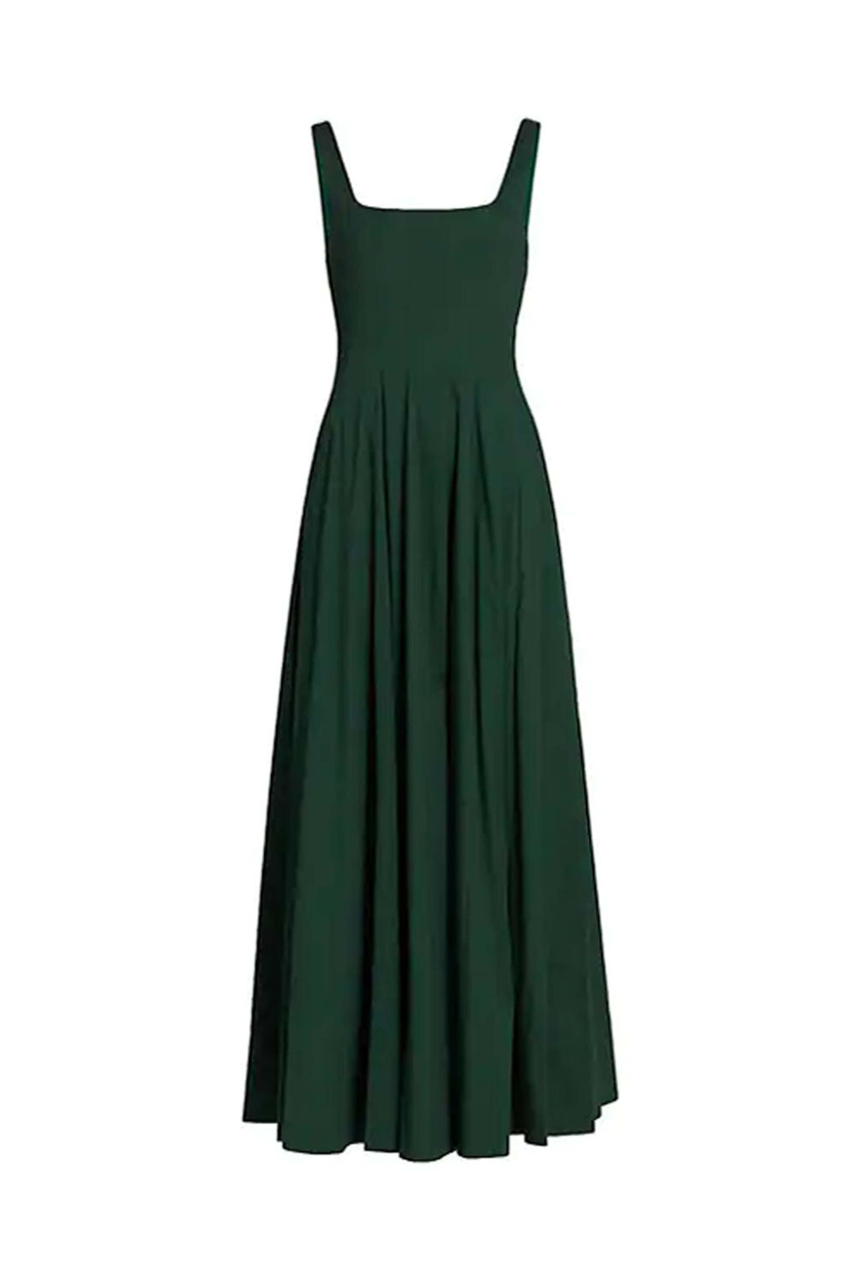 Staud Cypress Poplin Wells Maxi Dress. Square neck. Square back. Sleeveless; thick shoulder straps. Back zip closure. Fit and flare silhouette. Maxi length. 98% cotton, 2% elastane.