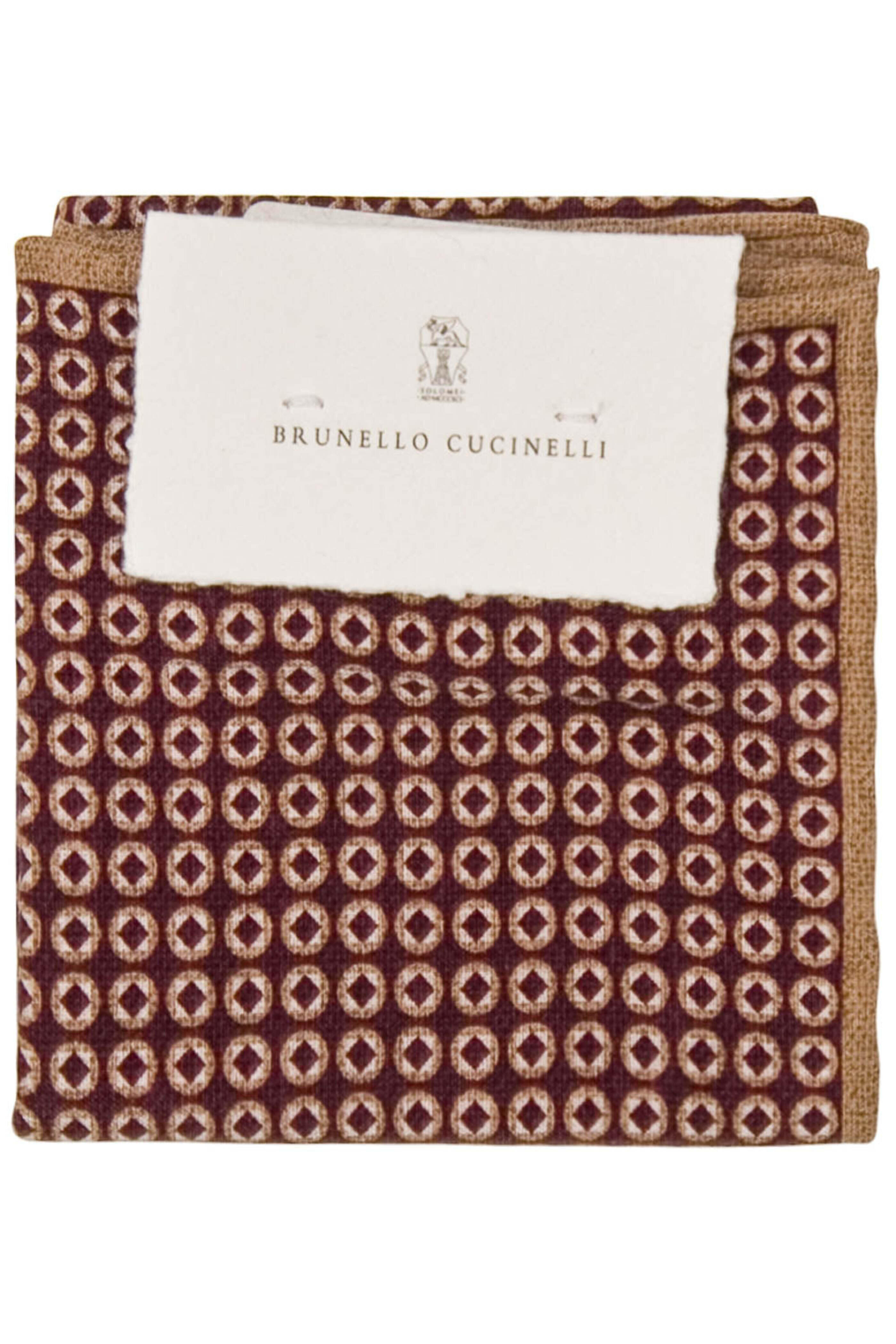 - Brunello Cucinelli Plum and Sand Geometric Pocket Square Pick stitch detailing 14 X 14 100% silk Made in Italy