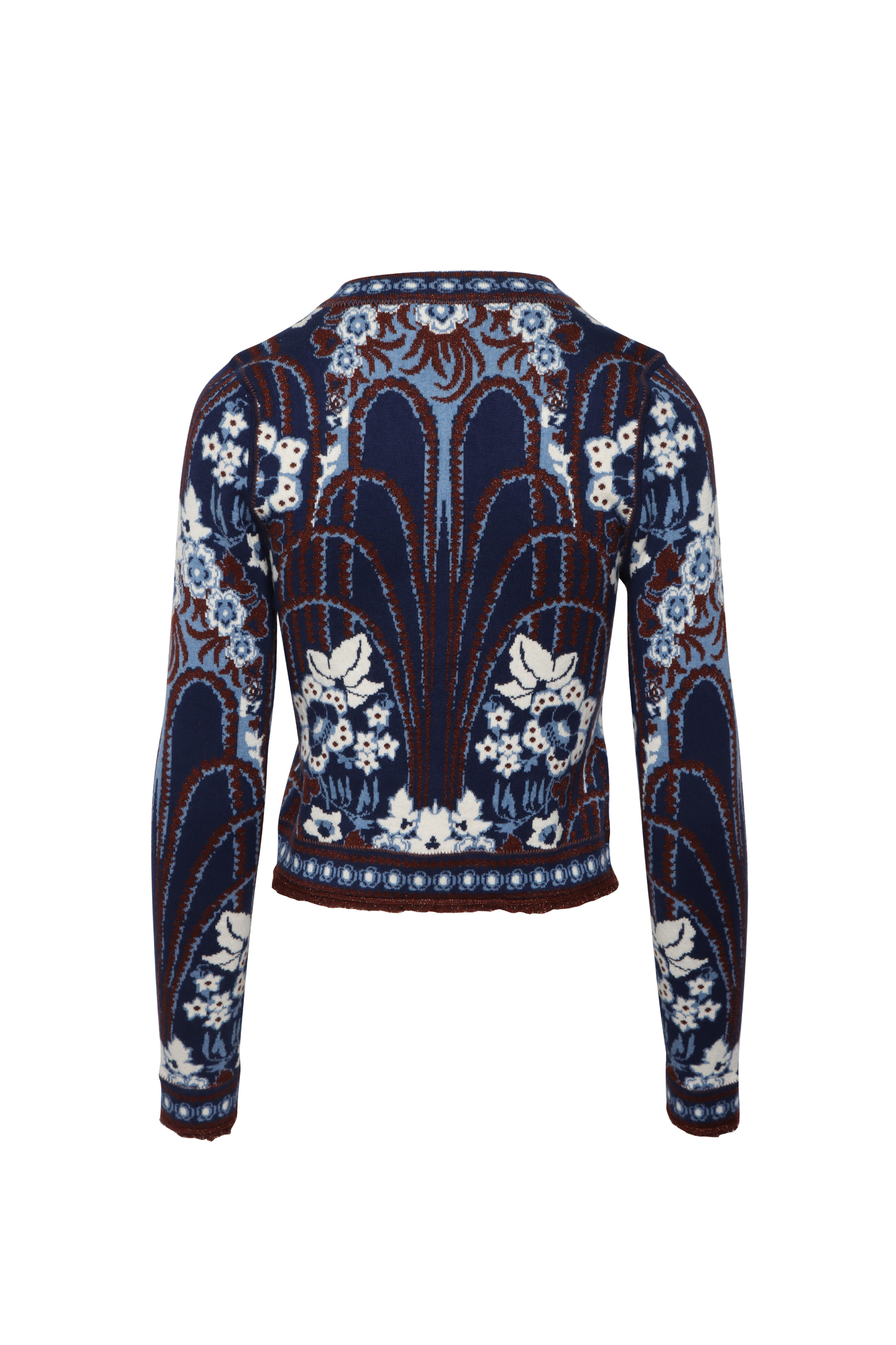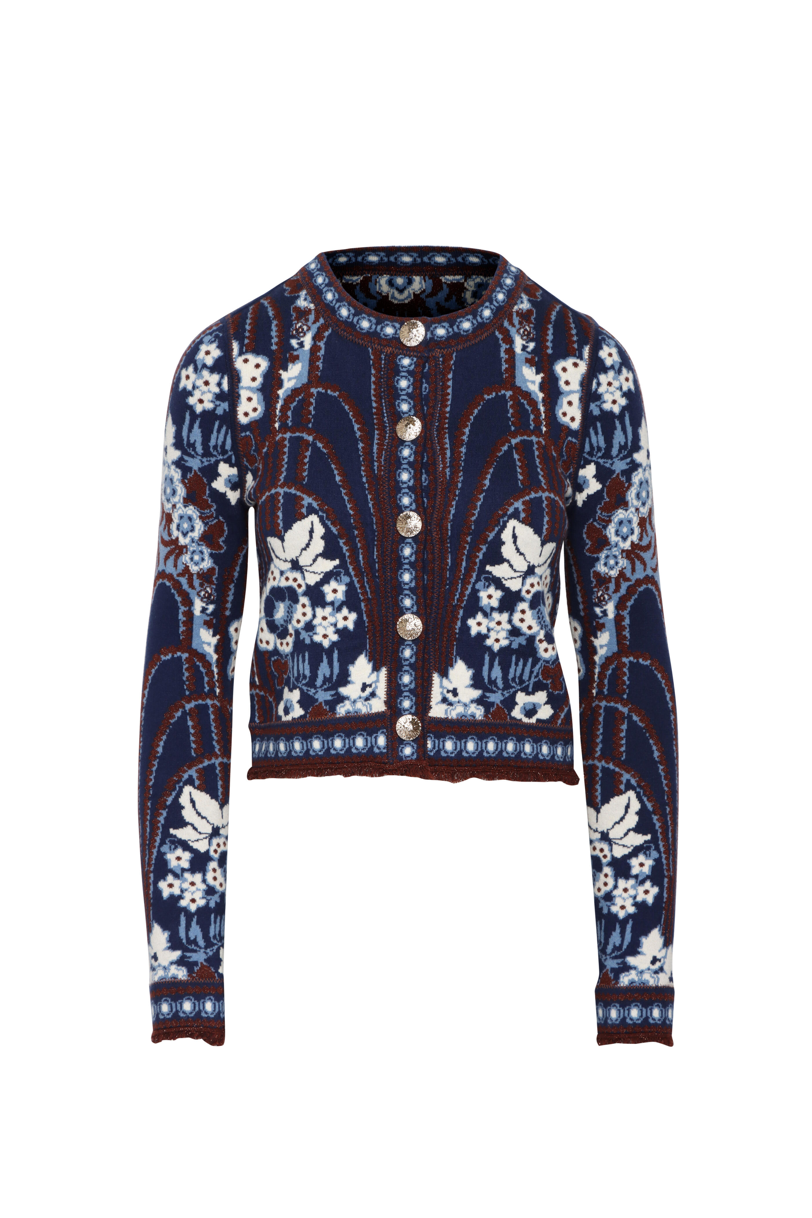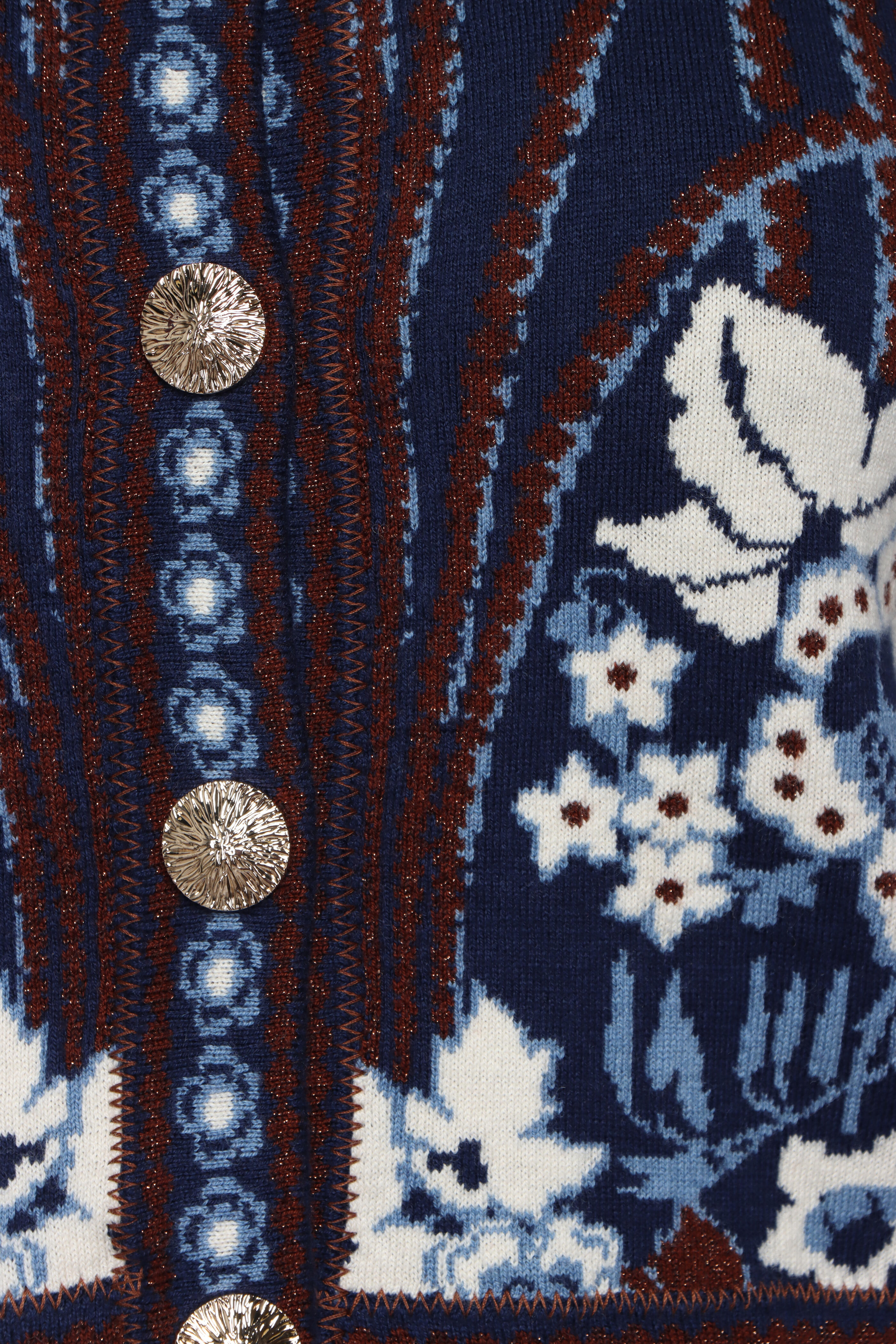 Round neck. Long sleeves. Front button closure. Tailored fit. Stretch jacquard fabrication. Imported. 54% merino wool, 43% cotton, 2% polyester, 1% metallic fibers. Dry clean.