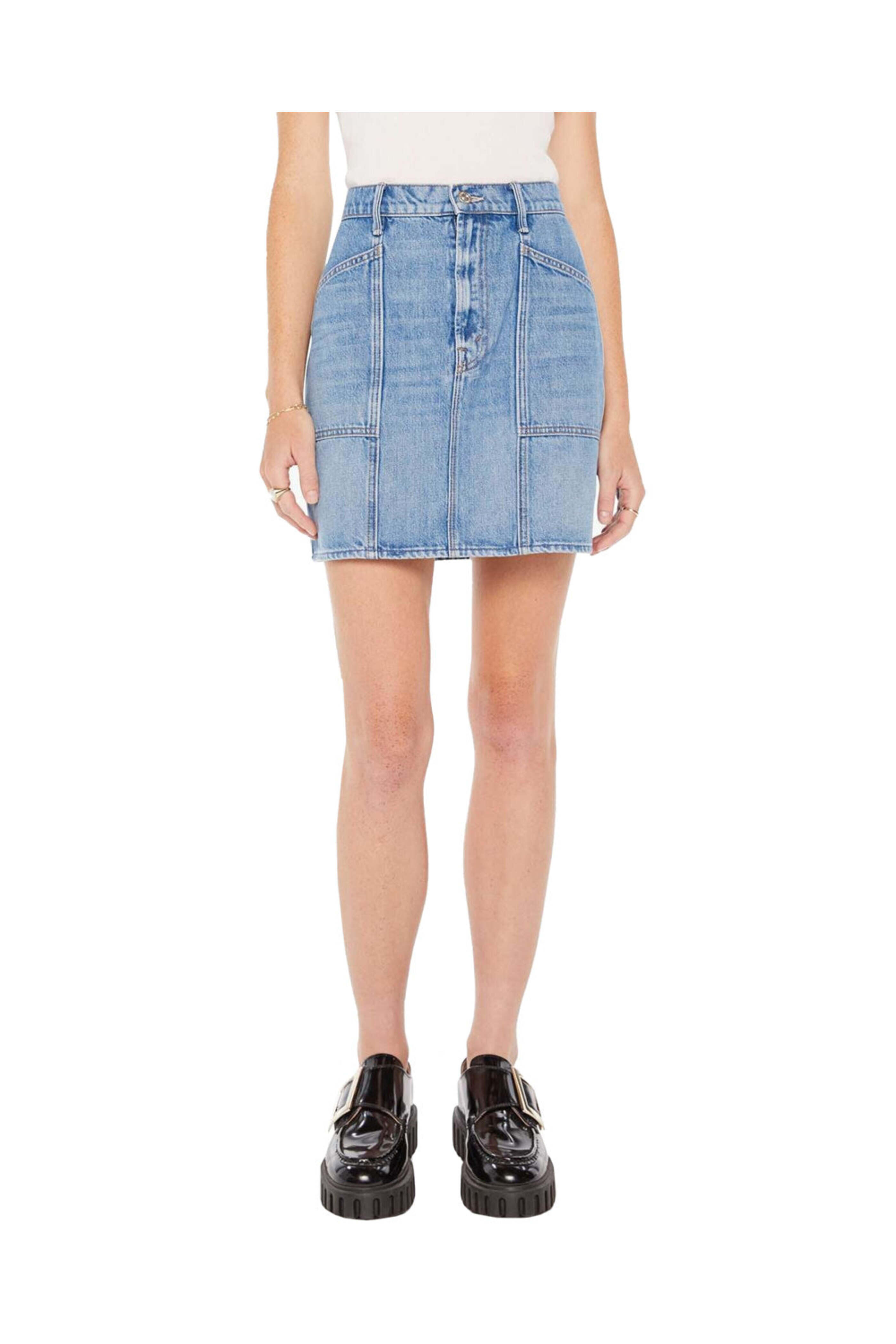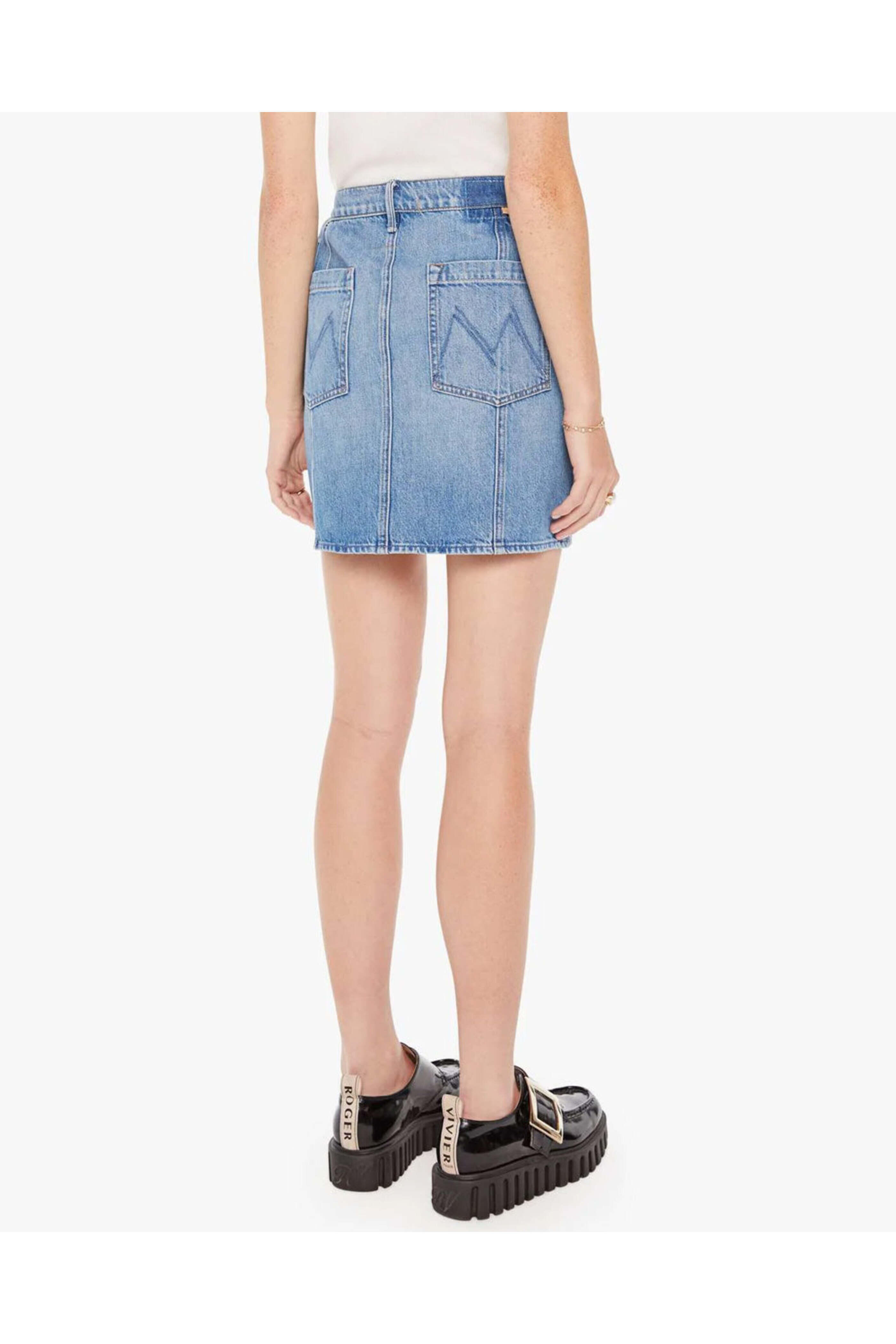 Mother The Lineup Swooner Mini Skirt in Love Line. High rise. Button closure. Zip fly. Belt loops. Front patch pockets. Back patch pockets. Mini length. Rigid denim fabrication. Made in LA. 100% cotton.