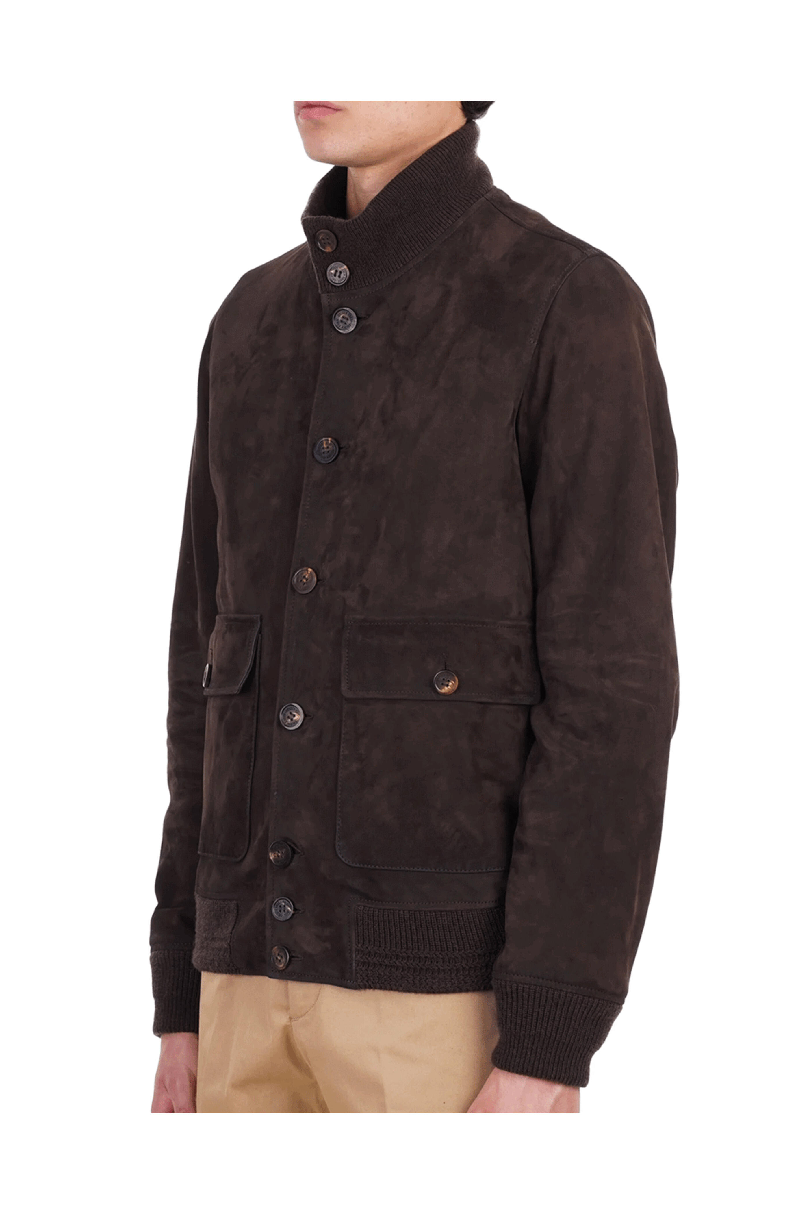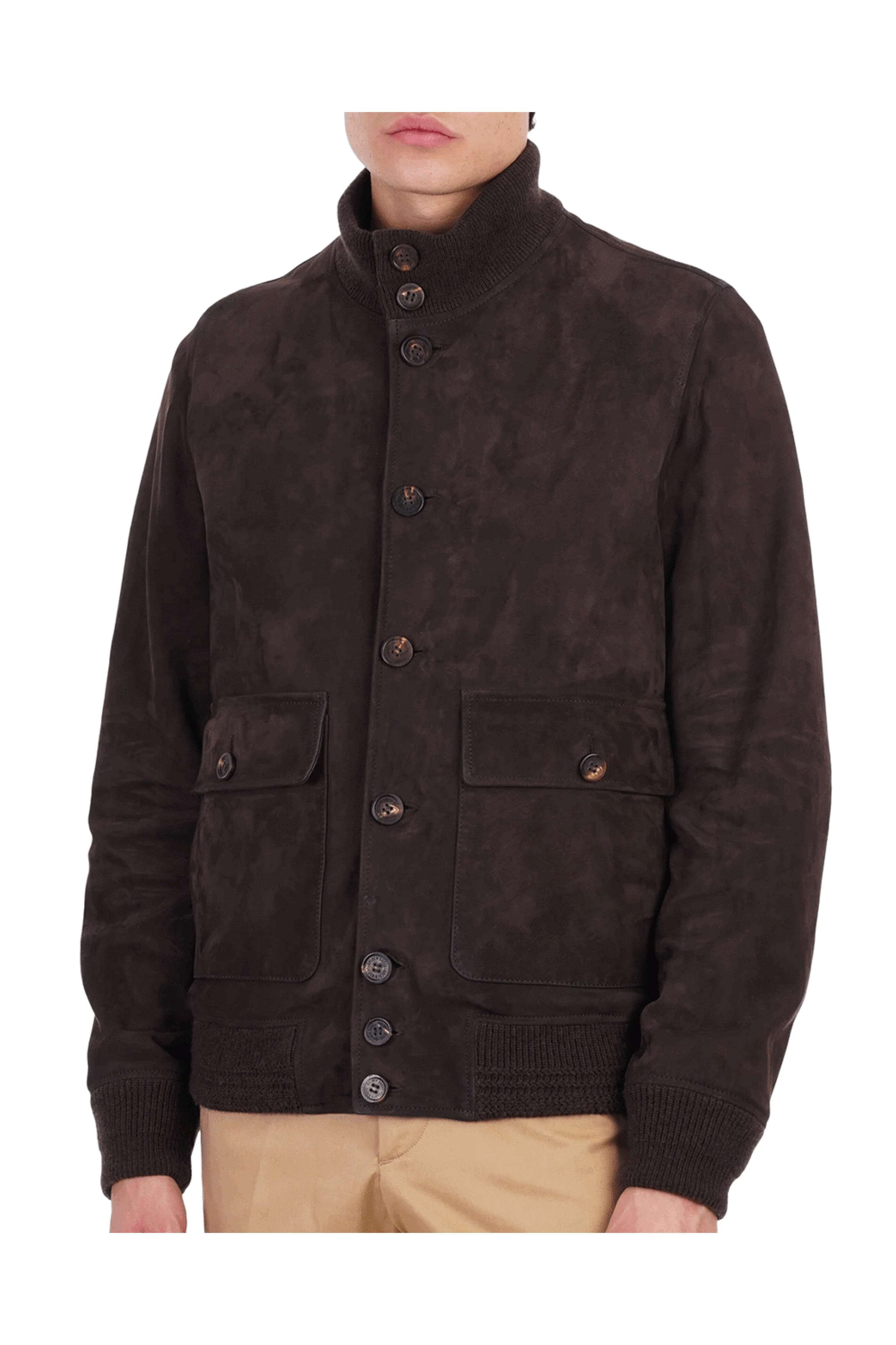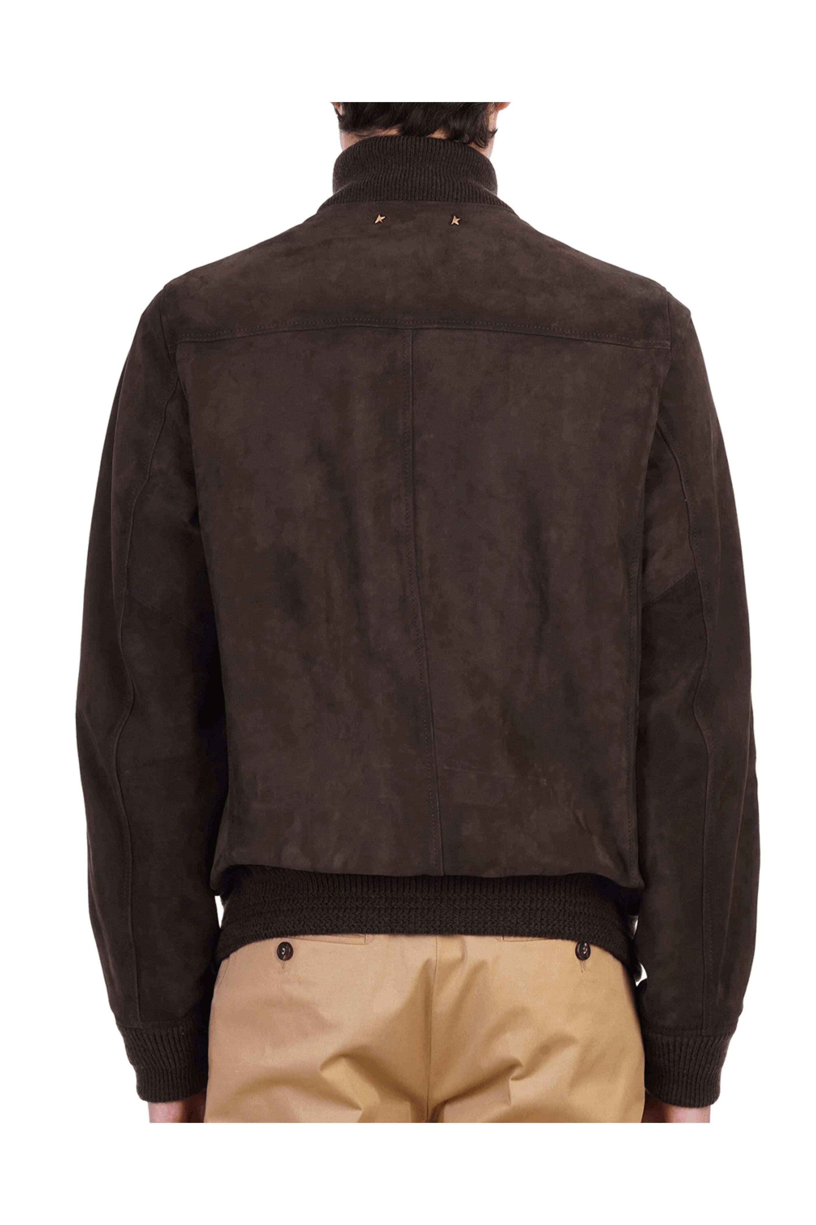 Golden Goose Brown Suede Flight Jacket. Stand collar. Button down front. Oversized waist flap pockets with button closure. Long sleeve. Ribbed trims. Tonal stitching. Straight hem. Relaxed fit. Lined with viscose. Made in Italy. 100% sheepskin leather.