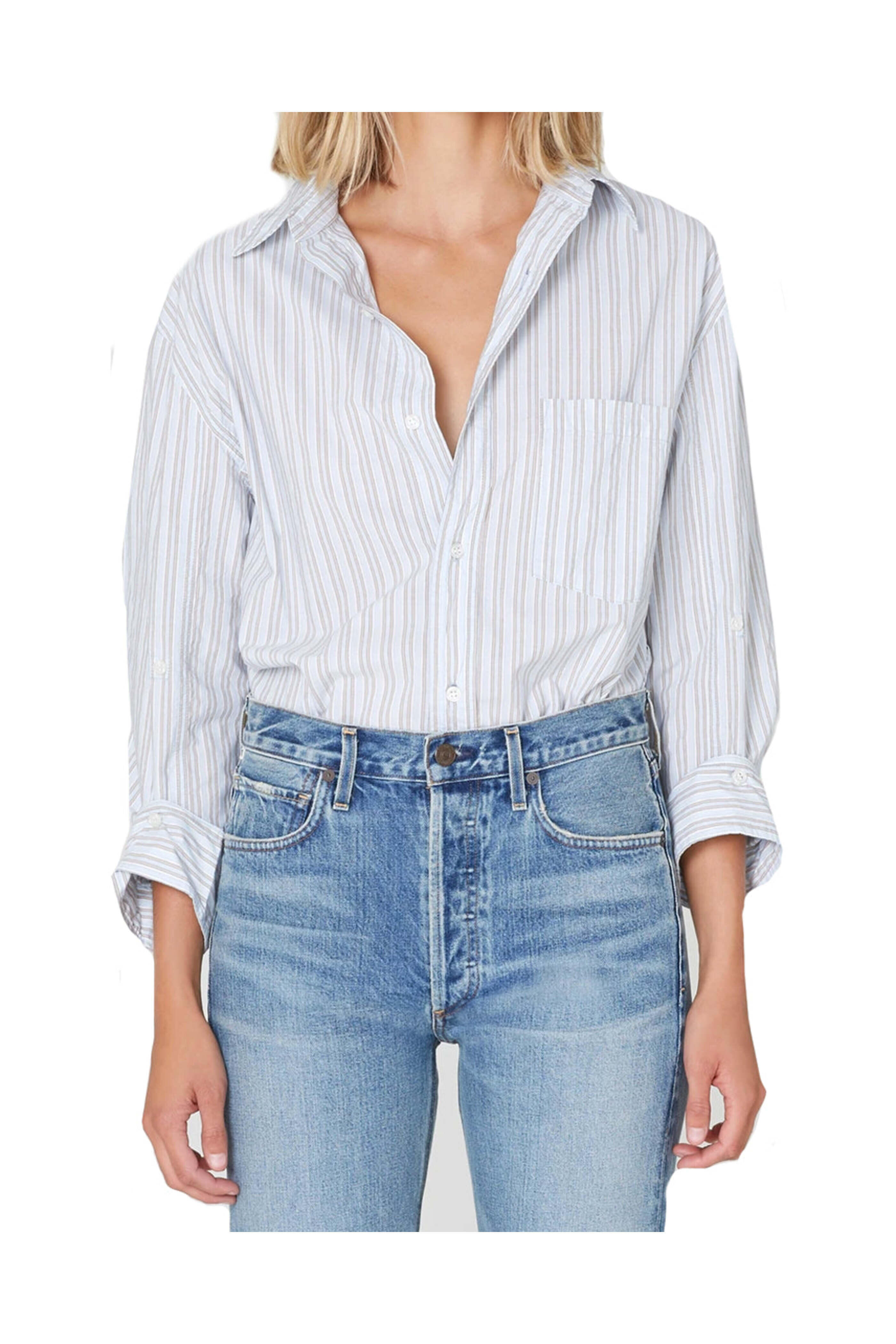 - Citizens of Humanity Kayla Shirt in Liberty Stripe Collared Button down front closure ¾ length sleeves; triple button cuffs Button fastening for rolled sleeves Single front chest pocket High-low hem Loose fit 100% cotton