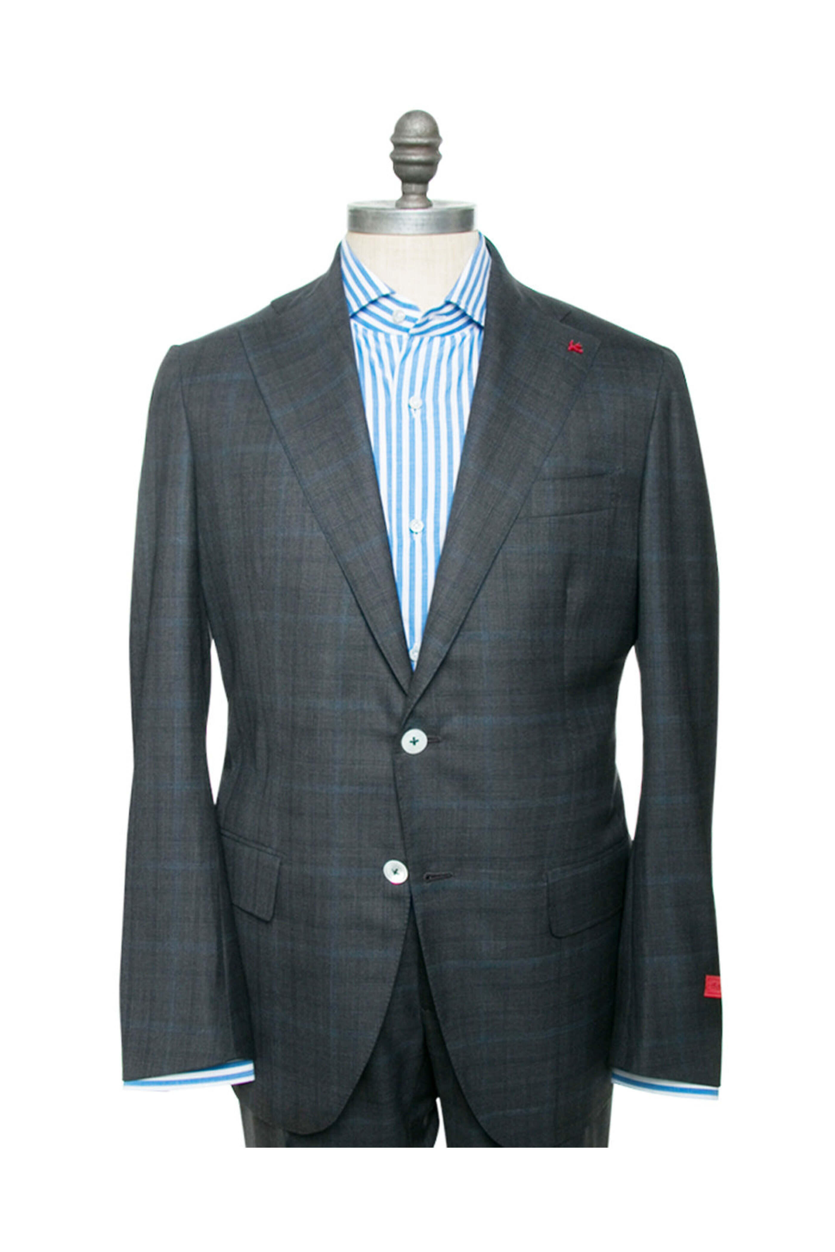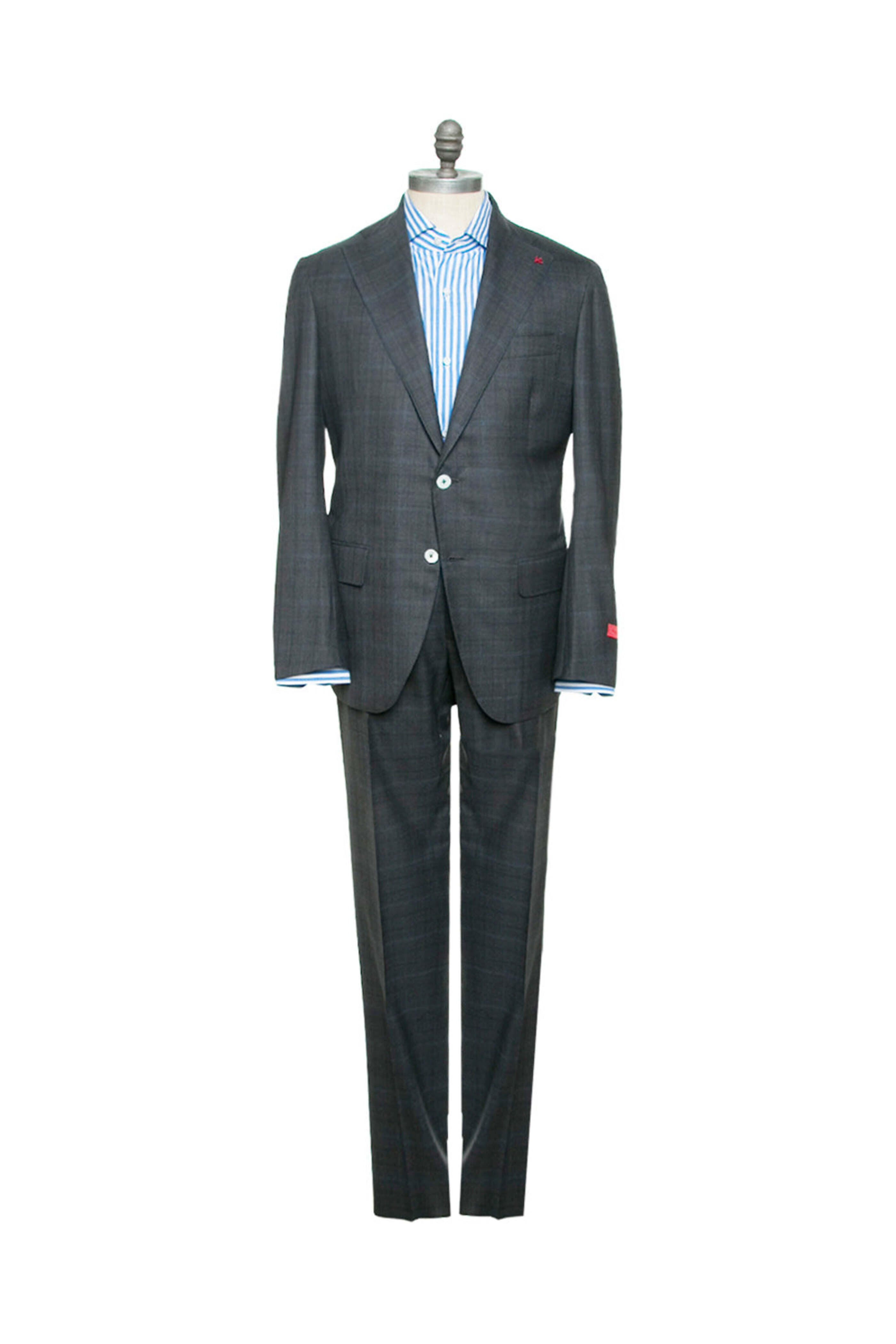 Isaia Grey Musa Wool Suit. Two button jacket. Notch lapel. Pick stitch detailing. Front left chest pocket. Flap waist pockets. Interior jacket pockets. Cupro lining. Double back vents. Flat front pant. Zip fly. Four button closure. Angled waist pockets. Coin pocket. Double welt button back pockets. 10 rise. 8 hem opening. Made in Italy. 100% wool.