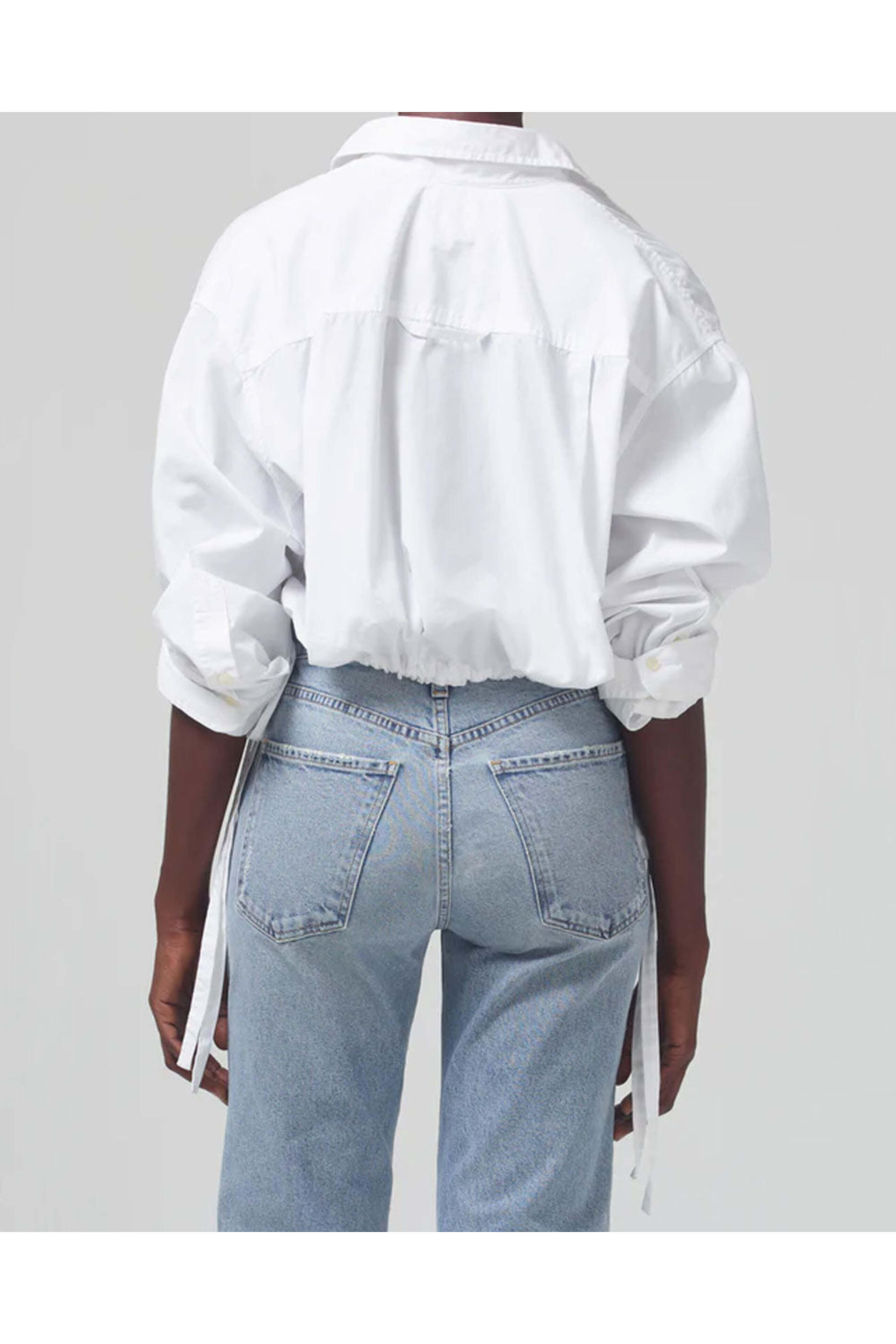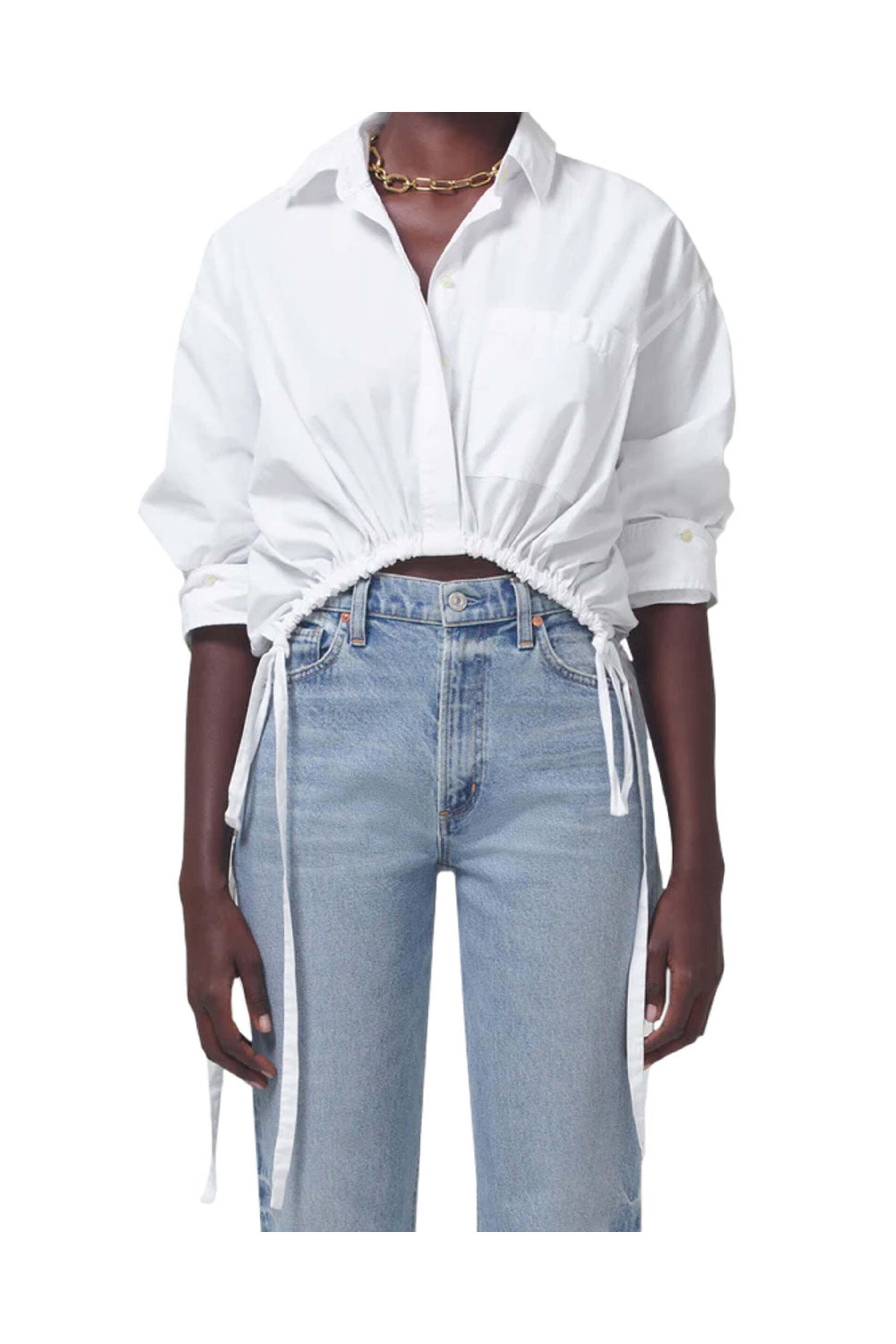 Citizens of Humanity White Drawstring Alexandra Shirt. Collar. V neck. Long sleeves; button cuffs. Concealed front button placket. Single chest patch pocket. Adjustable self-tie drawstring hem. Boxy fit. Cropped length. Made in USA. 100% cotton.