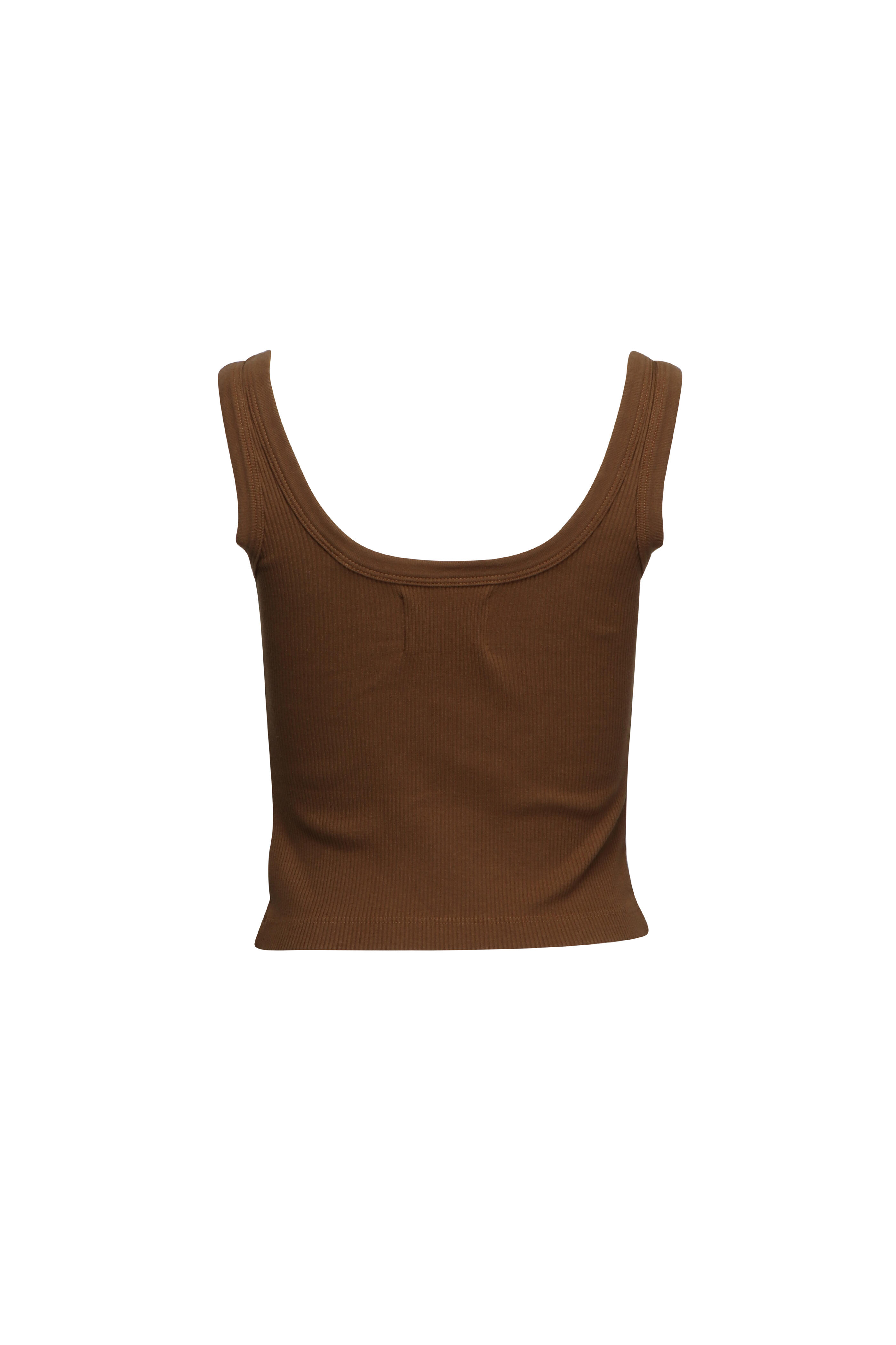 Scoop neck. Scoop back. Sleeveless. Slim silhouette. Cropped length. Ribbed knit fabrication. Made in USA. Bust 26.5” (Size S). Waist 25” (Size S). Length 19.5” (Size S). 49% organic cotton, 49% lyocell, 2% spandex. Machine washable.