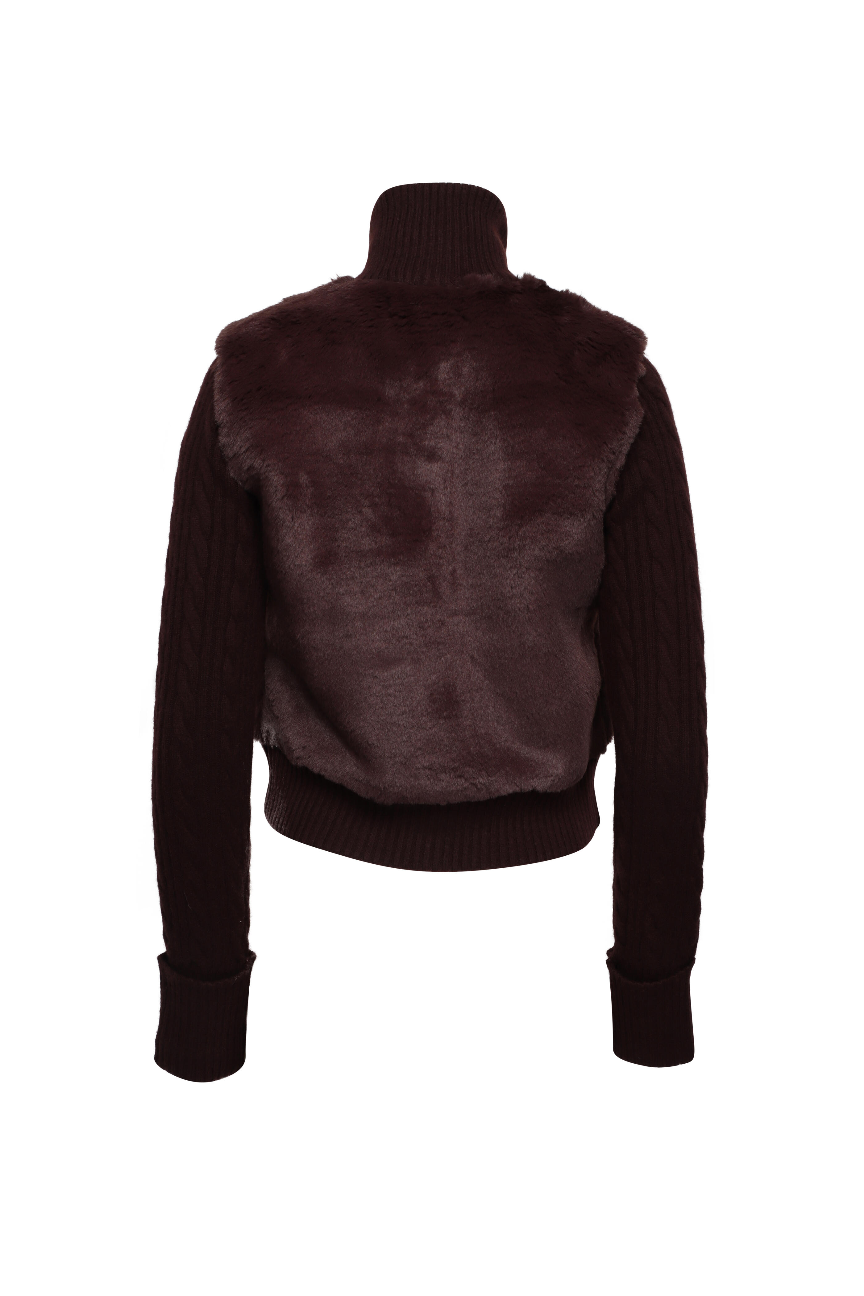 Turtleneck. Long sleeves. Button up front closure; statement snap button detail. Faux fur detail. Cable and rib knit fabrication. Imported. 70% wool, 30% cashmere. Dry clean.
