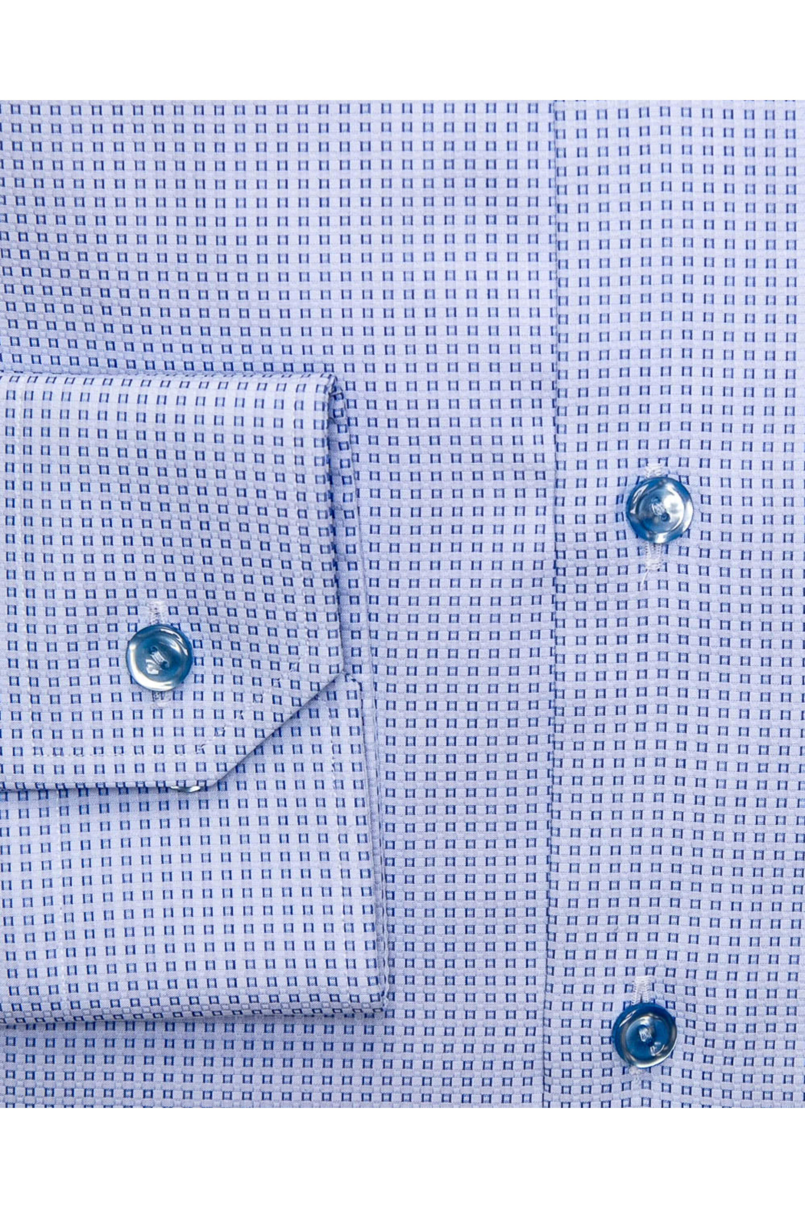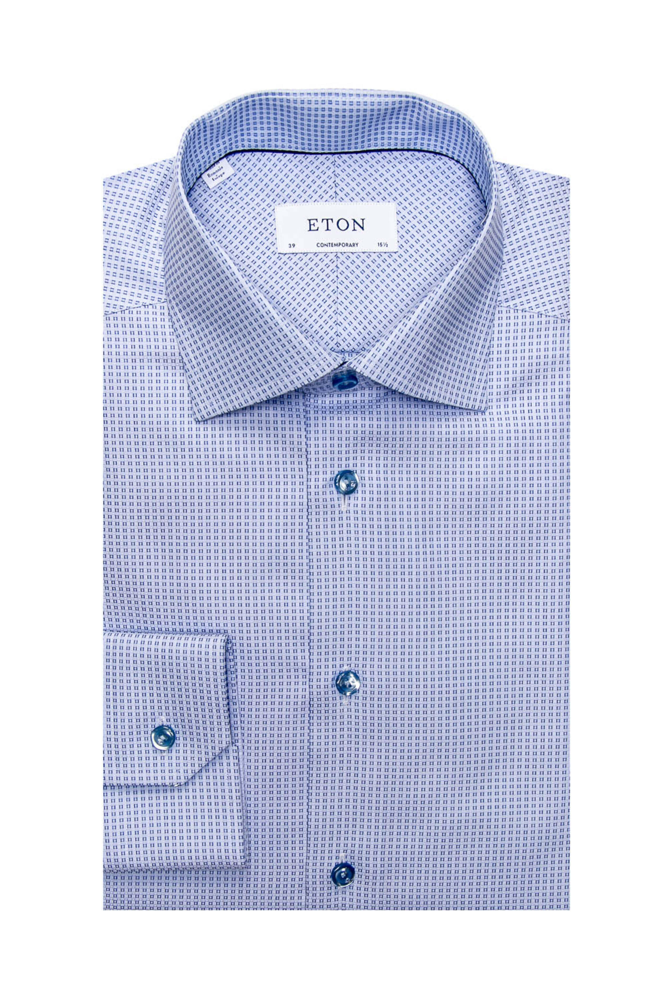 - Eton Blue Micro Geometric Dress Shirt Contemporary fit Point collar Mitered cut cuff Single button cuff 100% cotton Made in Europe