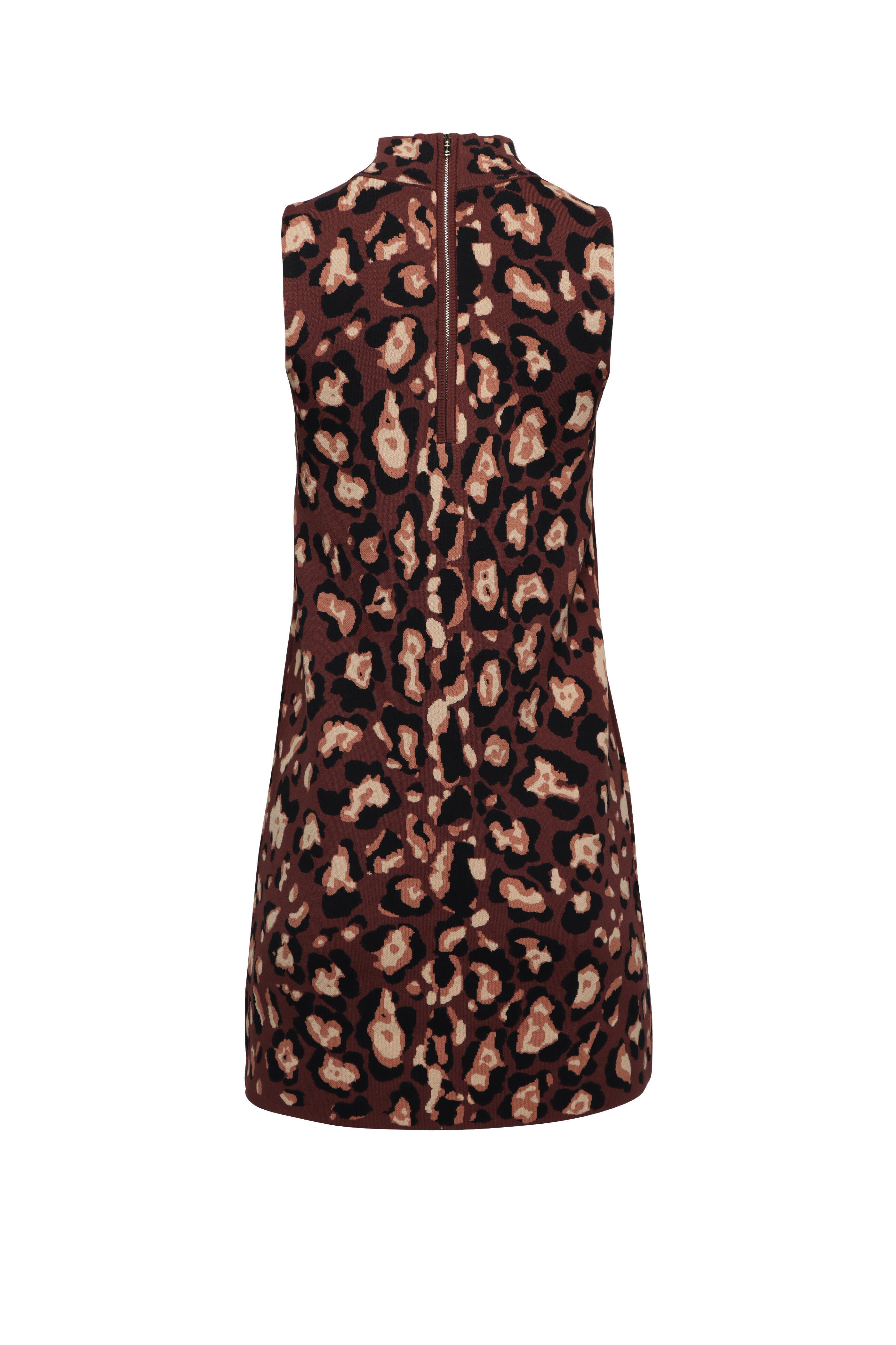 Mockneck. Sleeveless. Back zip closure. Shift silhouette. Jacquard knit fabrication. Imported. Mini length. 63% viscose, 37% nylon. Dry clean.