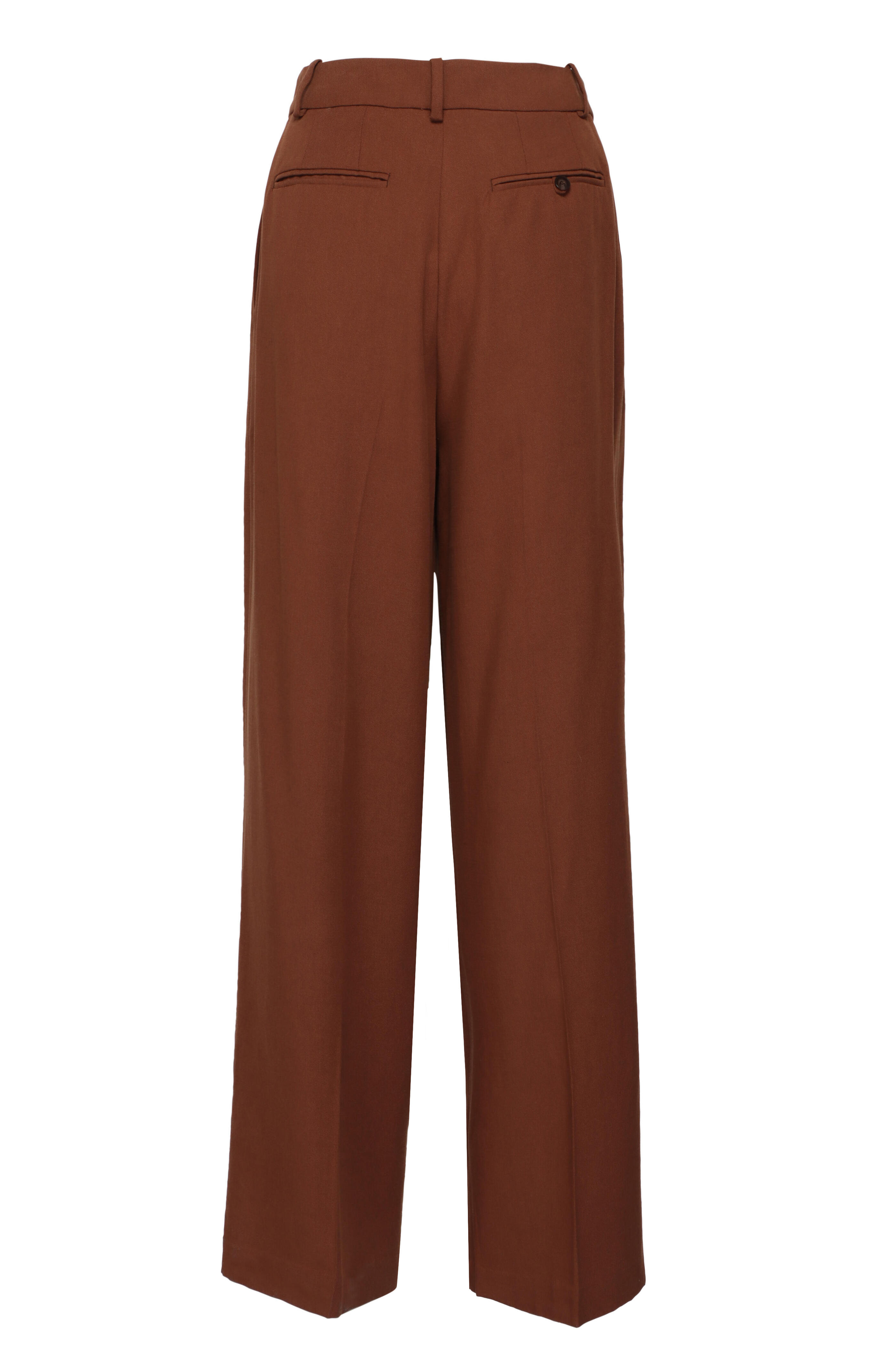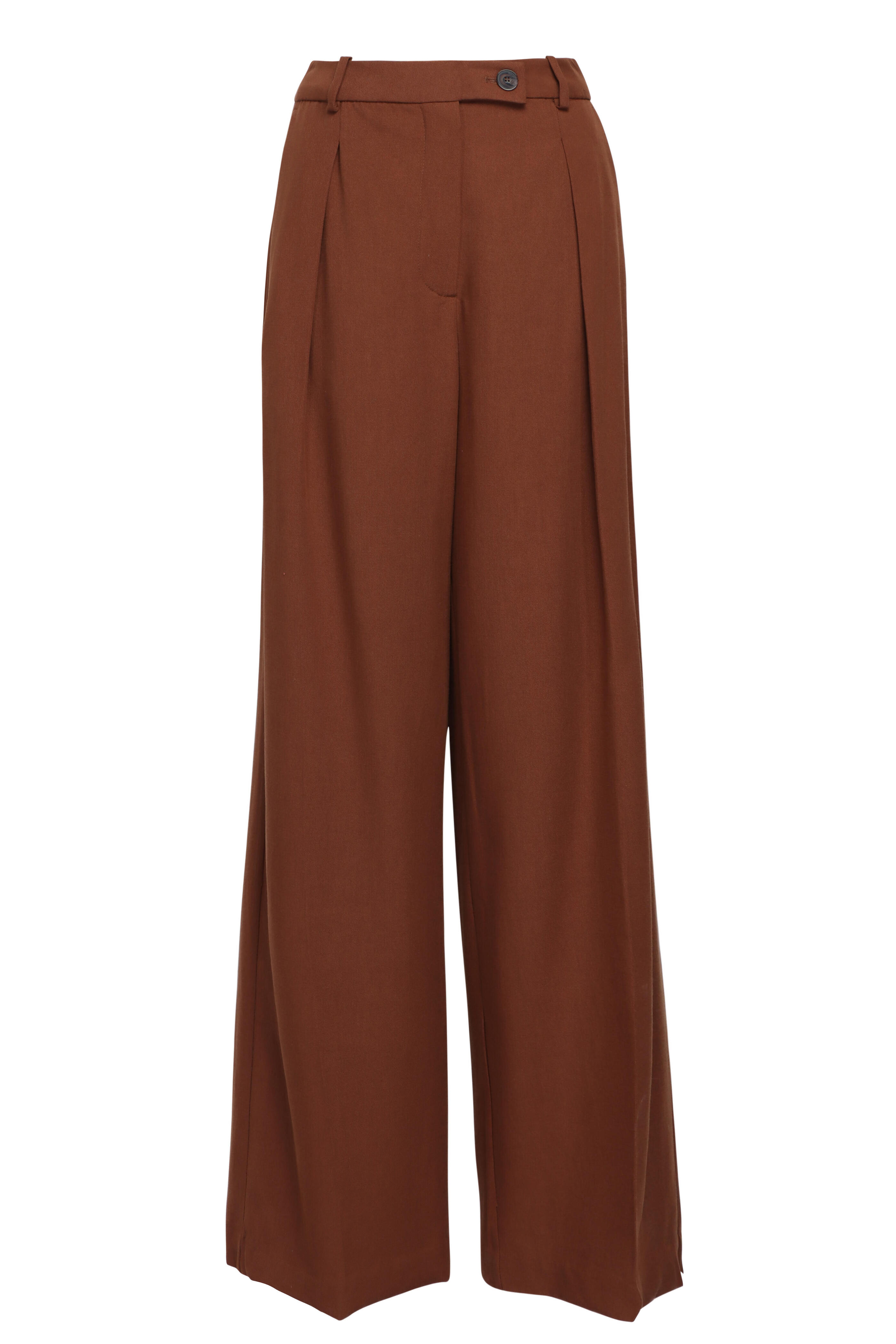 High rise. Button tab closure. Zip fly. Belt loops. Side slip pockets. Back welt pockets. Pleat front detail. Wide through leg. Made in Italy. Inseam 31.5” (US 4). Full length. 83% lyocell, 17% wool. Dry clean.
