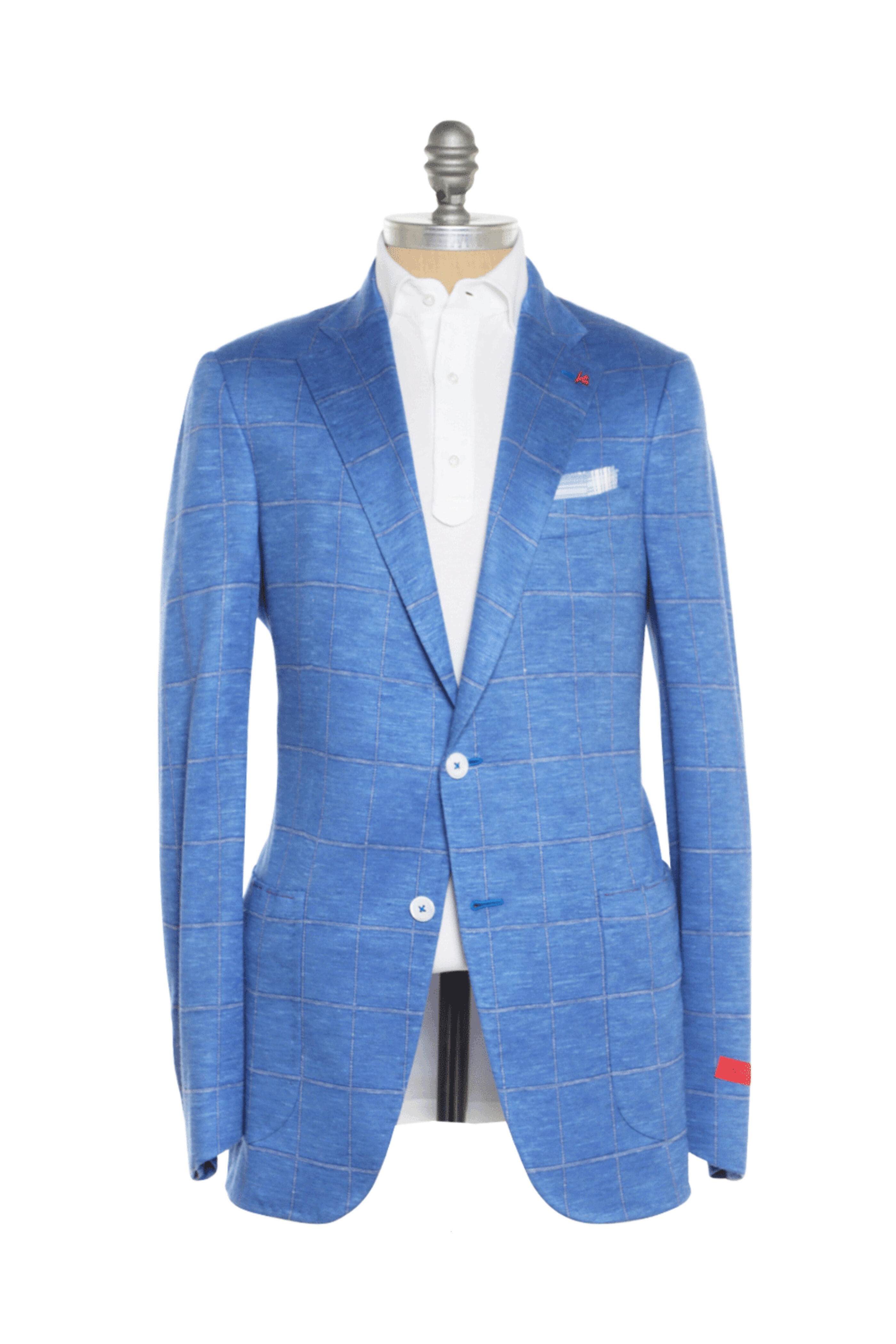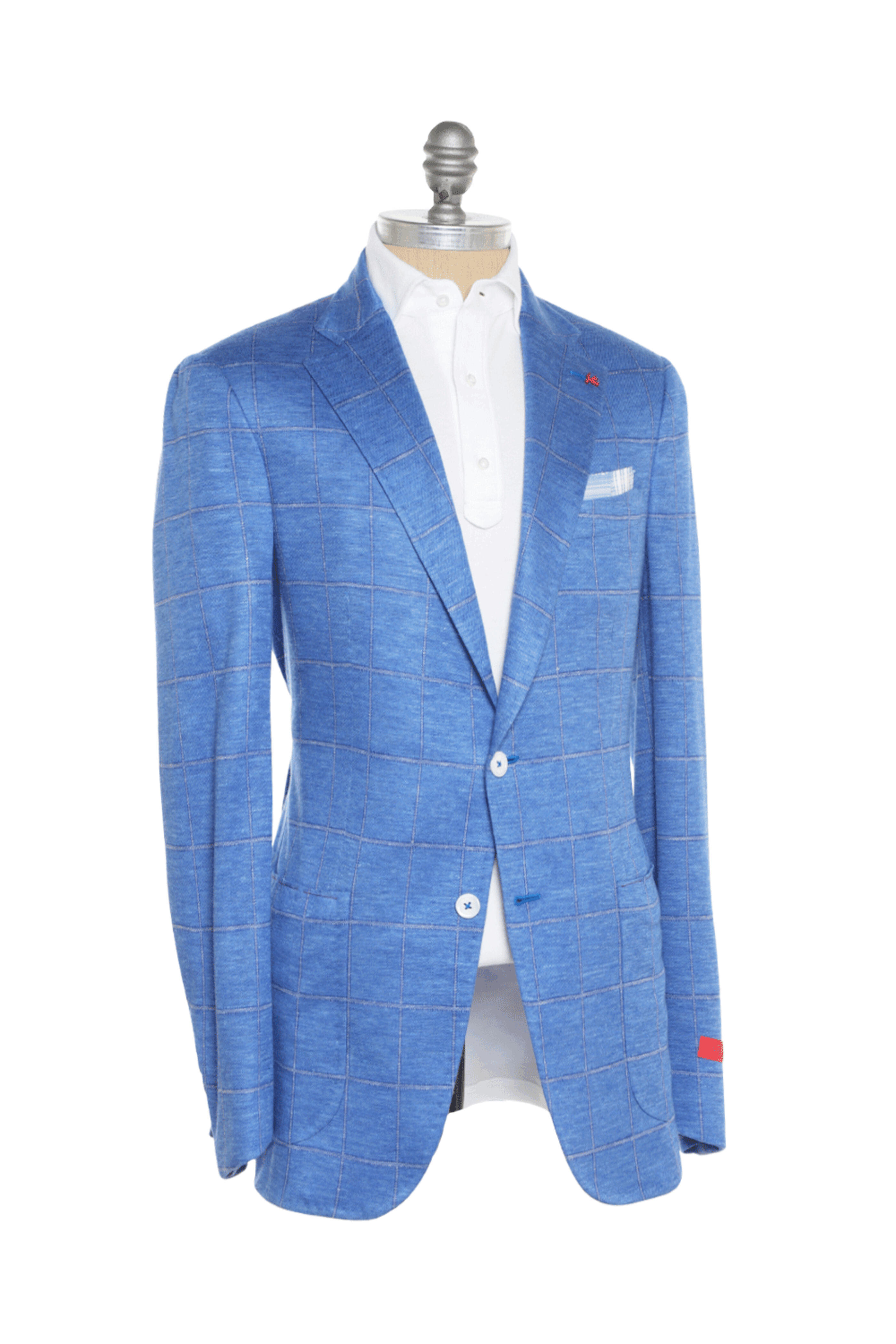 Isaia Cobalt and Light Blue Windowpane Stretch Sportcoat. Notch lapels. Two button jacket. Front left chest welt pocket. Waist patch pockets. Signature Isaia lapel pin. Double back vents. Unfinished buttonholes. Pick stitch detailing. Drop: 8. Quarter-lined. Cupro lining. 40% wool 40% silk 20% linen.