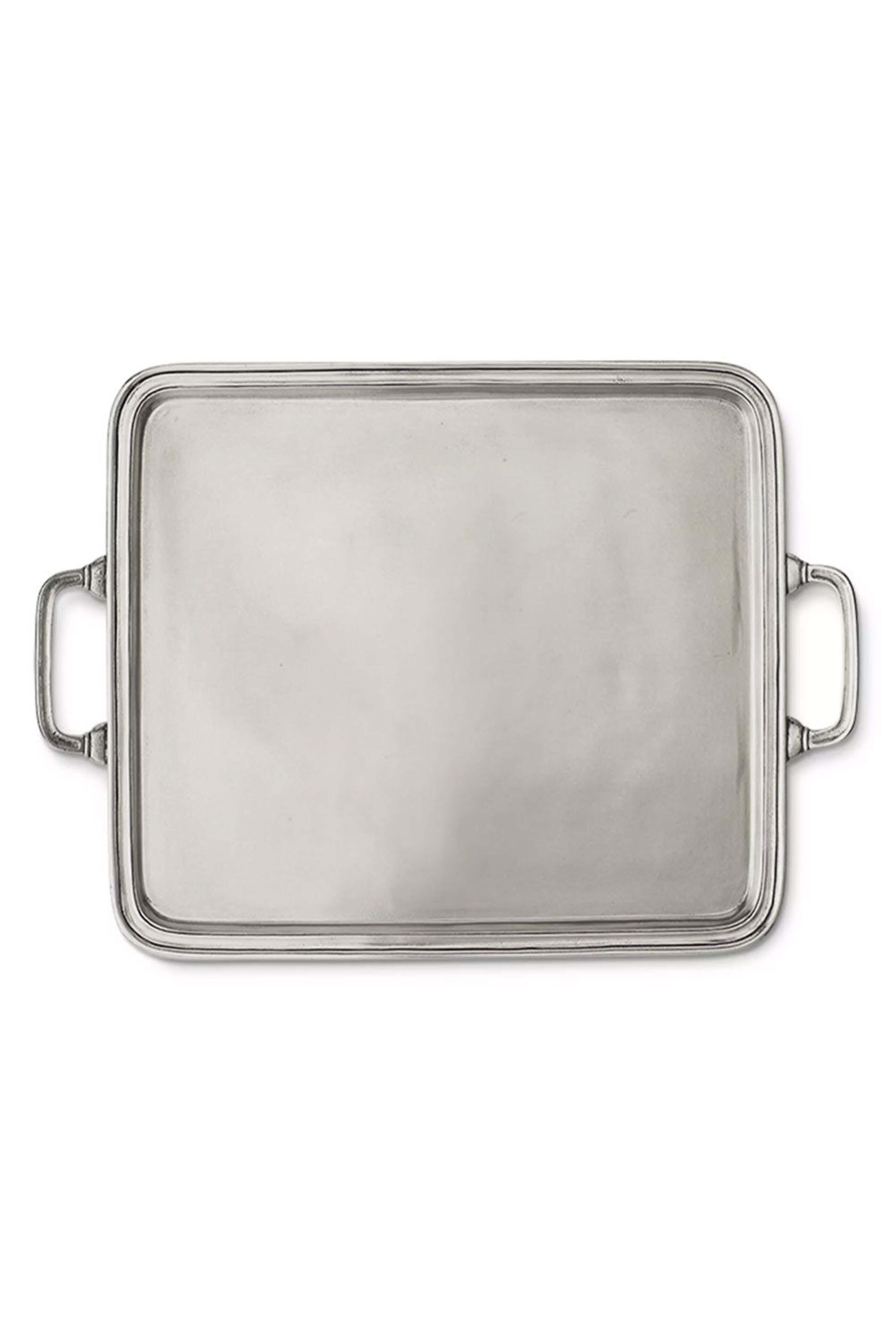 Match Large Rectangular Handled Tray. Pewter. Handcrafted rectangular tray with handles. Wipe clean. 12.25W x 15L. Made in Italy.