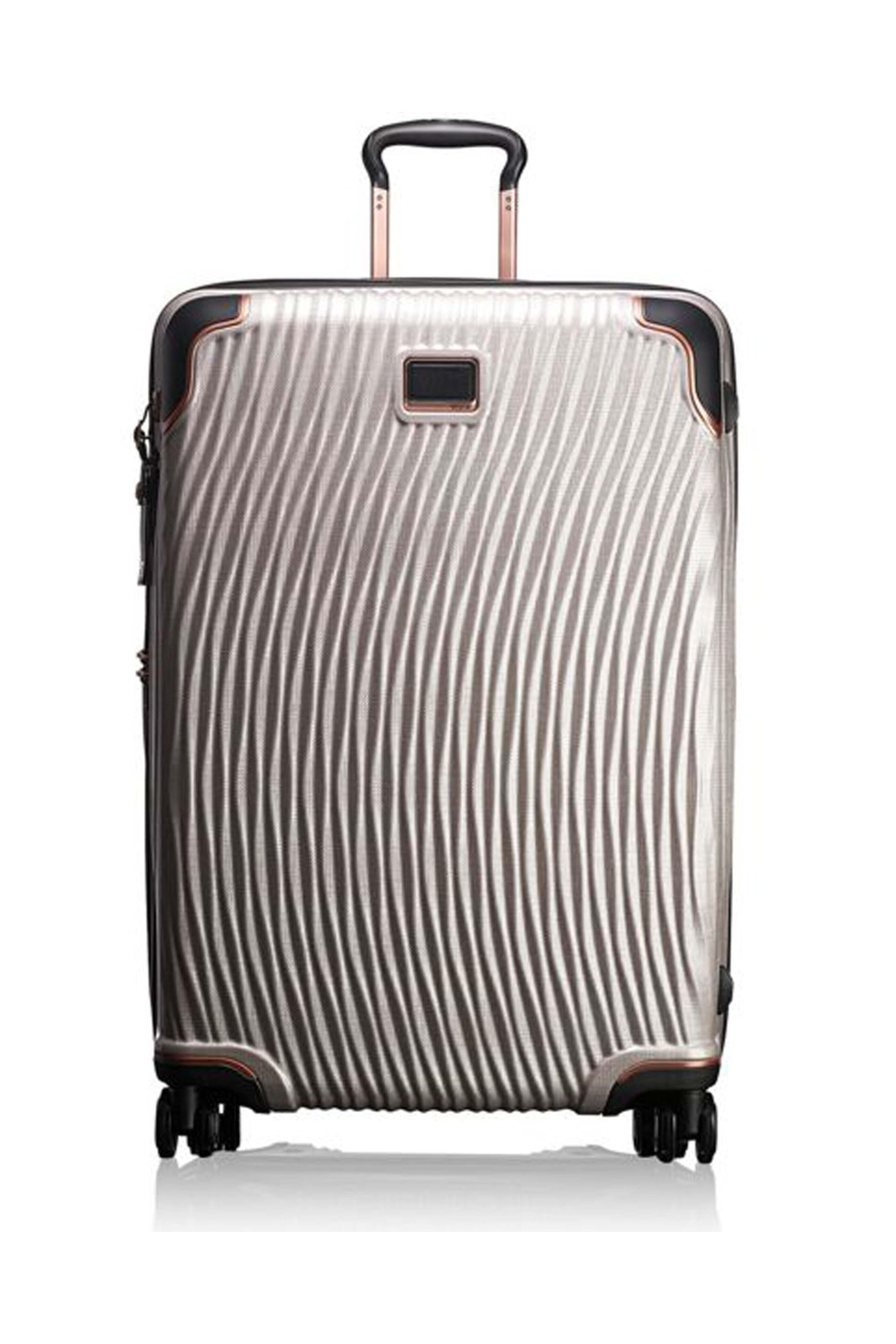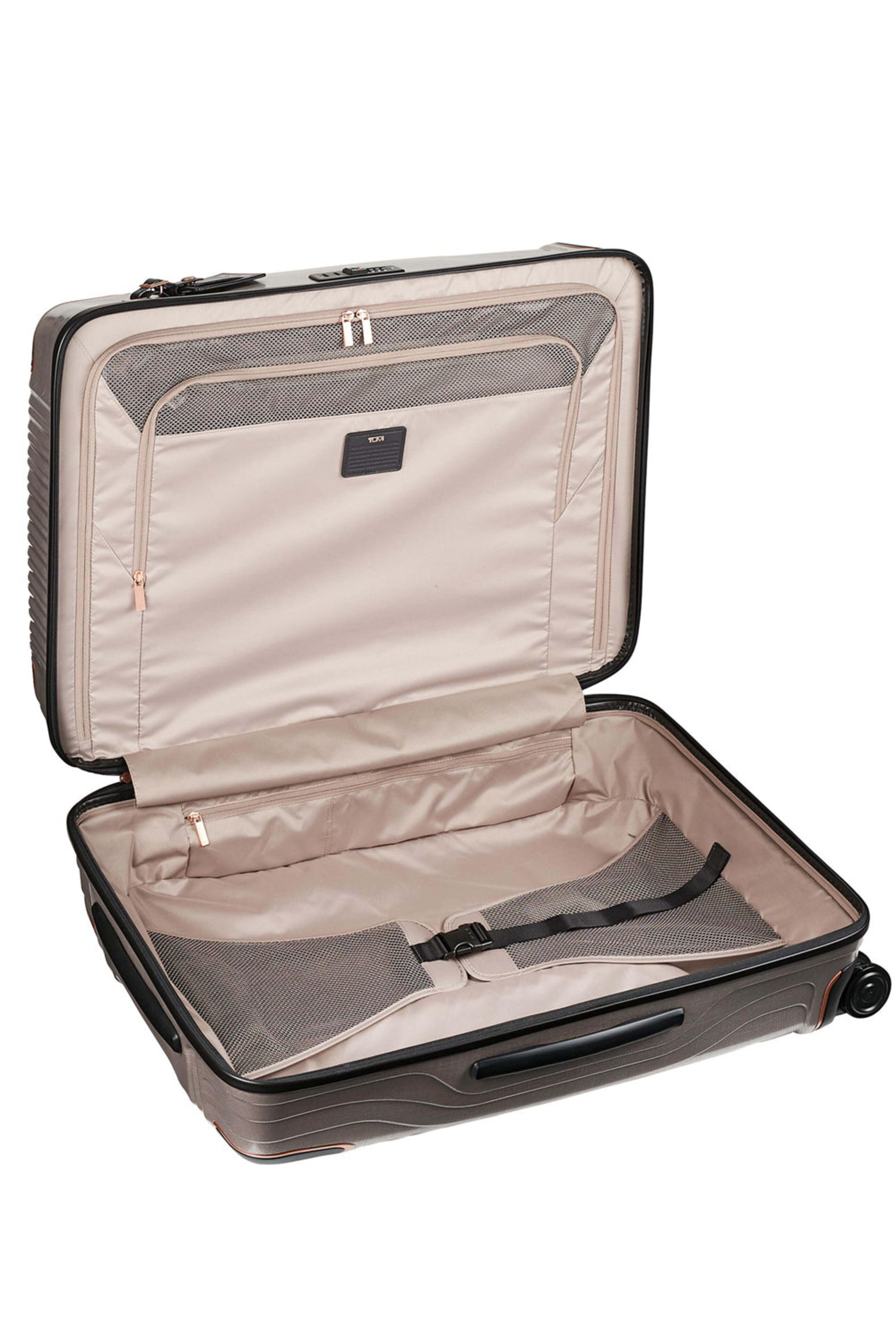 Tumi Blush Latitude Extended Trip Packing Bag. Best seller. Zip entry to main compartment. Integrated low-profile TSA lock. 3-stage telescoping handle. 4 lightweight spinning wheels. Two interior packing compartments. Interior hanger bracket. Interior mesh tie-down straps. Interior zip pockets. Interior mesh zip pocket. Fully lined. H: 30 in, W: 20 in, D: 12 in. Weight: 9 lbs.