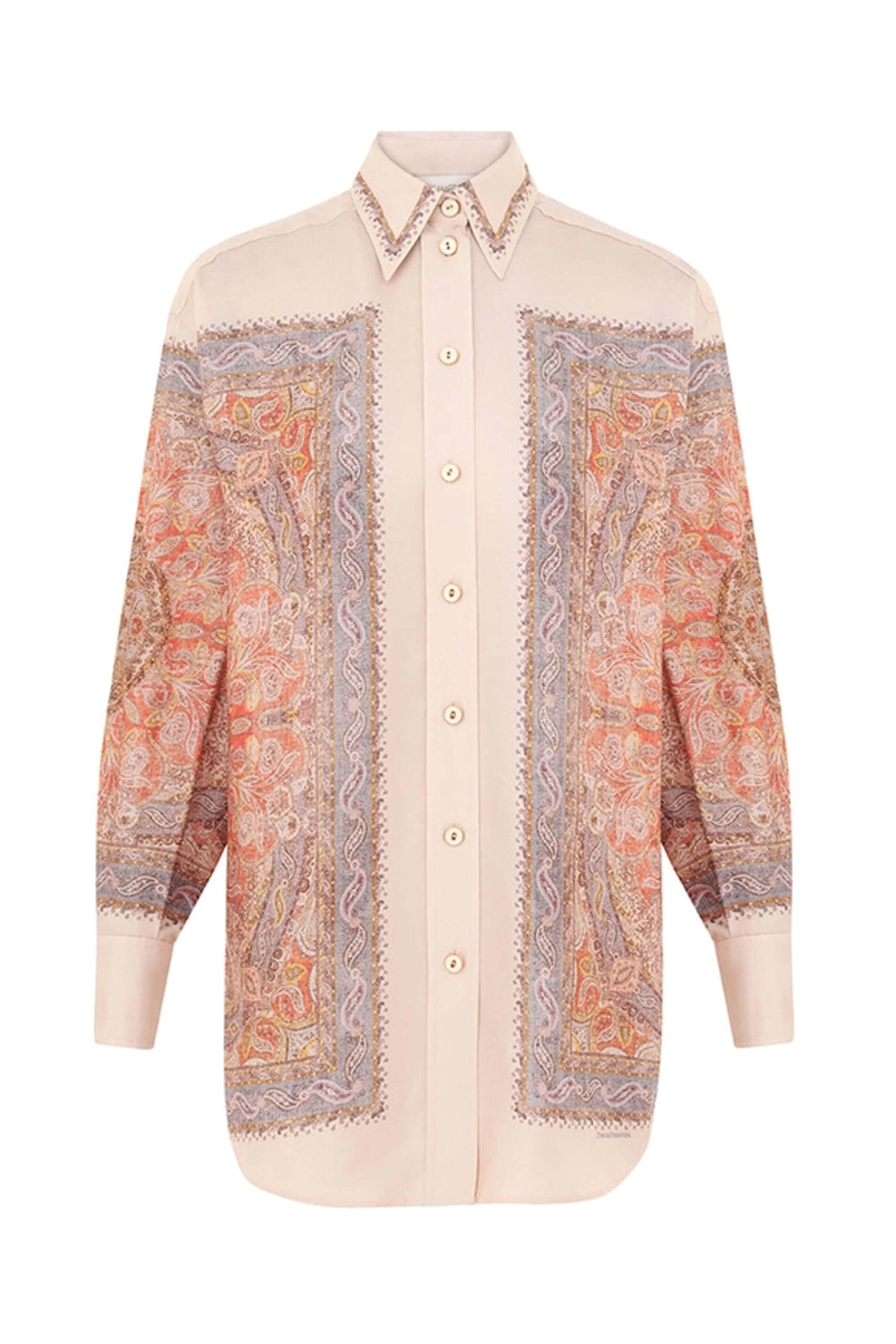 Zimmermann Paisley Haze Illustration Shirt. Collar. Drop shoulders. Long sleeves; button cuffs. Button down front closure. Oversized fit. Rounded hem. 100% silk.