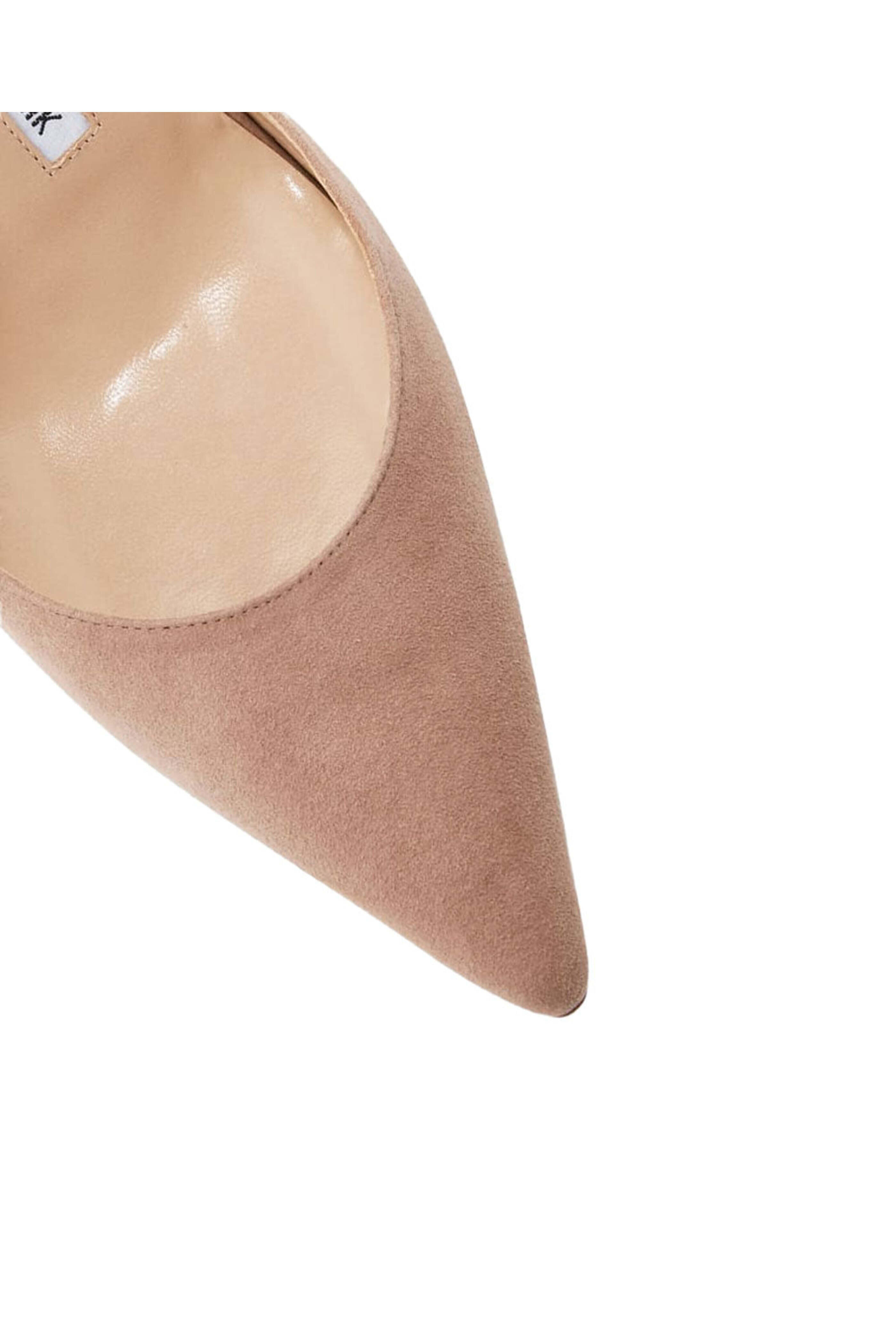 Manolo Blahnik Carolyne 70 in Beige. Pointed toe. Slingback strap with stretch inset. Outer: calf suede. Lining: calf leather. 70 mm/2.8" covered heel. Italian sizing. Made in Italy.