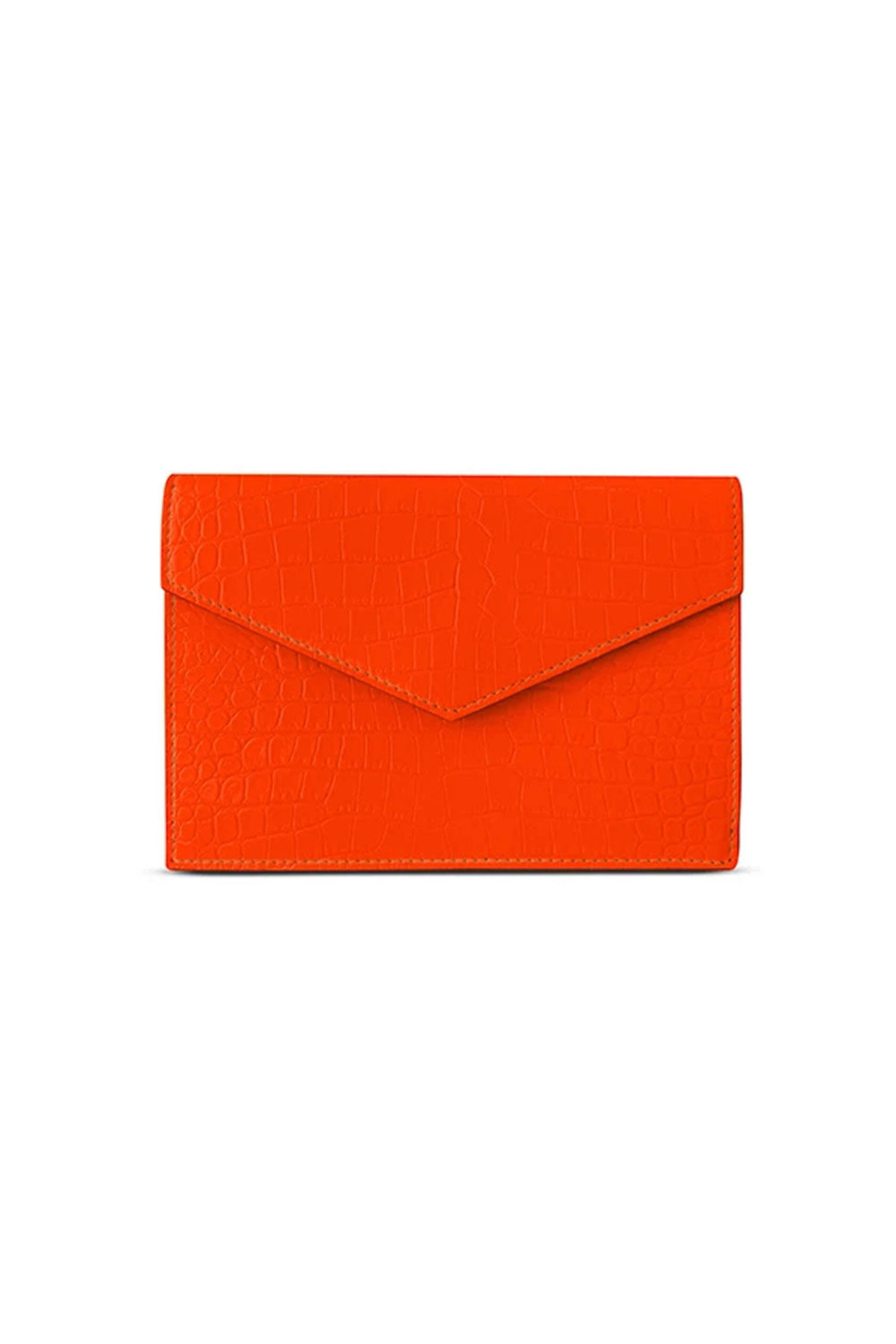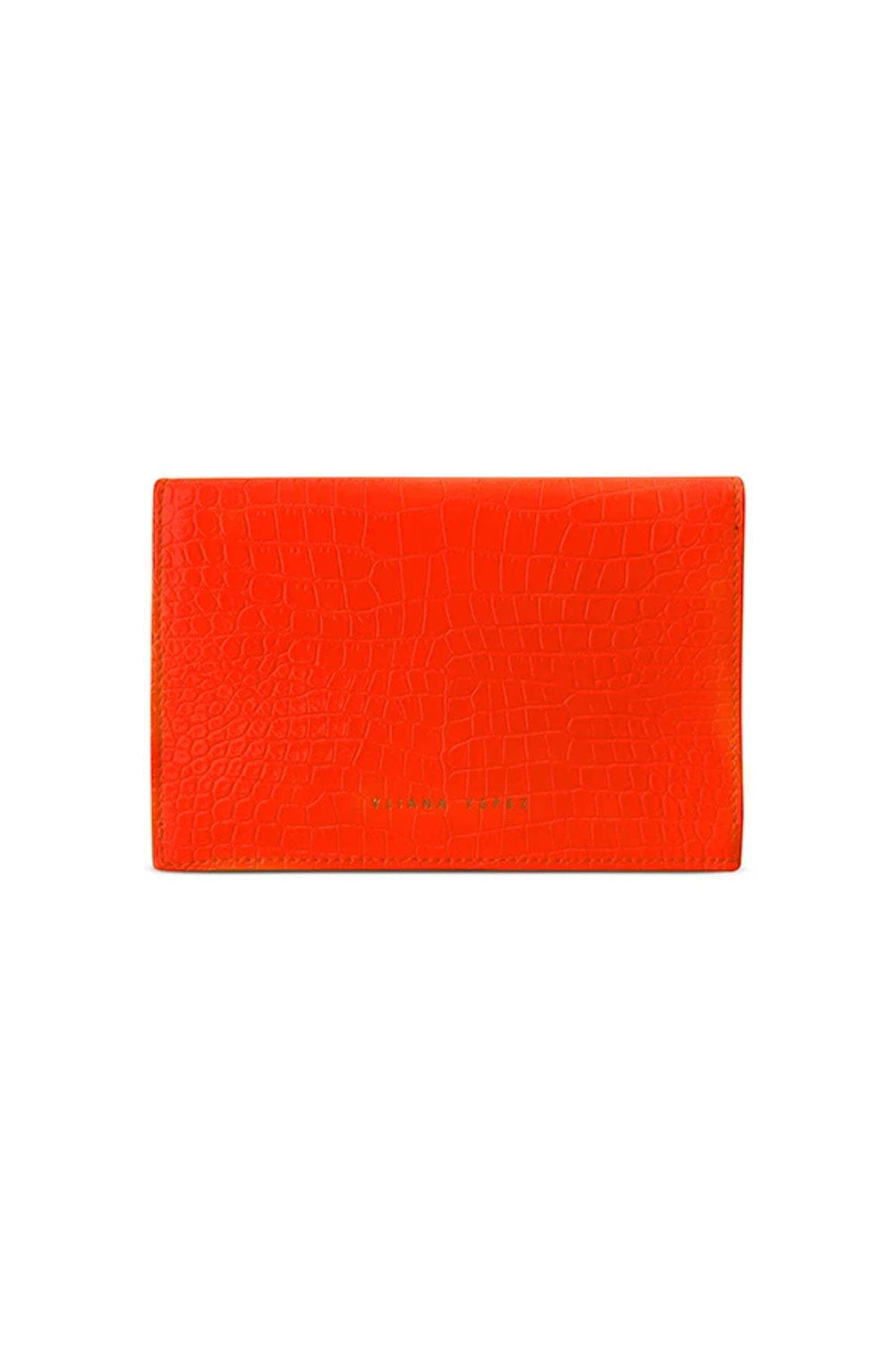 - Yliana Yepez Neon Orange Pouch Croc embossed neon leather Gold hardware Magnetic flap closure Dimensions: 5" H x 7" W x 0.6" gusset Back printed logo Imported. Made in Spain