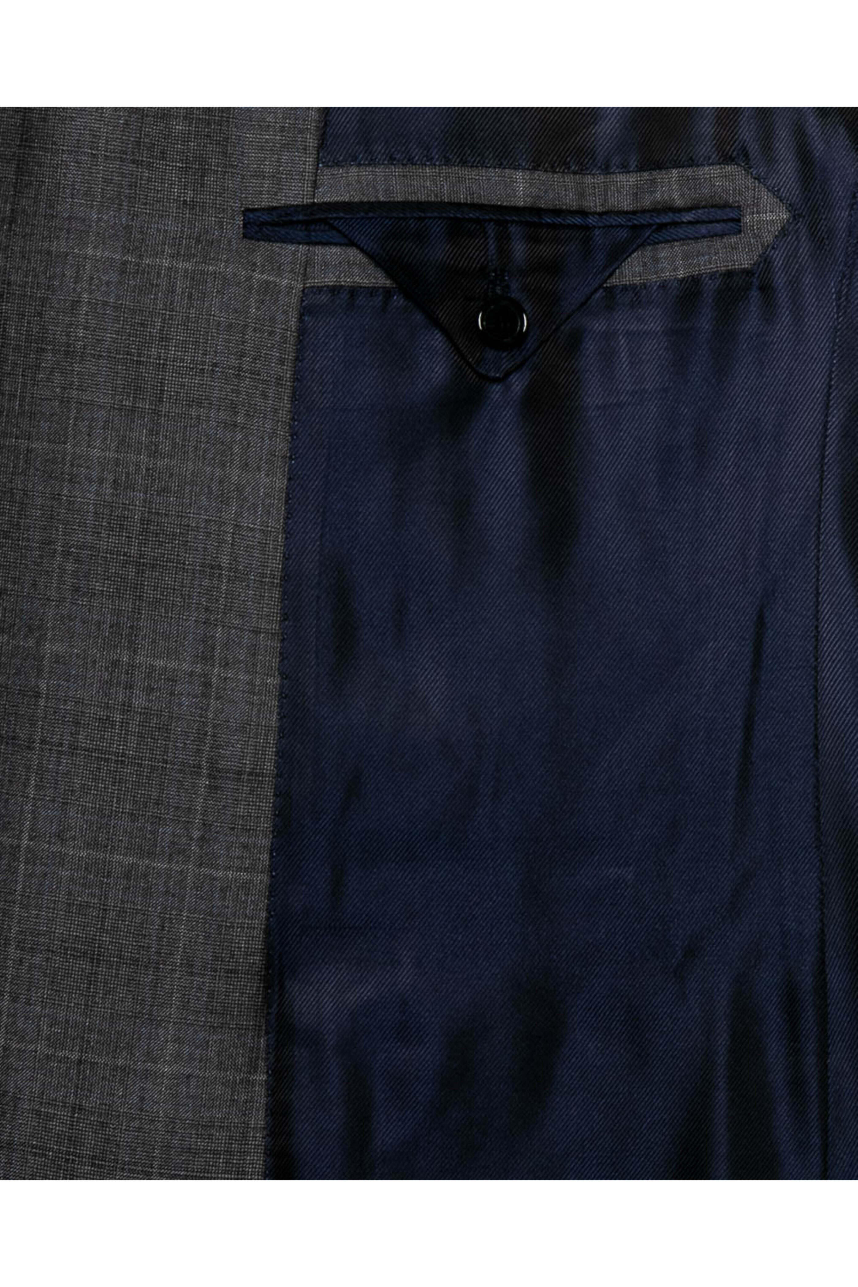 - Cesare Attolini Charcoal Windowpane Suit Two button jacket Notch lapel Pick stitch detailing Front left chest pocket Flap waist pockets Fully lined Double back vents Flat front pant: Zip fly Three button closure Coin pocket Double welt button back pockets 10.5 rise 7.5 hem opening Drop: 7 Super 170s 100% wool Made in Italy