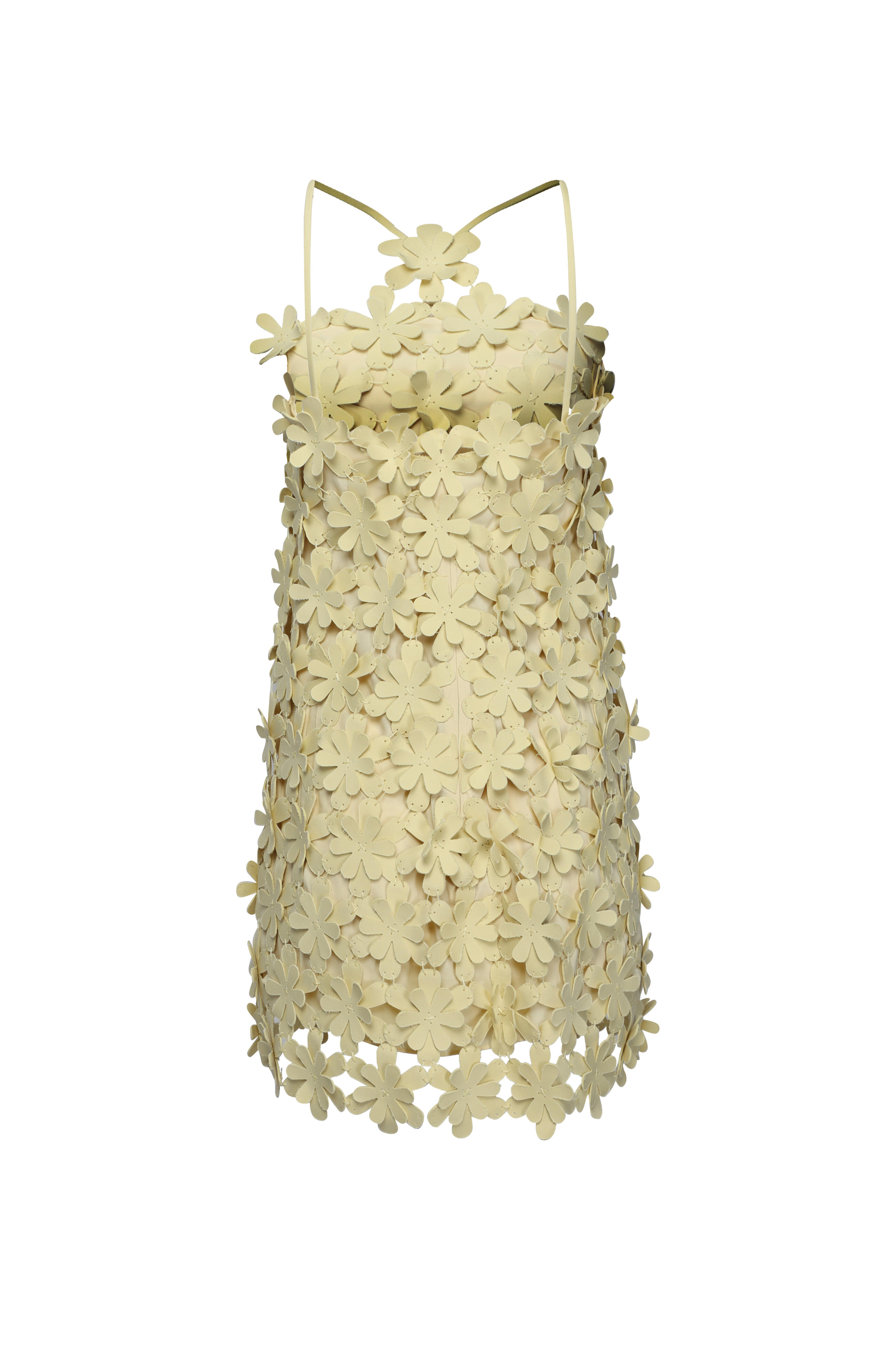 Halter neck. Square back. Concealed back zip closure. Cutout overlay. Imported. Mini length. 76% cotton, 22% tencil, 2% elastane.