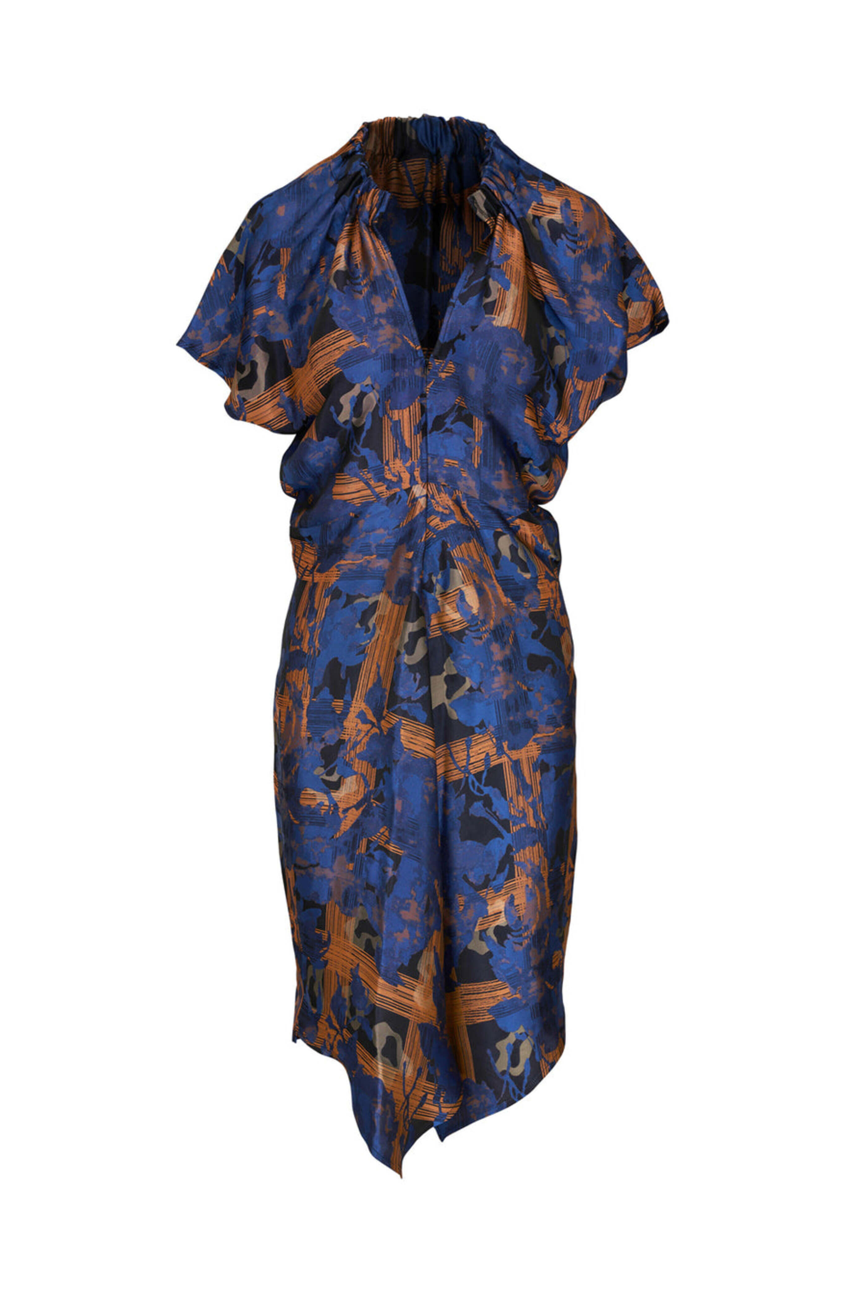 Zero + Maria Cornejo Black Ruched Stella Dress. Ruched collar. V neck. Short dolman sleeves. Ruched at center front; concealed zip closure. Knee to midi length. Asymmetrical hem. Made in USA. 59% viscose, 41% acetate.