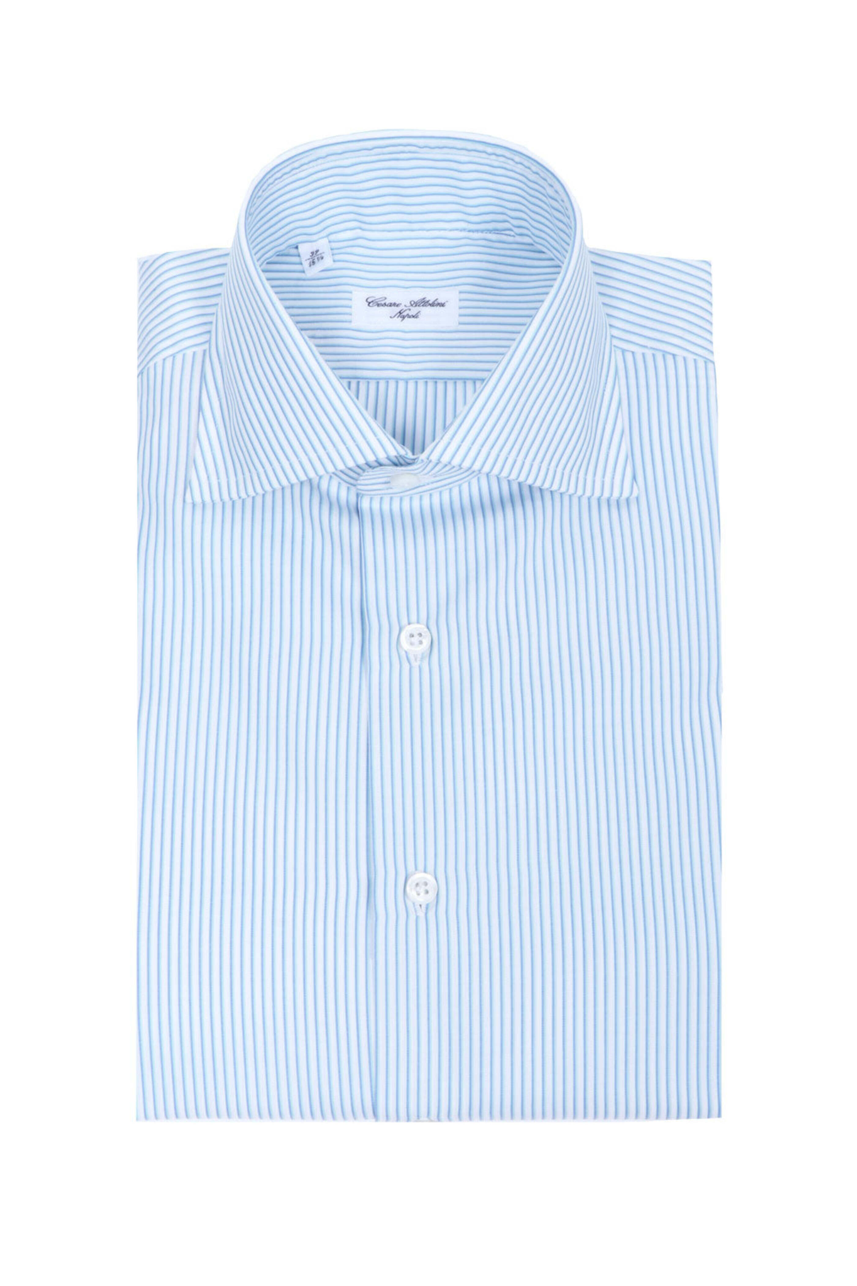 Cesare Attolini Aqua and Blue Mini Stripe Dress Shirt. Spread collar. Button down front closure. Long sleeves. Single button cuffs. Made in Italy . 100% Cotton.