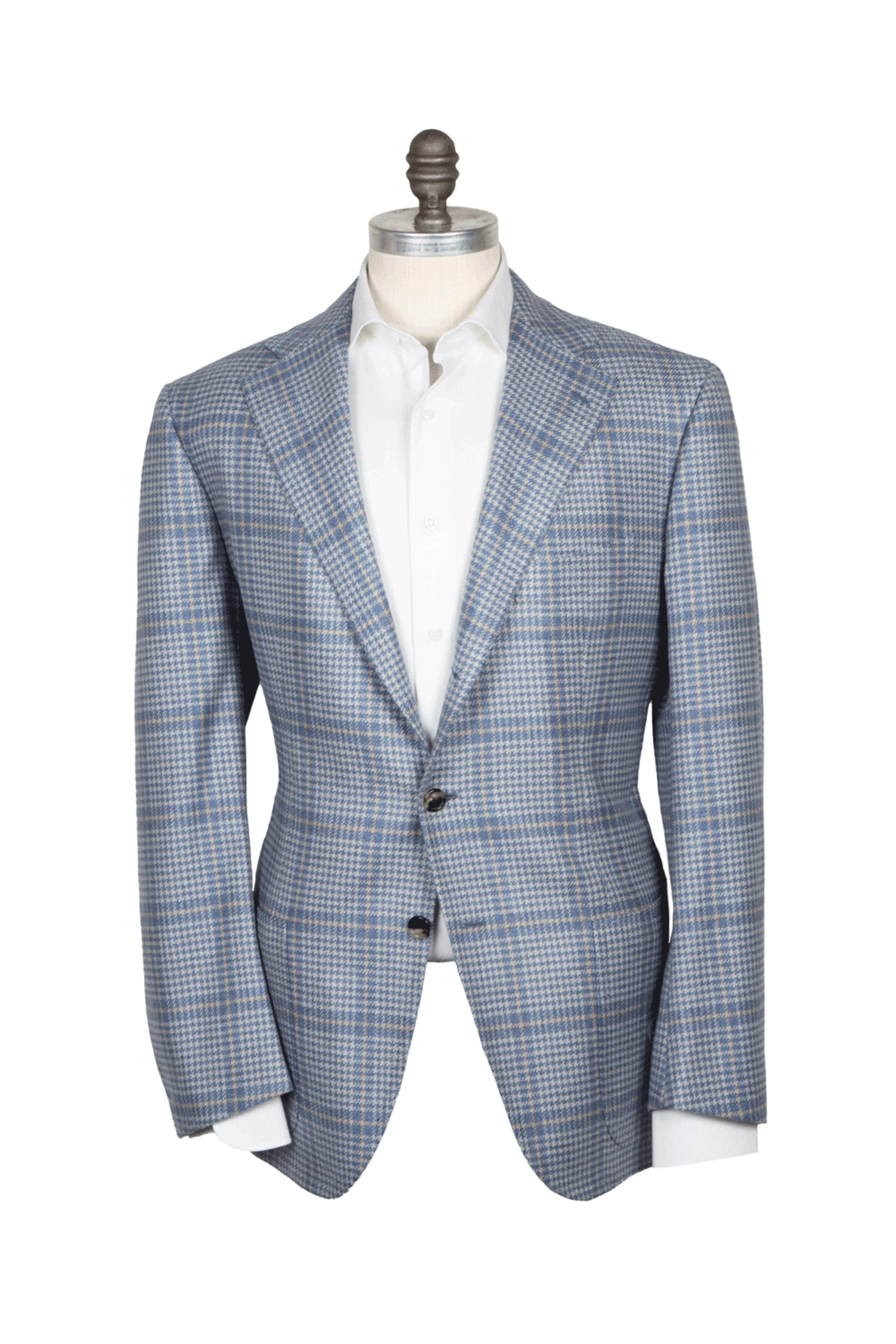 Cesare Attolini Light Blue Glen Plaid Sportcoat. Notch lapels . Left lapel buttonhole . Three button jacket . Front left welt chest pocket . Waist patch pockets . Unfinished buttonholes . Double back vents . Drop 7 . Half lined . Cupro lining. Made in Italy . 100% Cashmere .
