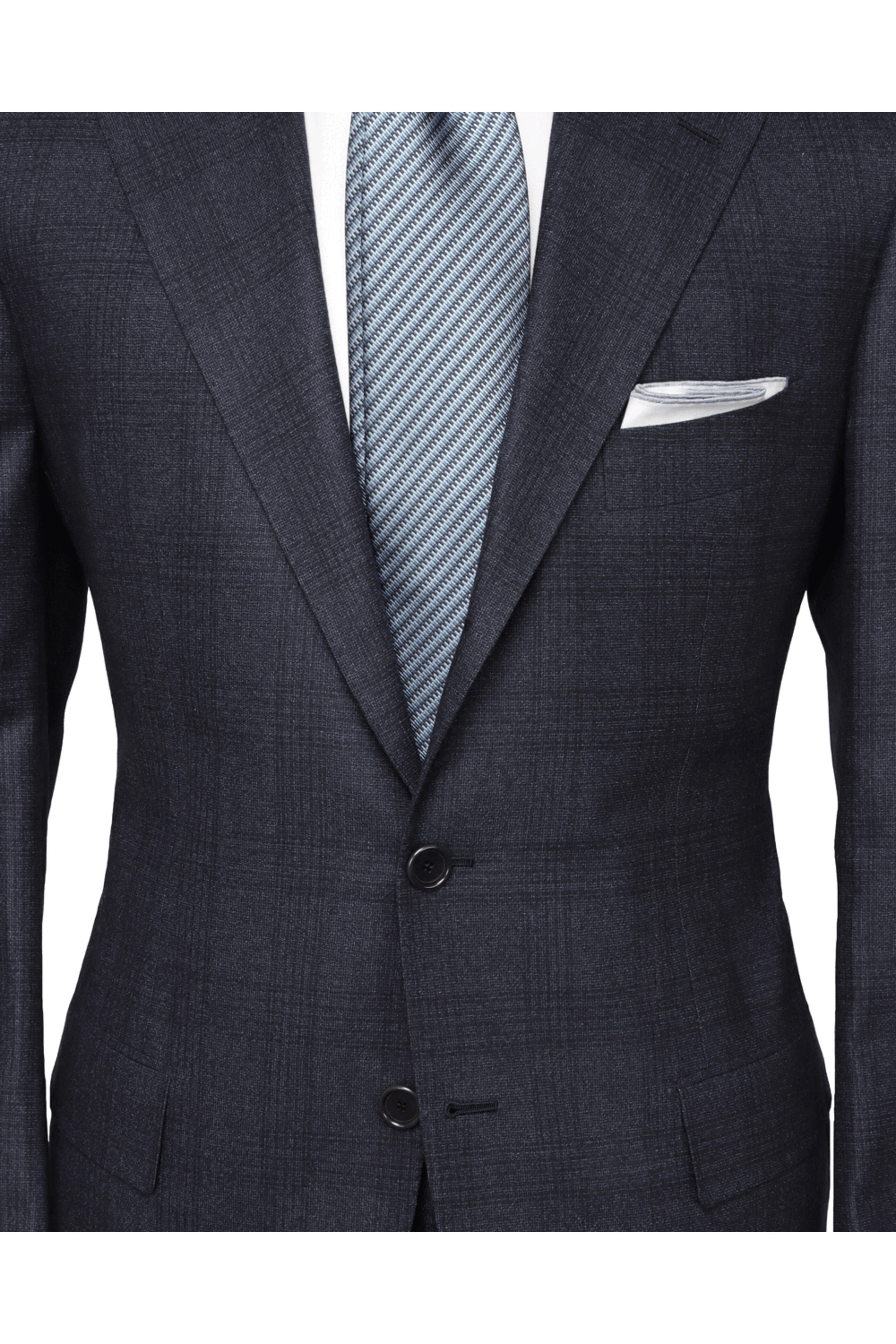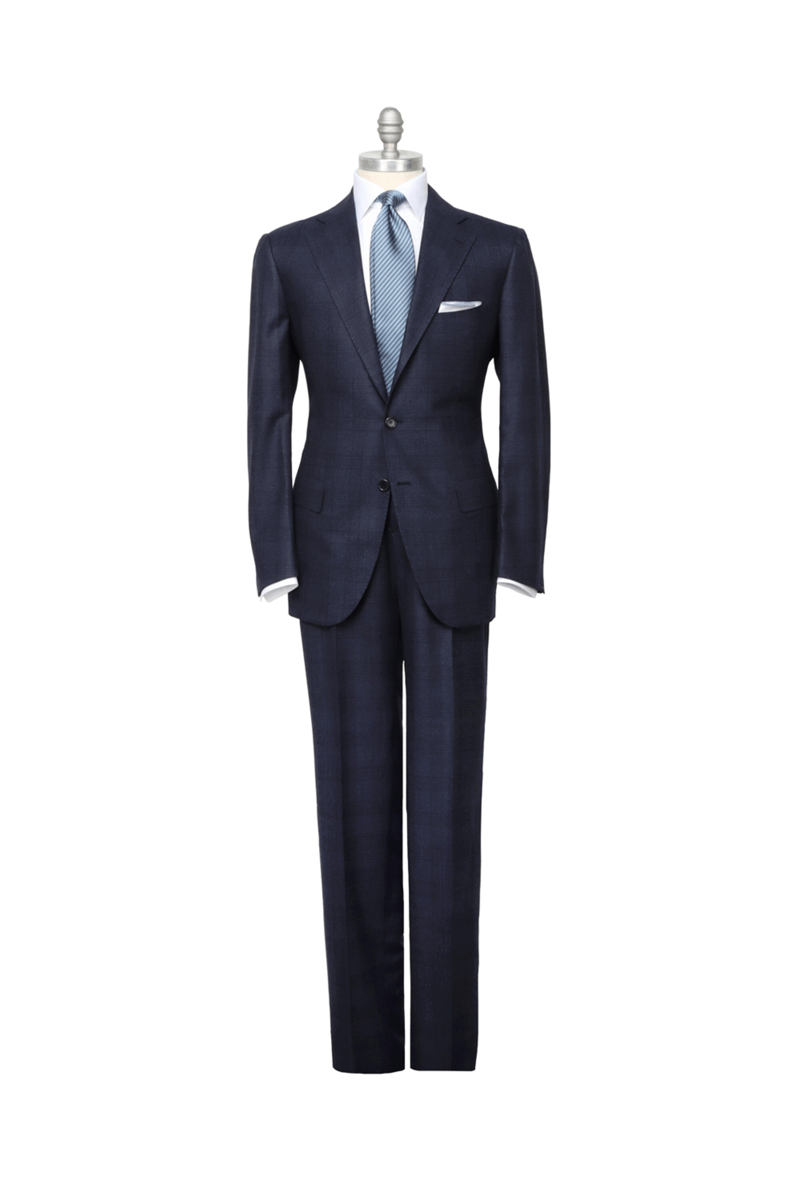 Cesare Attolini Navy Tonal Plaid Suit. Notch lapels. Left lapel buttonhole. Button front closure. Left chest welt pocket. Waist flap pockets. Double-vented back. Unfinished buttonholes. Drop 7. Fully-lined. Cupo lining. Trousers: Regular rise. Pleated front. Zip fly. Button and hook closure. Belt loops. Back welt pockets with button. Full length. Unfinished hem. Made in Italy . 100% wool.