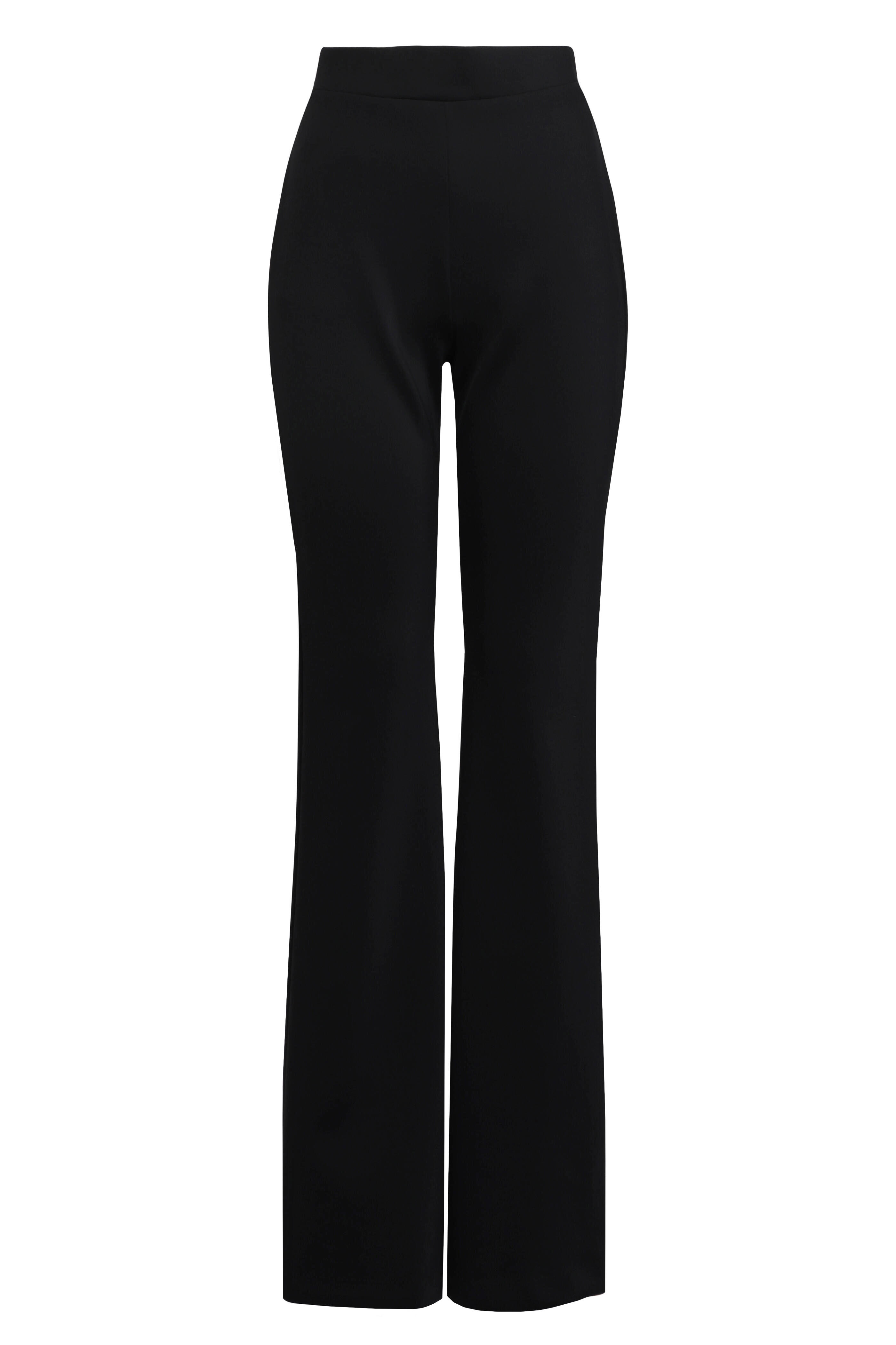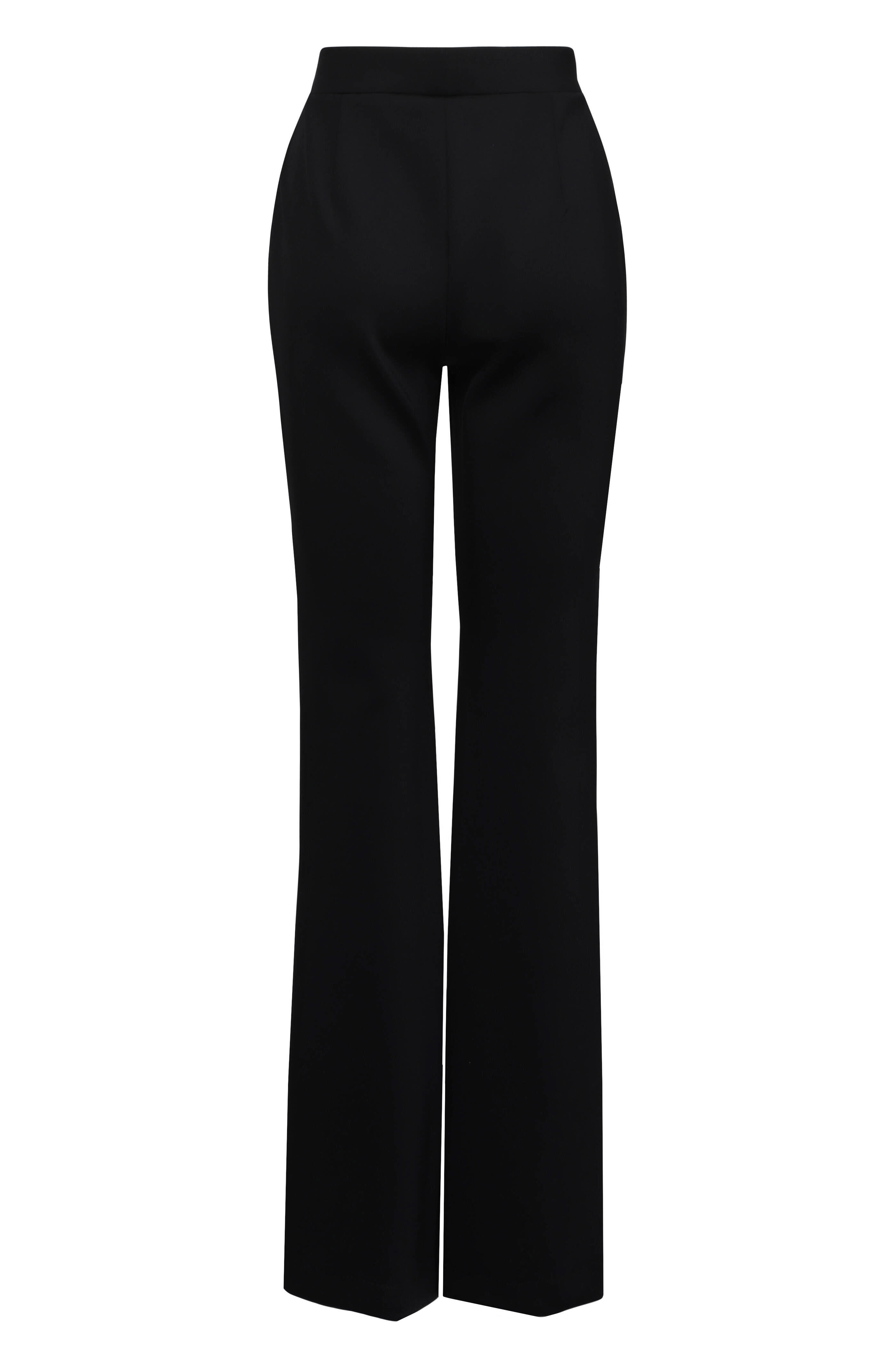 High rise. Flat waist. Concealed side zip closure. Straight silhouette. Flare hem. Made in Canada. Full length. 86% polyamide, 14% elastane. Dry clean.