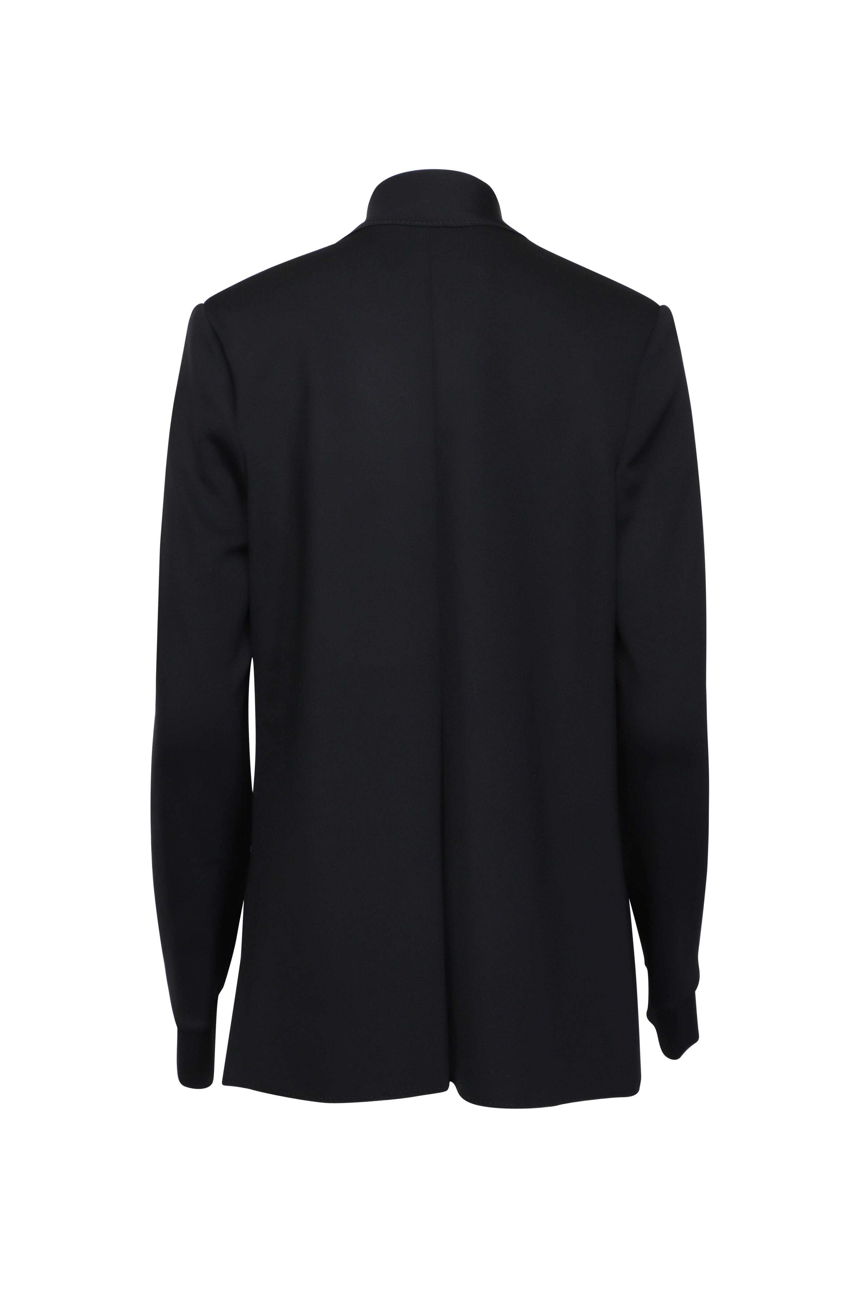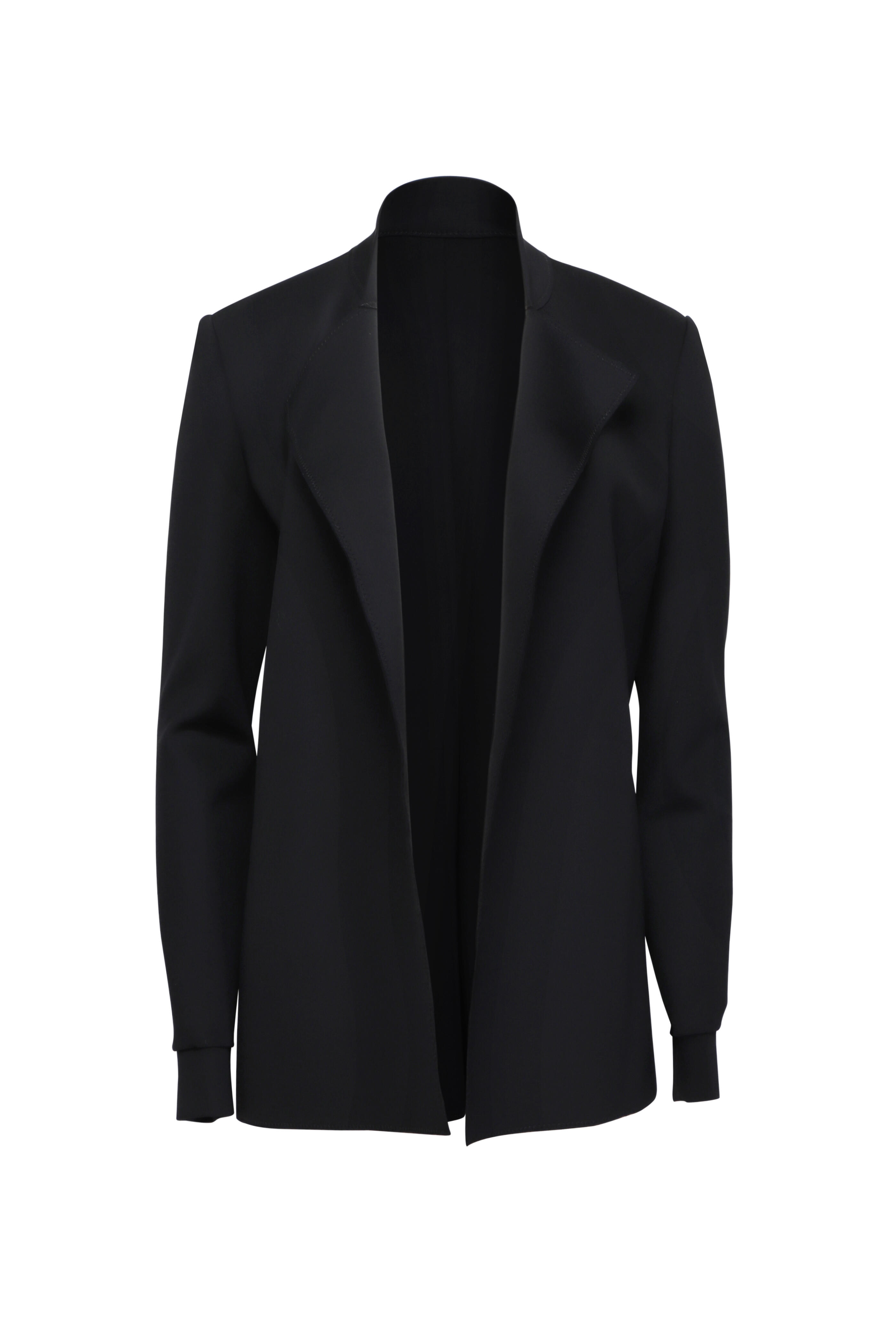 Foldover lapel. Long sleeves; split cuffs. Open front. Fine scuba fabrication. Made in Canada. Bust 81-83 cm (US 4/ S). Waist 63-65 cm (US 4/ S). Hip 92-94 cm (US 4/ S). 86% polyamide, 14% elastane. Dry clean.