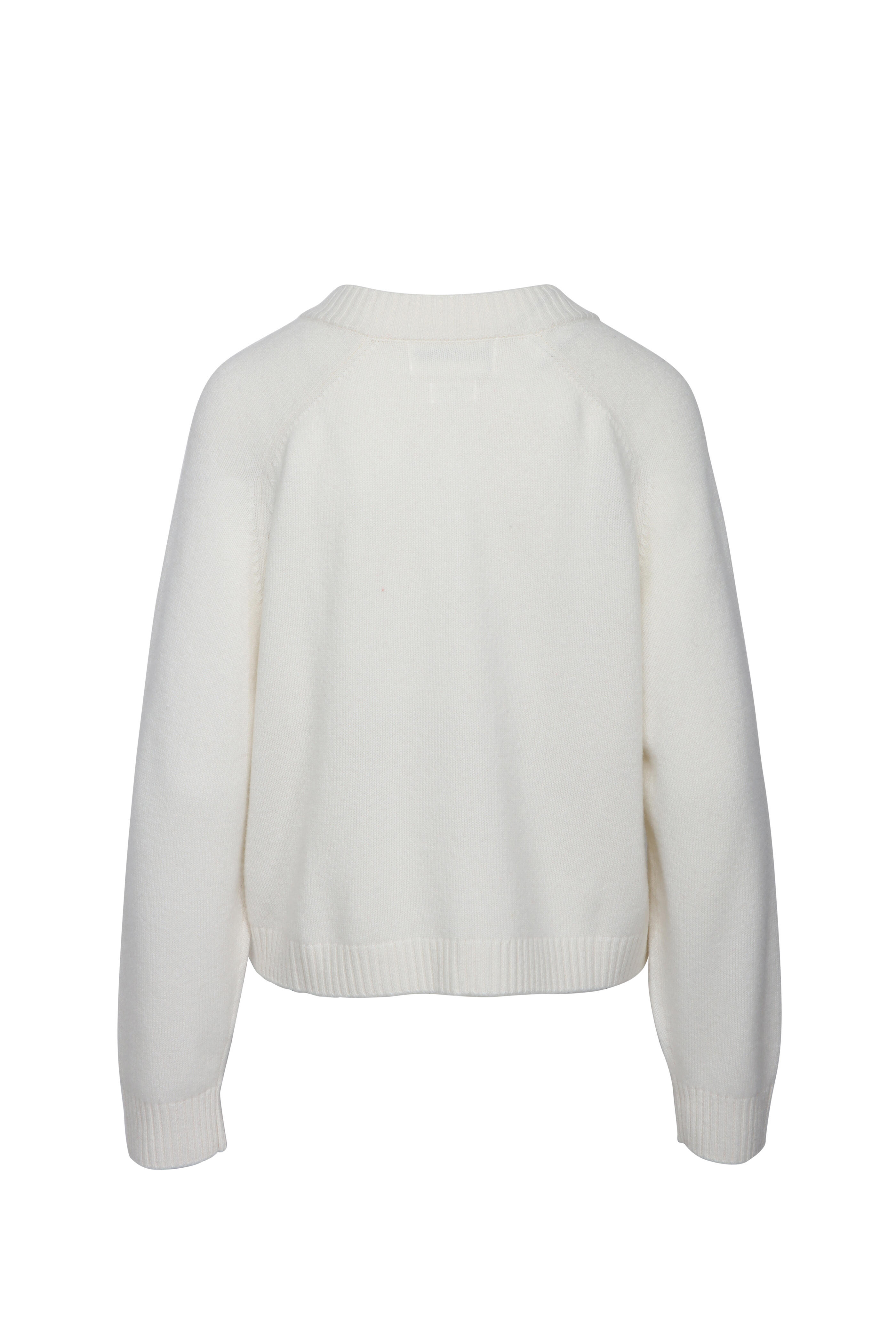 V neck. Long raglan sleeves. Relaxed fit. Ribbed neck, cuffs, and hem. Imported. 73% merino wool, 27% cashmere. Handwash.