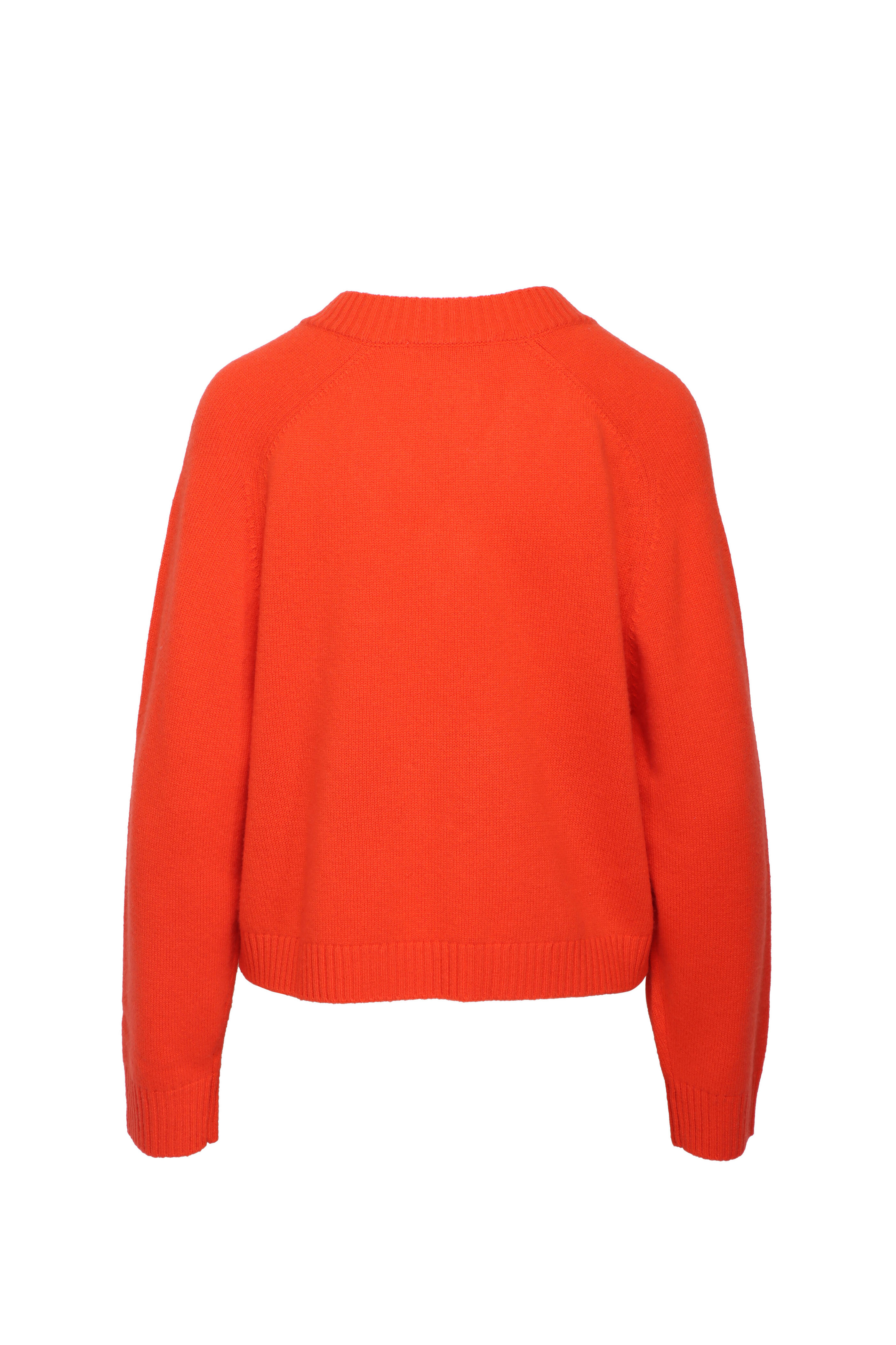 V neck. Long raglan sleeves. Relaxed fit. Ribbed neck, cuffs, and hem. Imported. 73% merino wool, 27% cashmere. Handwash.