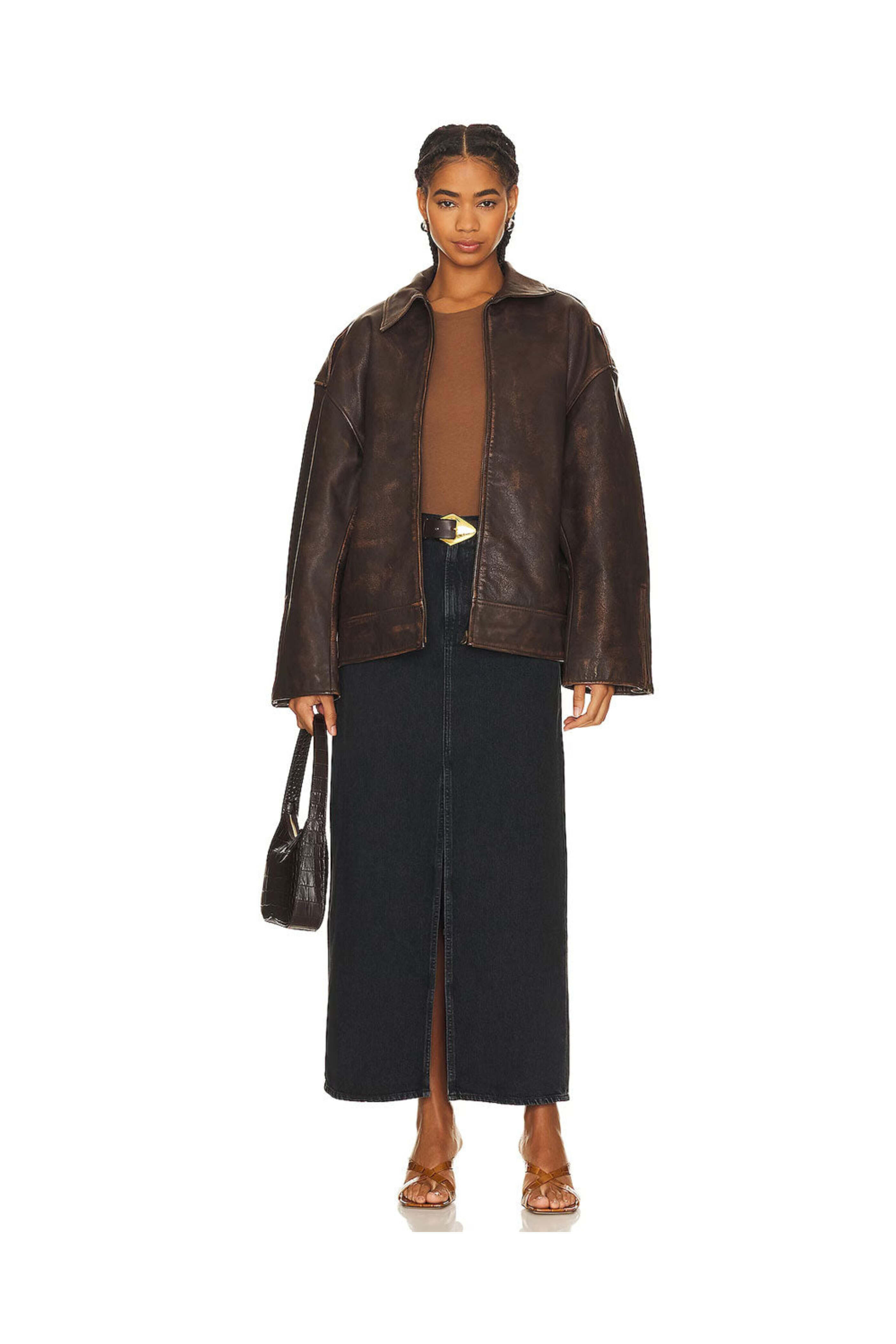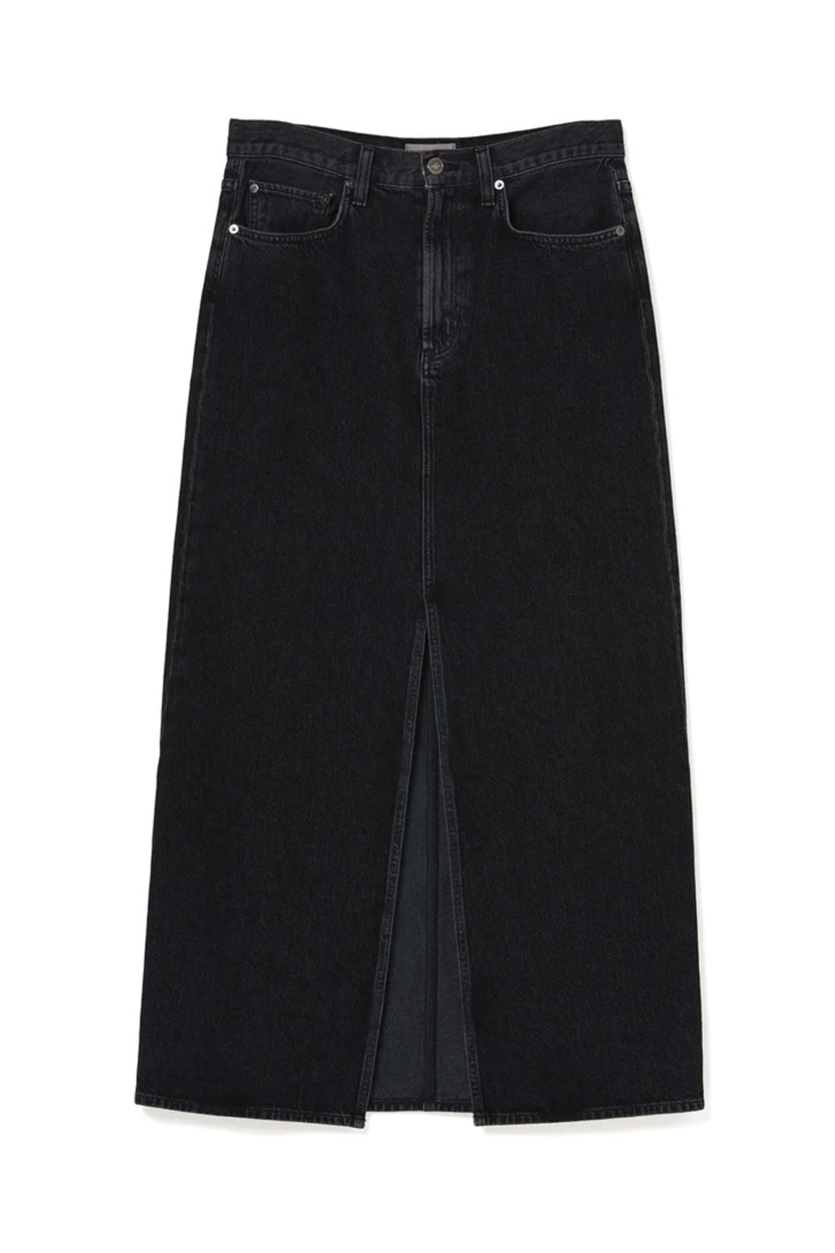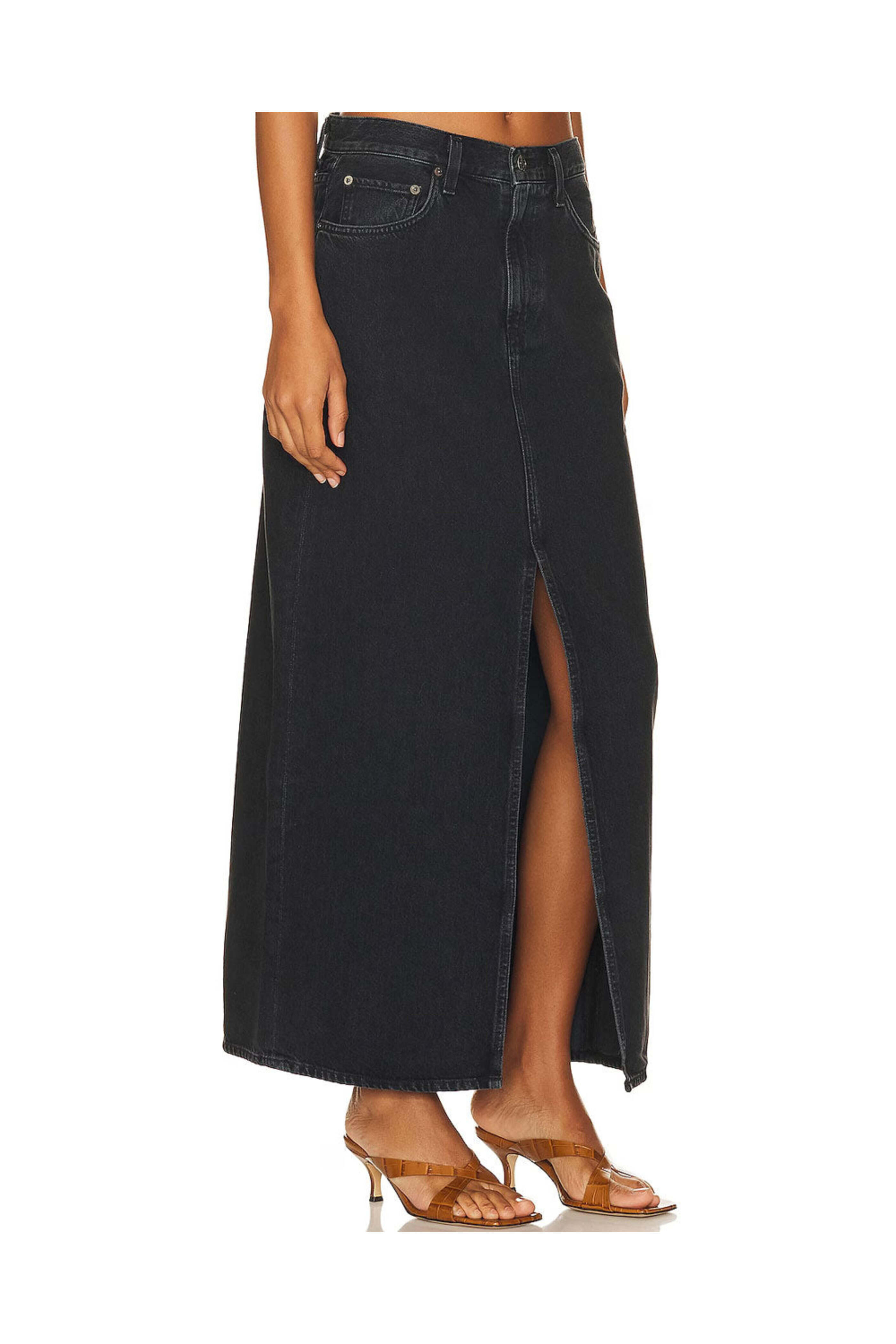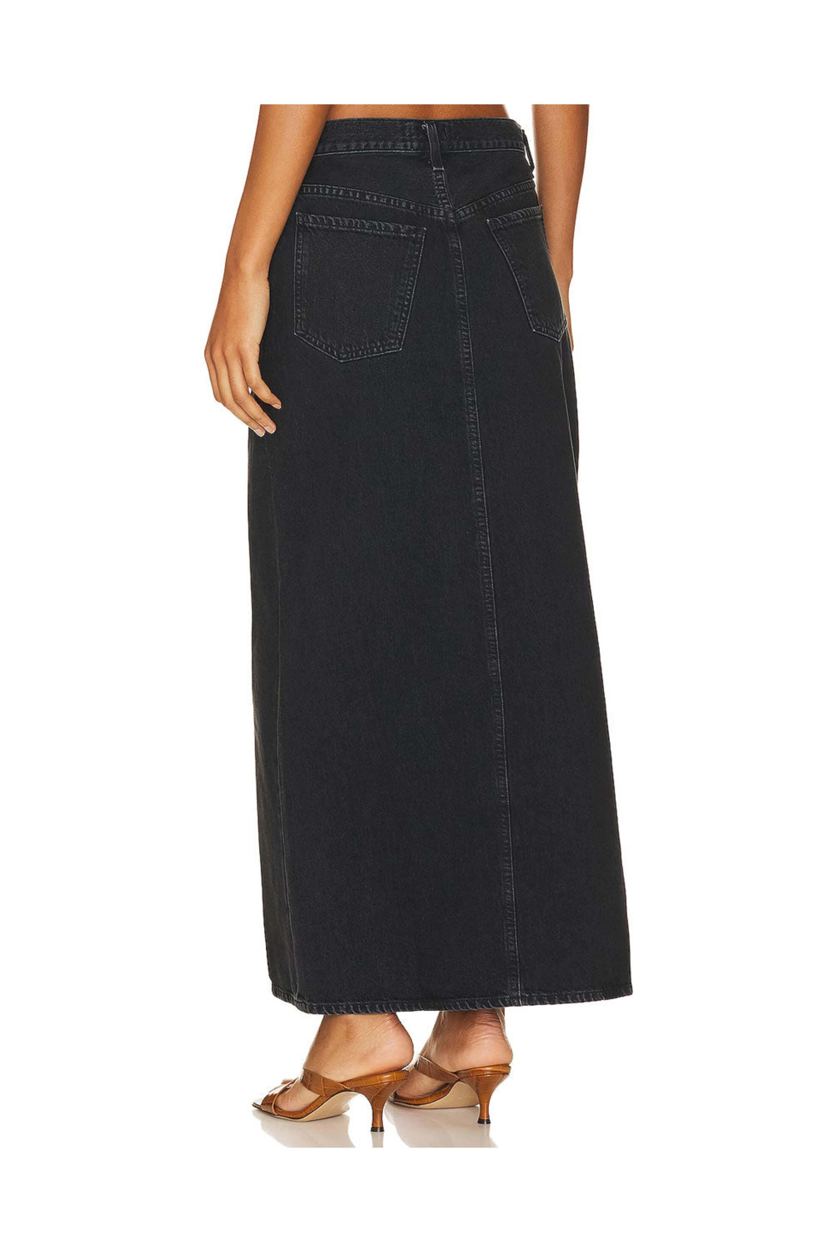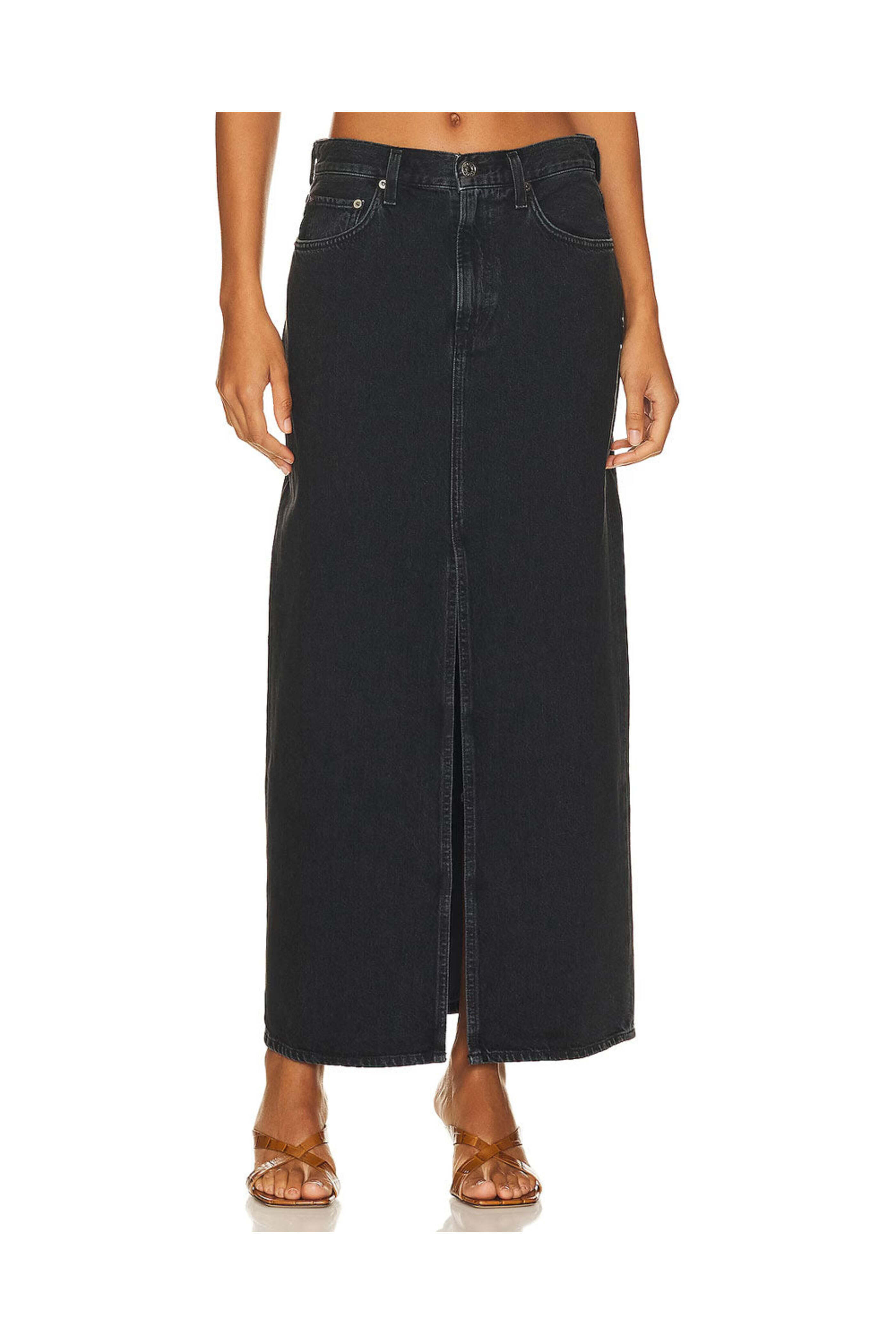 Agolde Spider Leif Skirt. Mid waist. Button closure; zip fly. Belt loops. Five pocket style. Maxi length. Slit at the front. Relaxed fit. Made in the USA. 80% cotton, 20% recycled cotton.