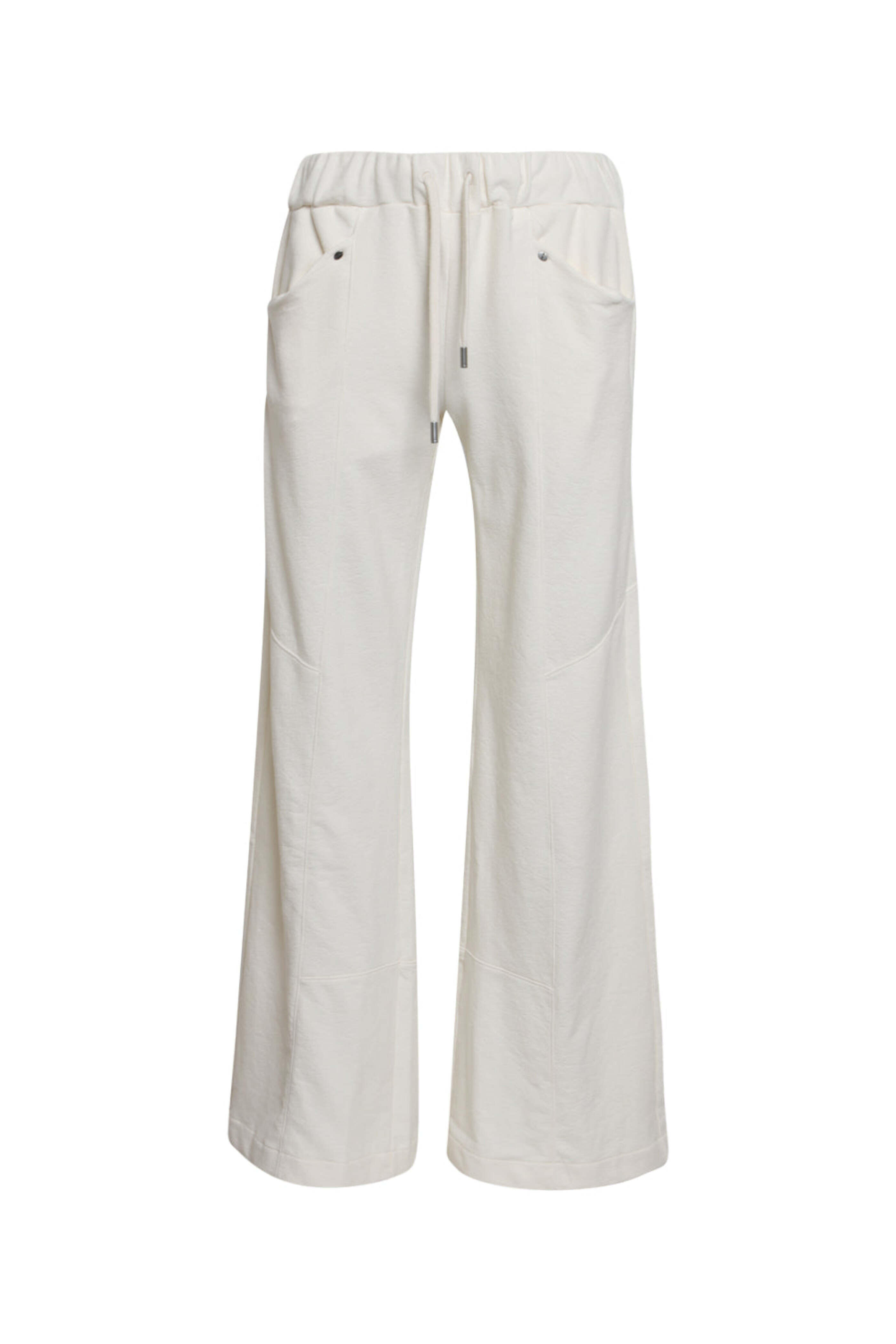 TWP Ivory Saturday Night Terry Pant. Elastic waist. Drawstring closure. Side slip pockets. Full length. Wide leg. 69% cotton/18% lyocell/12% hemp.